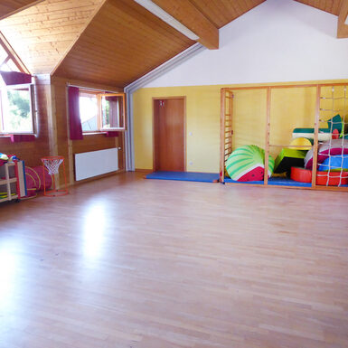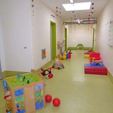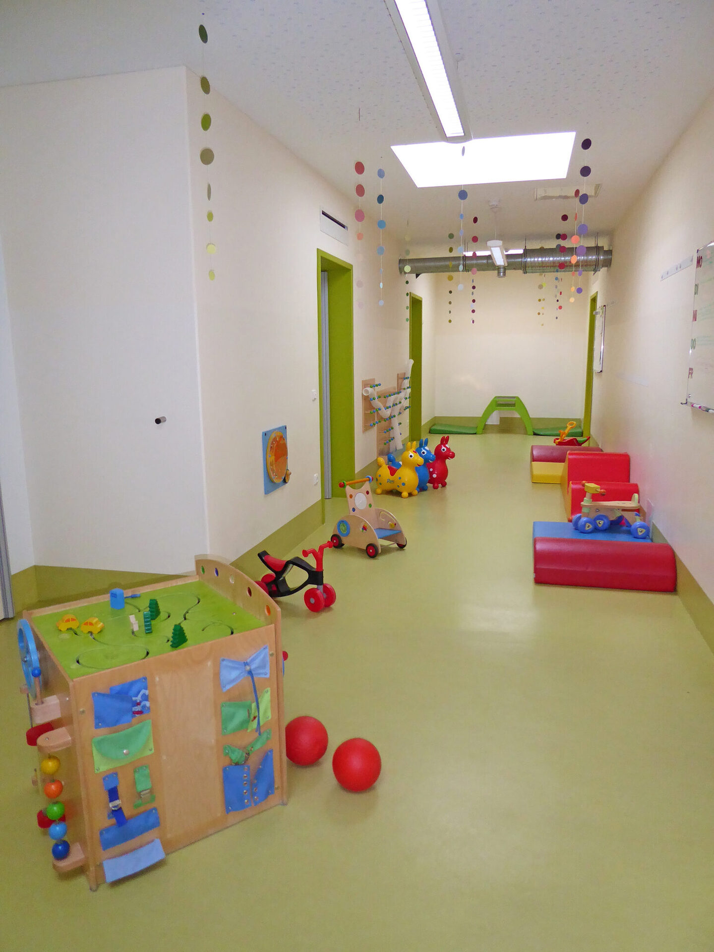 einen großen Flur, der als Bewegungsbaustelle und BobbyCar-Bahn genutzt wird