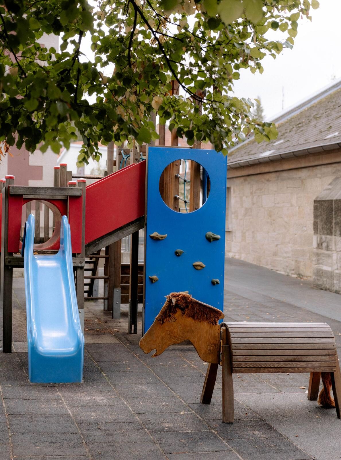 - Hof für Ballspiele mit Kletterhaus und Sandkasten