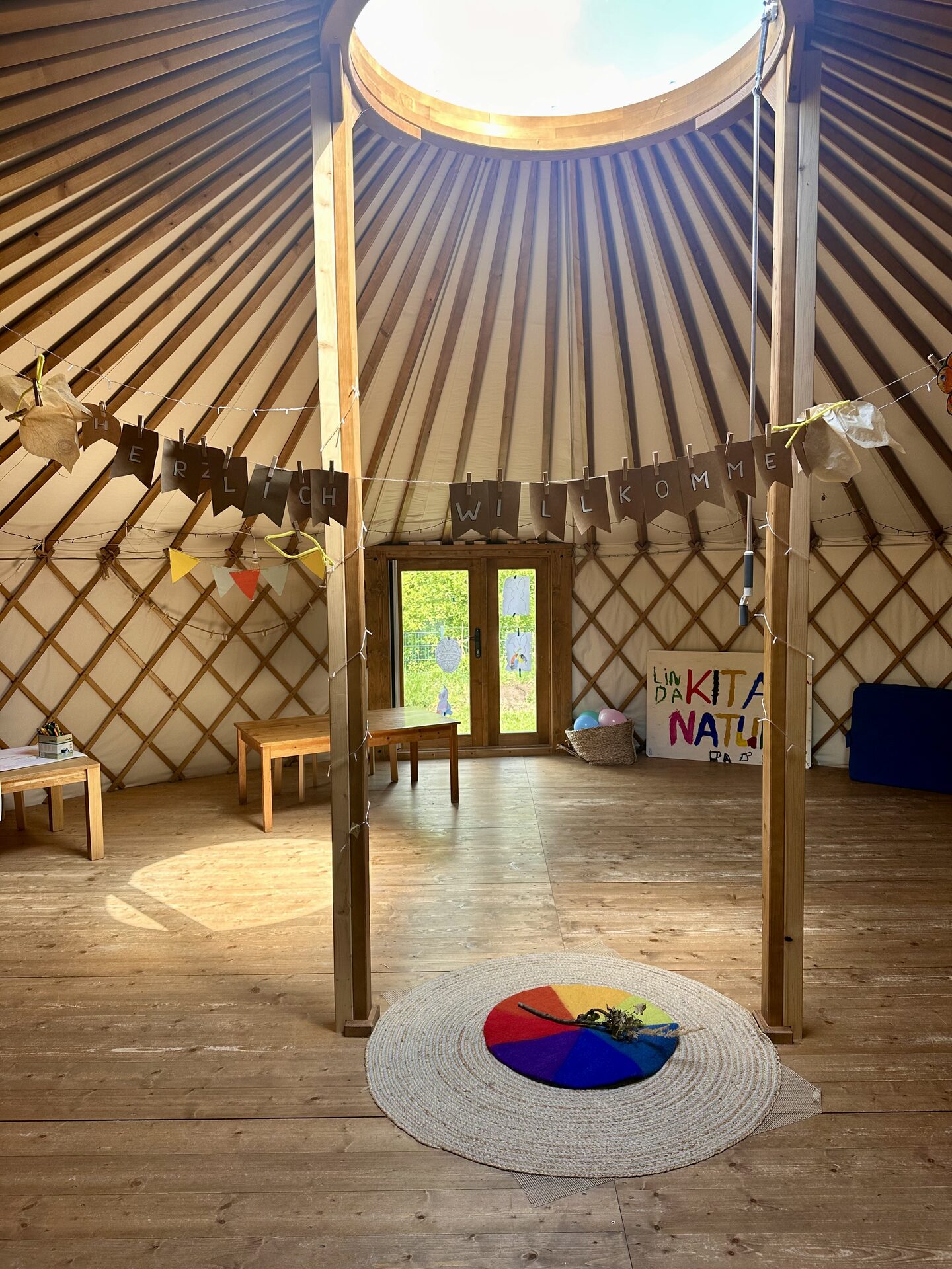 - Dies ist unsere Jurte. Sie dient den Kindern als Mehrzweckraum. Die thematische Gestaltung und Funktion ändert sich regelmäßig. Aktuell nutzen wir die Jurte als Atelier oder Bewegungsraum.