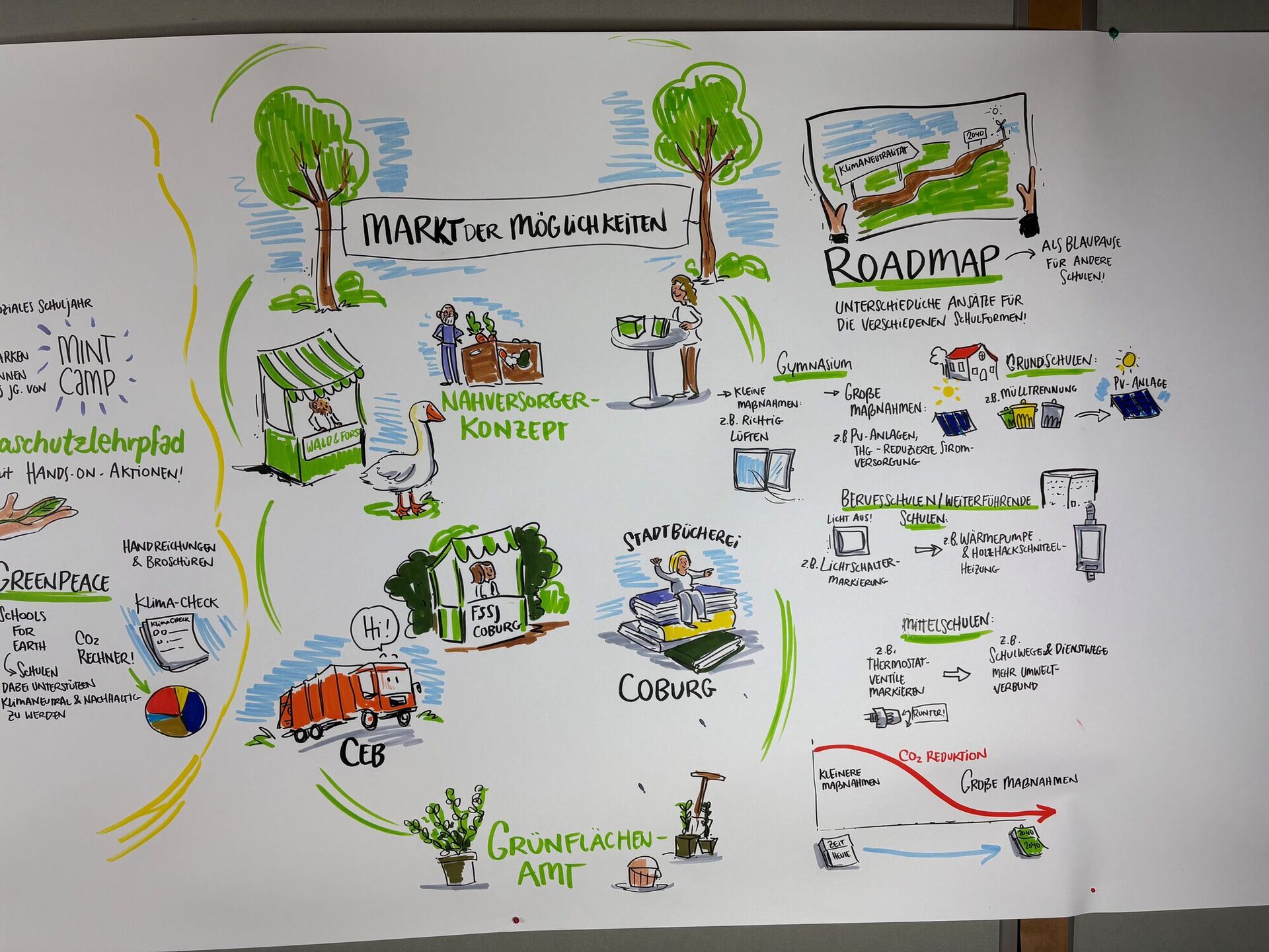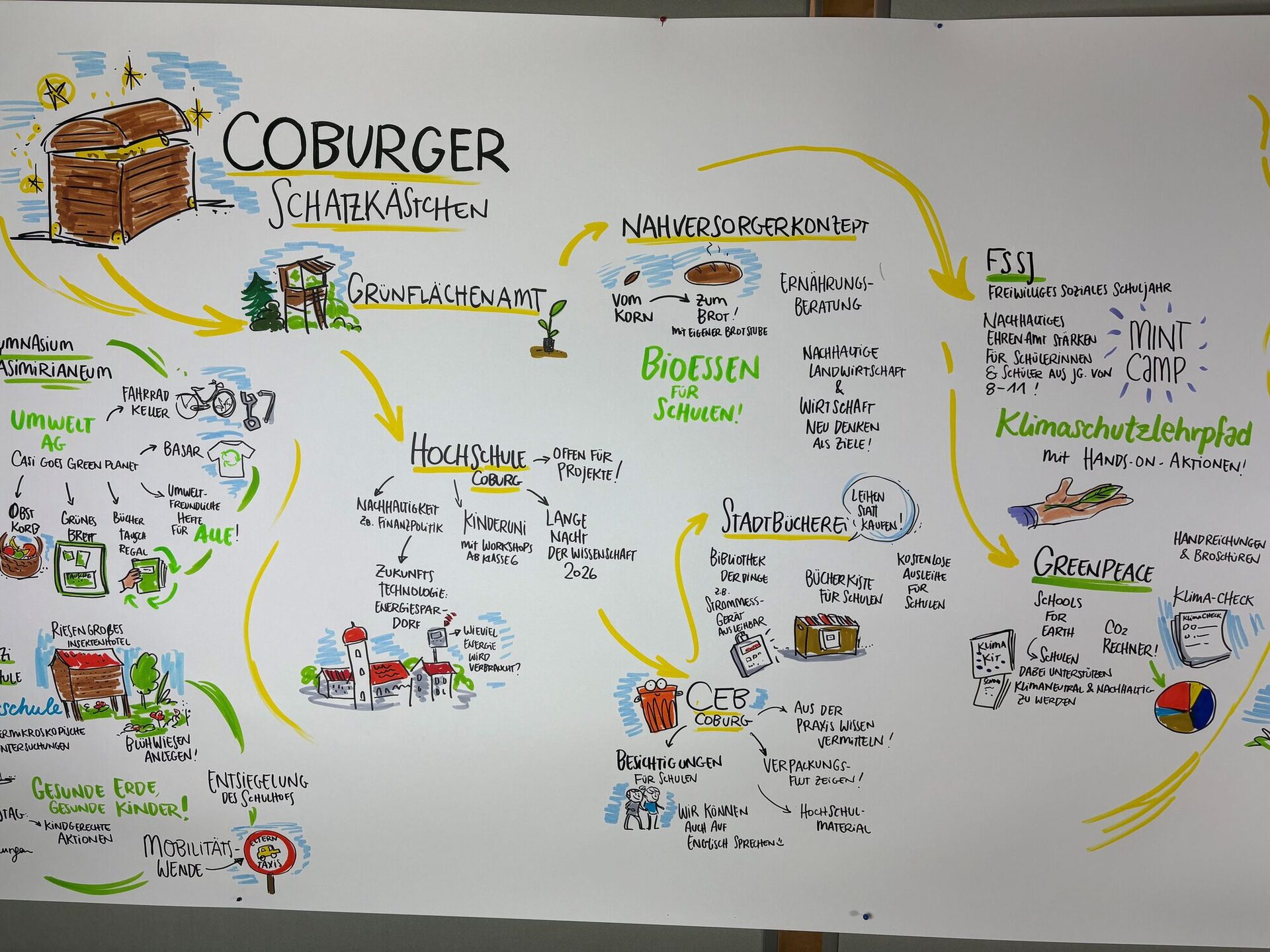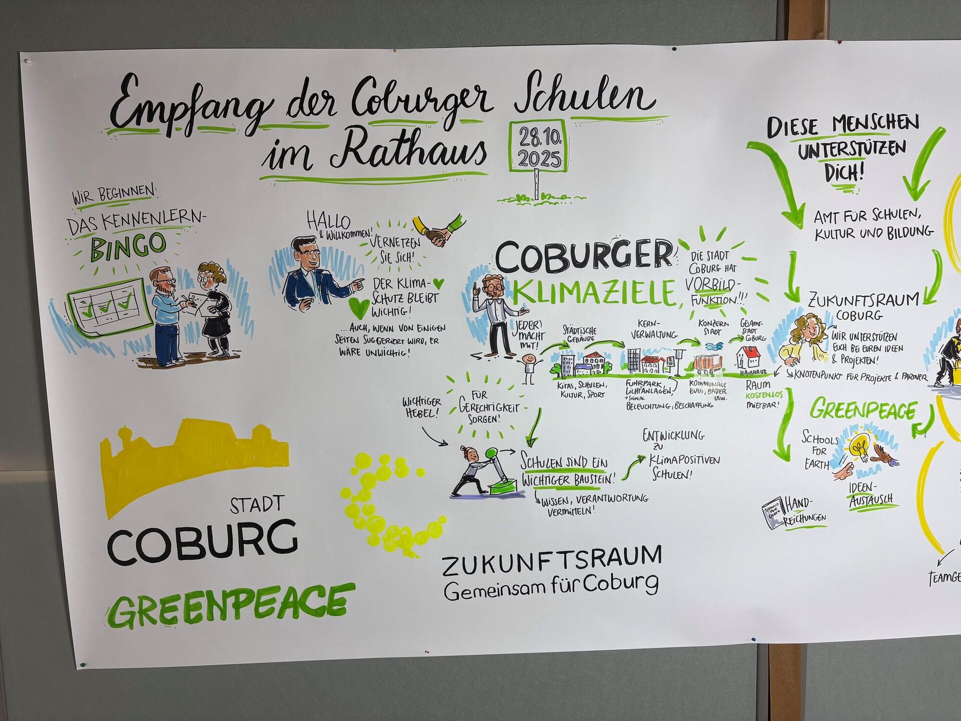 schön, dass Sie und ihr hier vorbeischaut, um die Ereignisse und Ergebnisse des OB-Empfang der Coburger Schulen am 28.10.2025 im Rathaus nachzulesen – vom „gezeichneten Protokoll“ (Graphic Recording) bis zu den Coburger Institutionen, die Sie und euch auf dem Weg zu Klimaneutralität und Nachhaltigkeit begleiten.