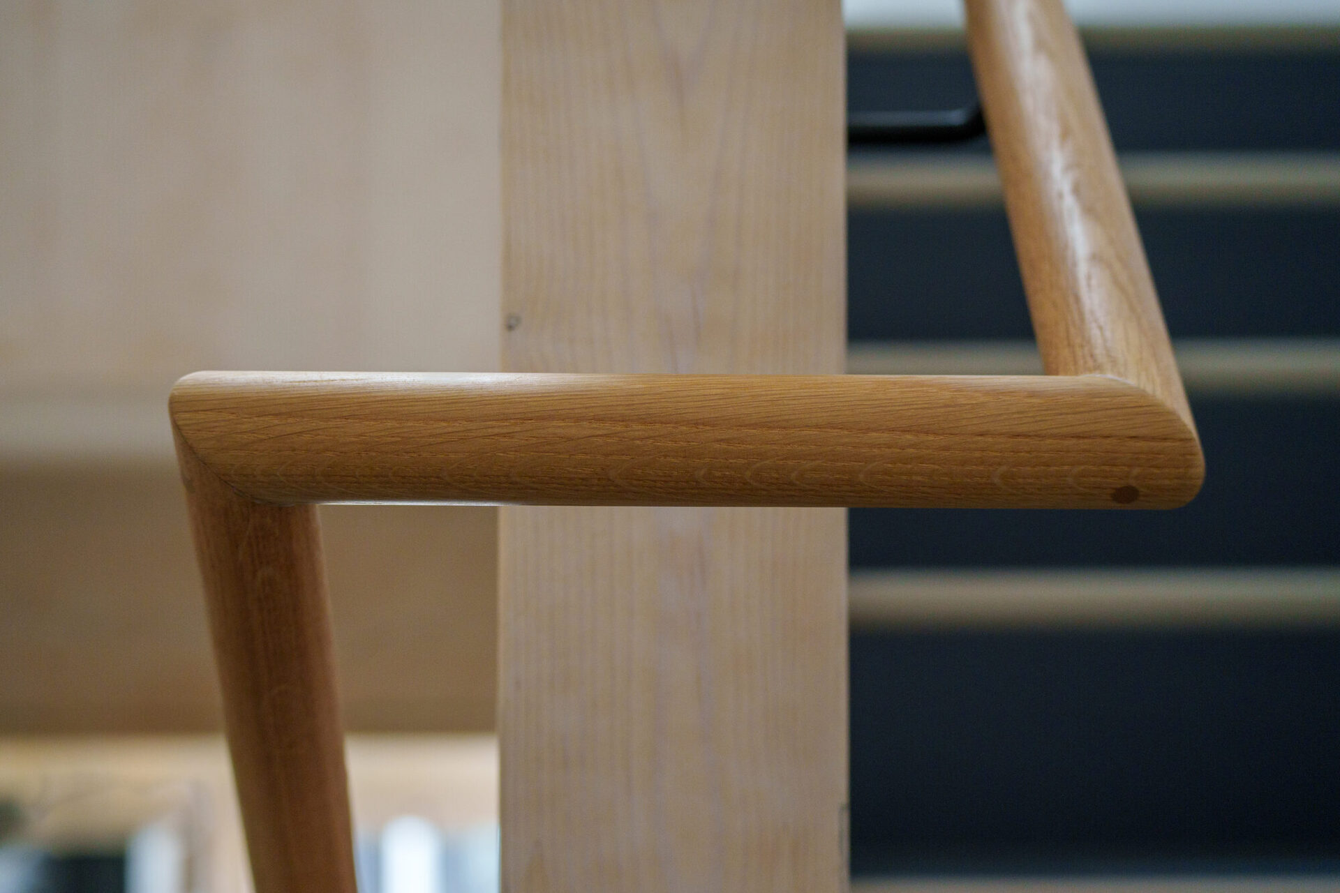 Wenn man von der Bühne aus durch die Tür in die Nebengebäude und dann immer weiter geradeaus geht, landet man am Ende an dieser Treppe. Ins hinterste Nebengebäude ist die Wirtschaftsförderung der Stadt Coburg eingezogen. Auch hier beherrscht Holz die Optik.
