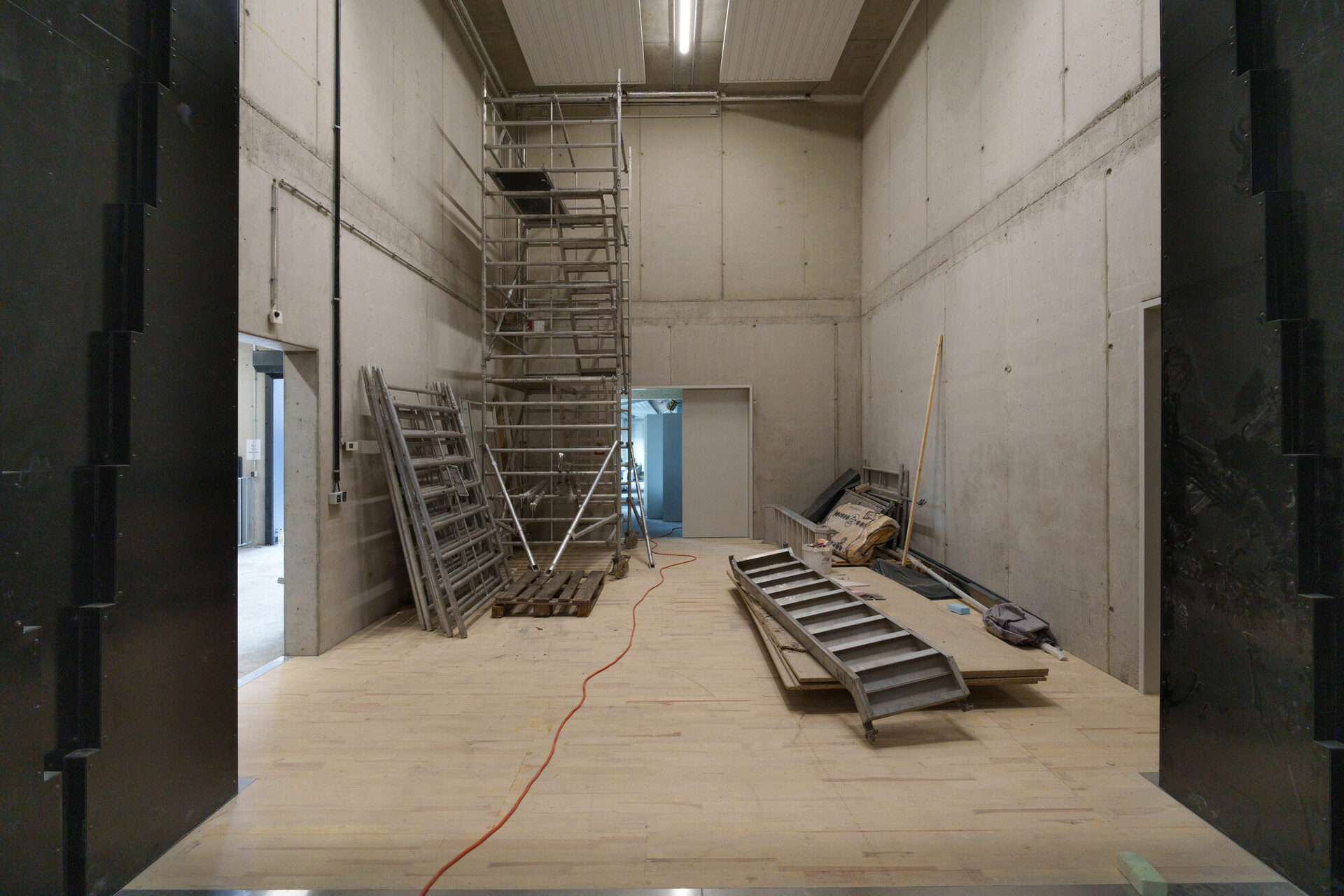 Wenn große Aufbauten von der Bühne herunter müssen, können sie hier abgestellt werden. Viel Platz ist hier nicht, auch, weil die Tür nach hinten nicht verstellt werden kann.