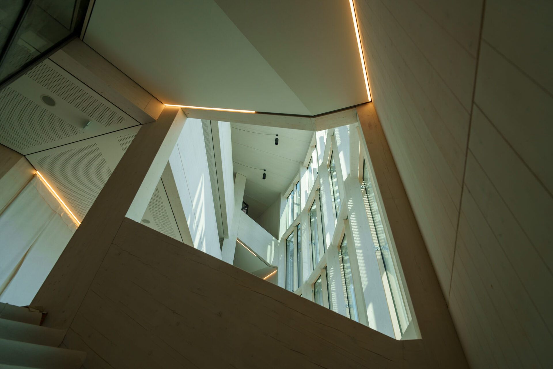 Die großen Fenster bringen tagsüber viel Licht ins Treppenhaus. Zusätzlich sind LEDs an den Kanten versteckt, die immer für ausreichend Licht sorgen. Die Lichttemperatur betont die Holzoptik.