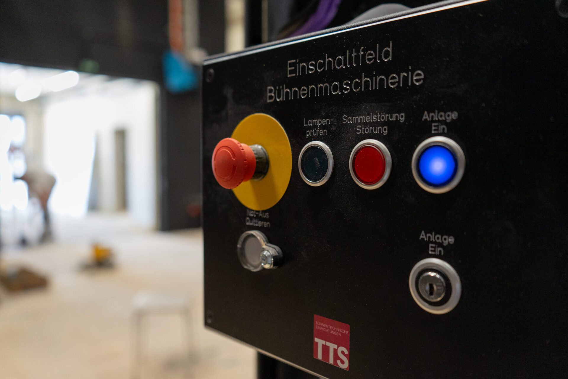 Die Bühnentechnik wird zentral über ein bewegliches Pult gesteuert. Aber wenn hier niemand anschaltet, bleibt es dunkel. Am Ende des Arbeitstages wird so auch sicher gestellt, dass nichts anbleibt.