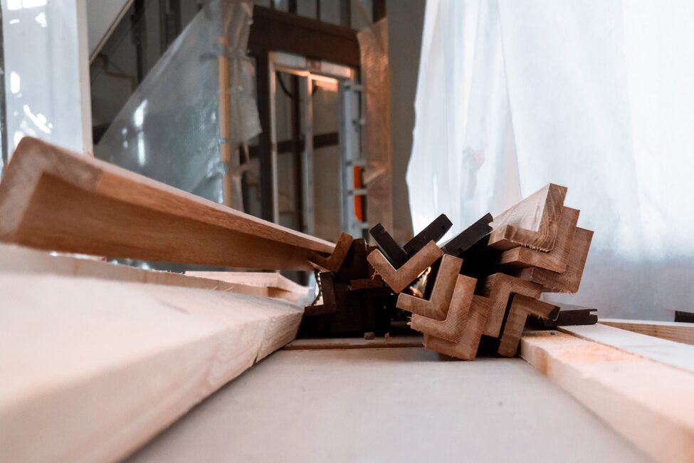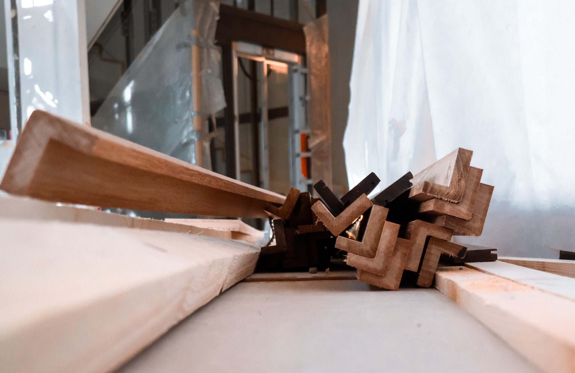 Das Globe Coburg ist ein eleganter Holzbau. Da ist es selbstverständlich, dass im ganzen Gebäude Parkett verlegt wird. Die Leisten auf dem Bild werden ganz zum Schluss verlegt.