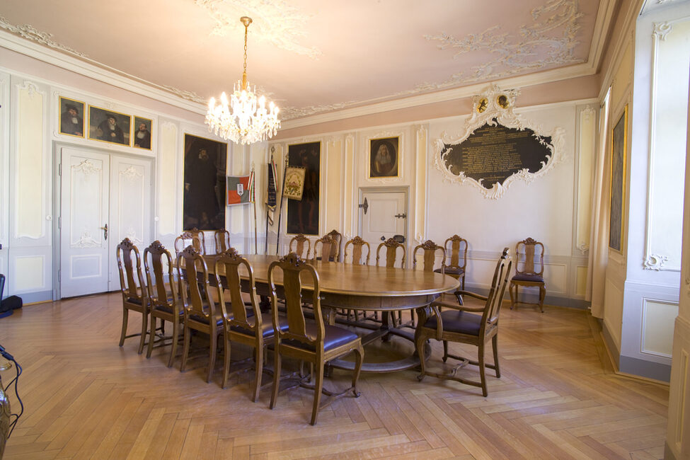 In der Mitte des 18. Jahrhunderts wurde auch diese neu gestaltet; die schöne Stuckdecke und die lateinische Bauinschrift mit den beiden Stadtwappen Löwe und Mohrenkopf zeugen davon.