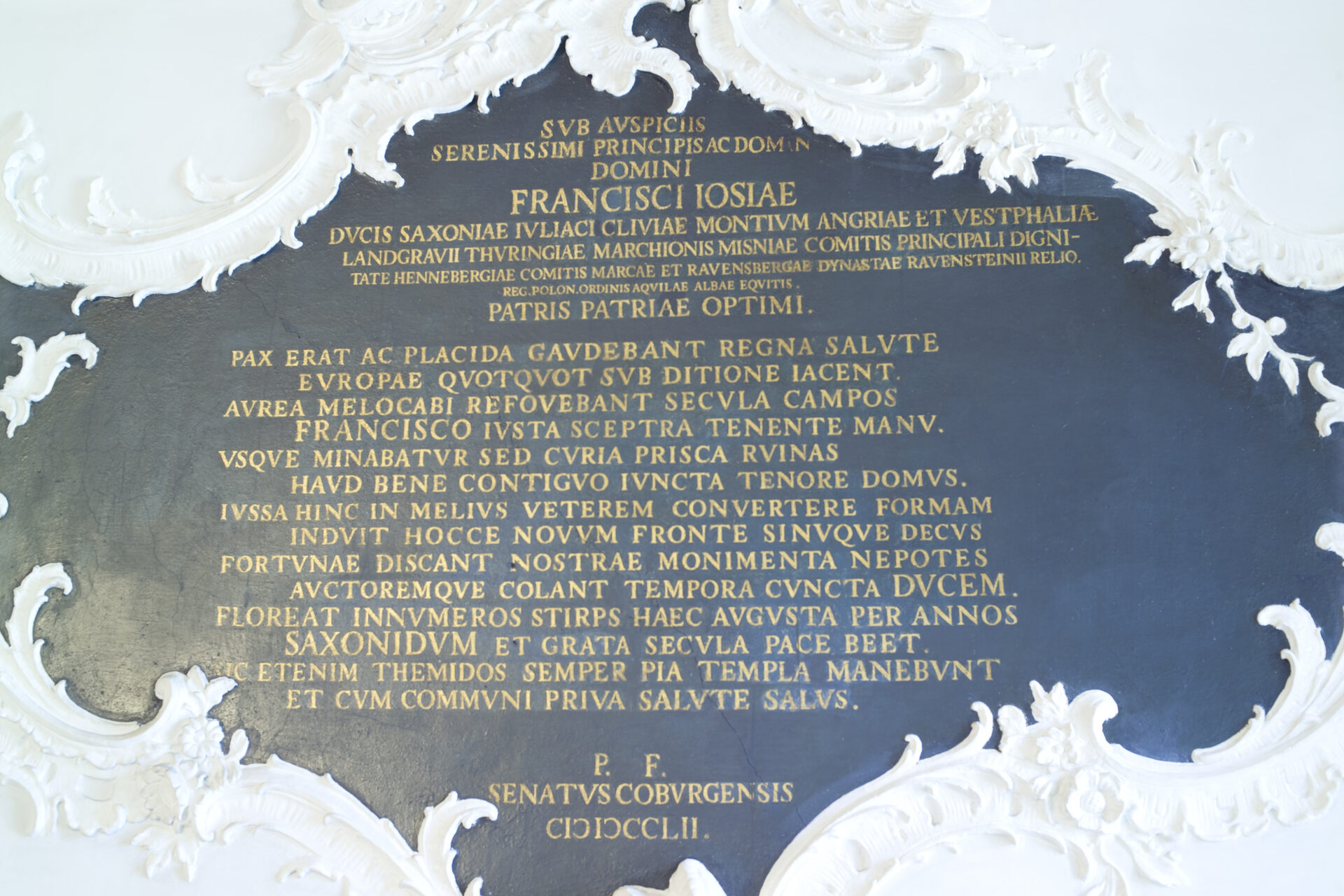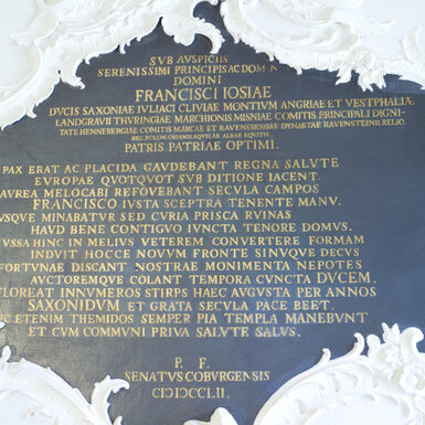 Der lat. Text bezieht sich auf die Rathauserneuerung im Jahre 1752 zur Zeit der Regierung des Herzogs Franz Josias von Coburg-Saalfeld 1745-1764. (Übersetzung siehe oben) -