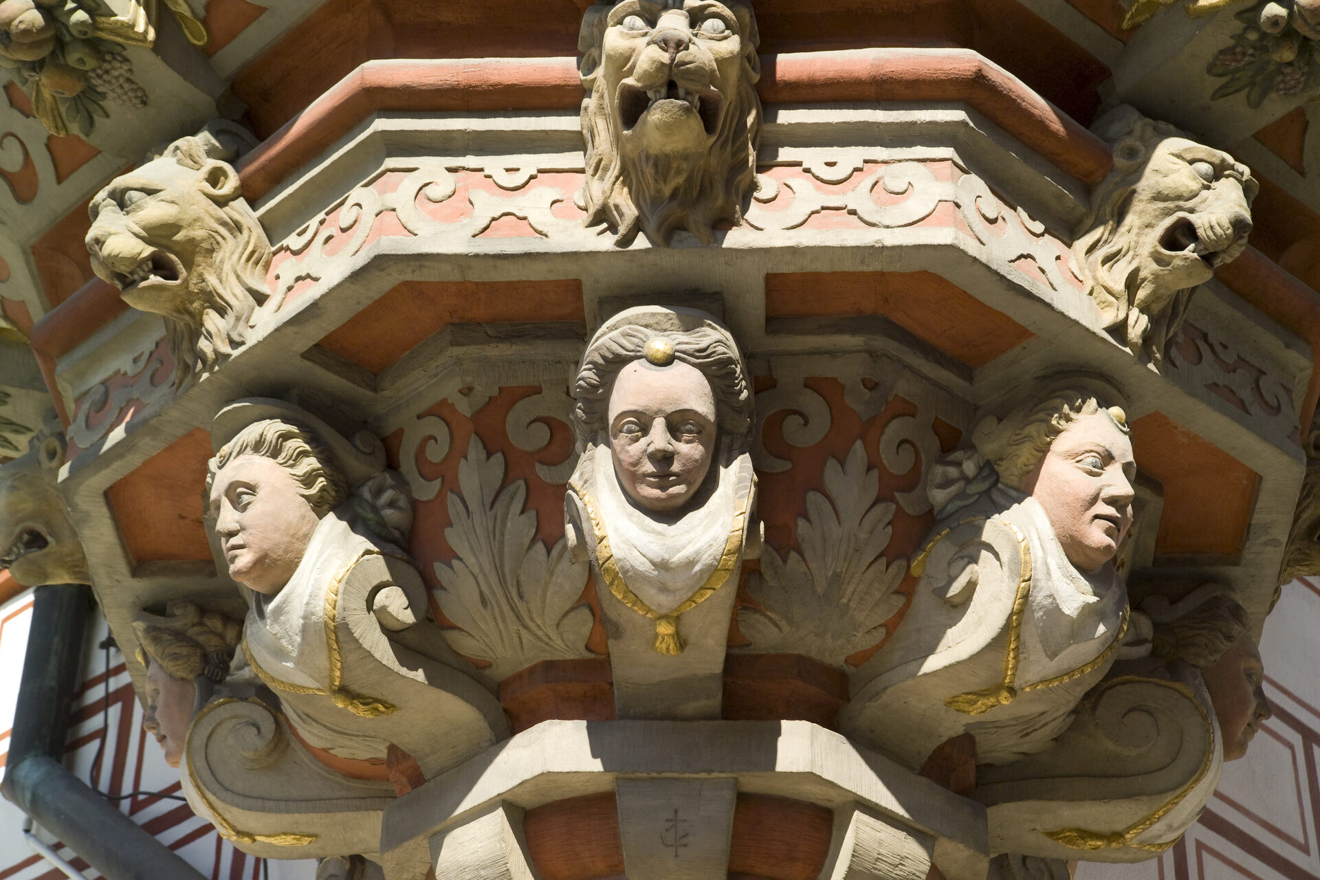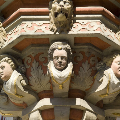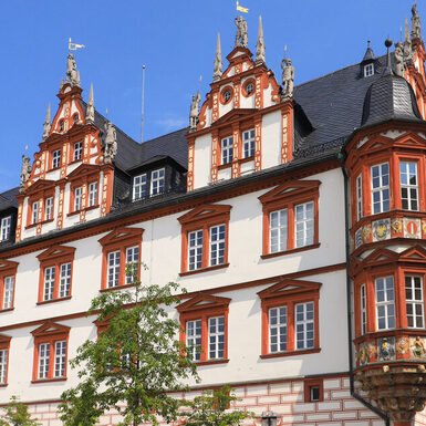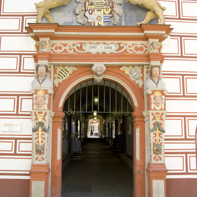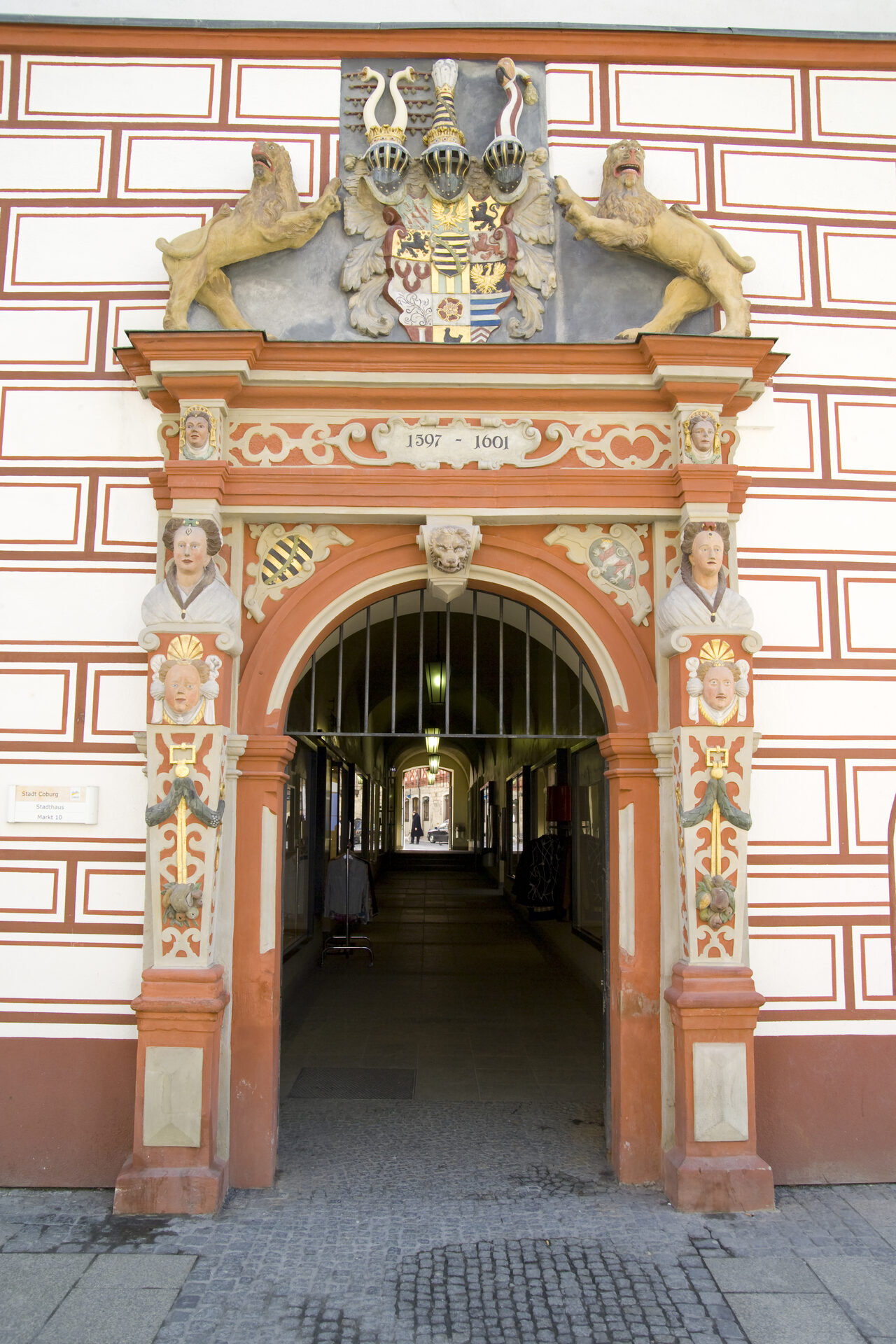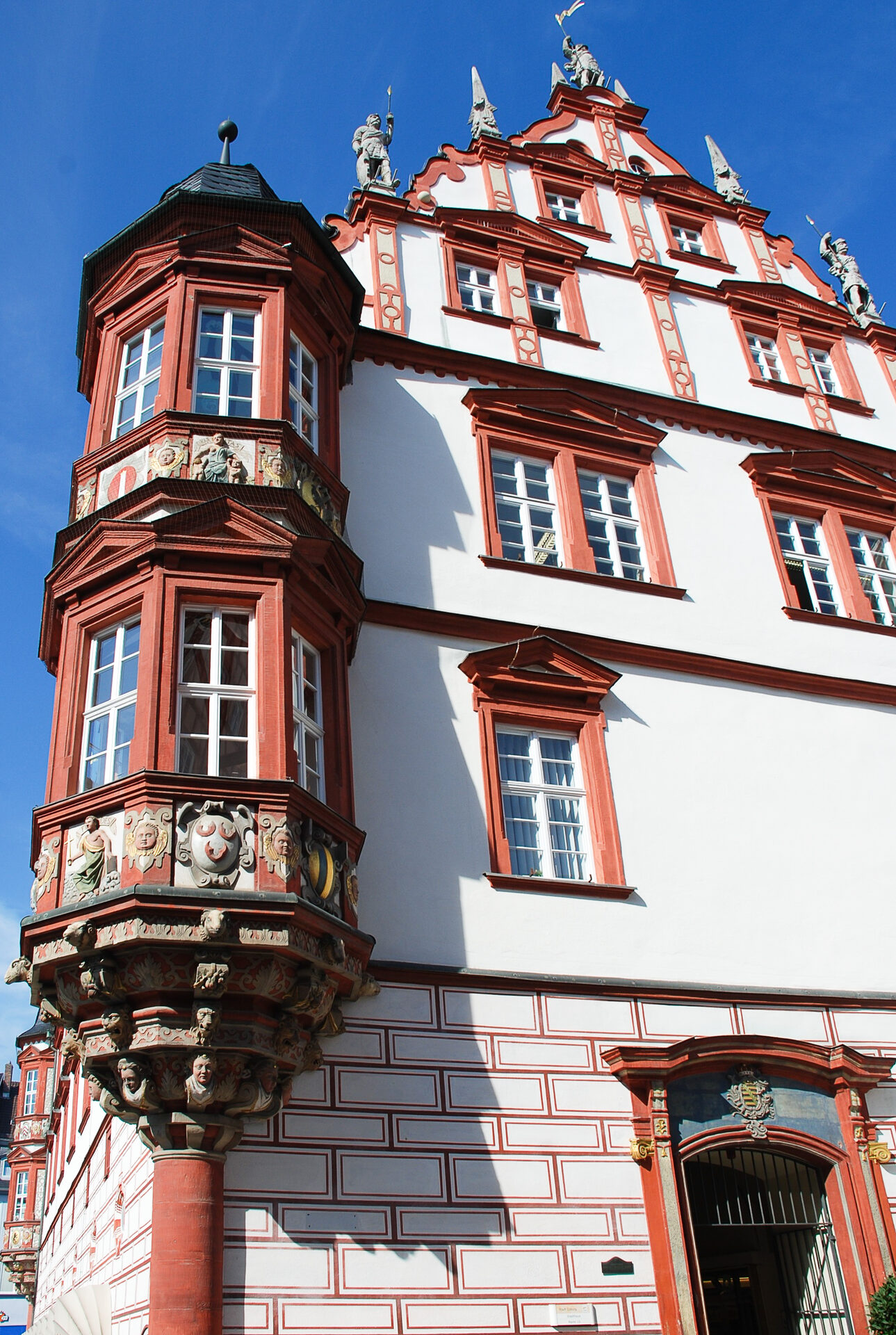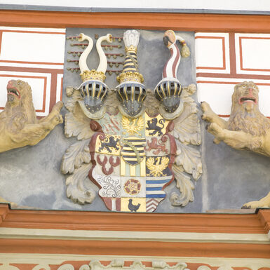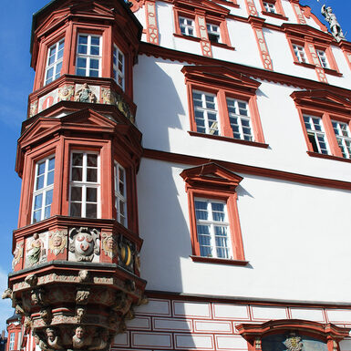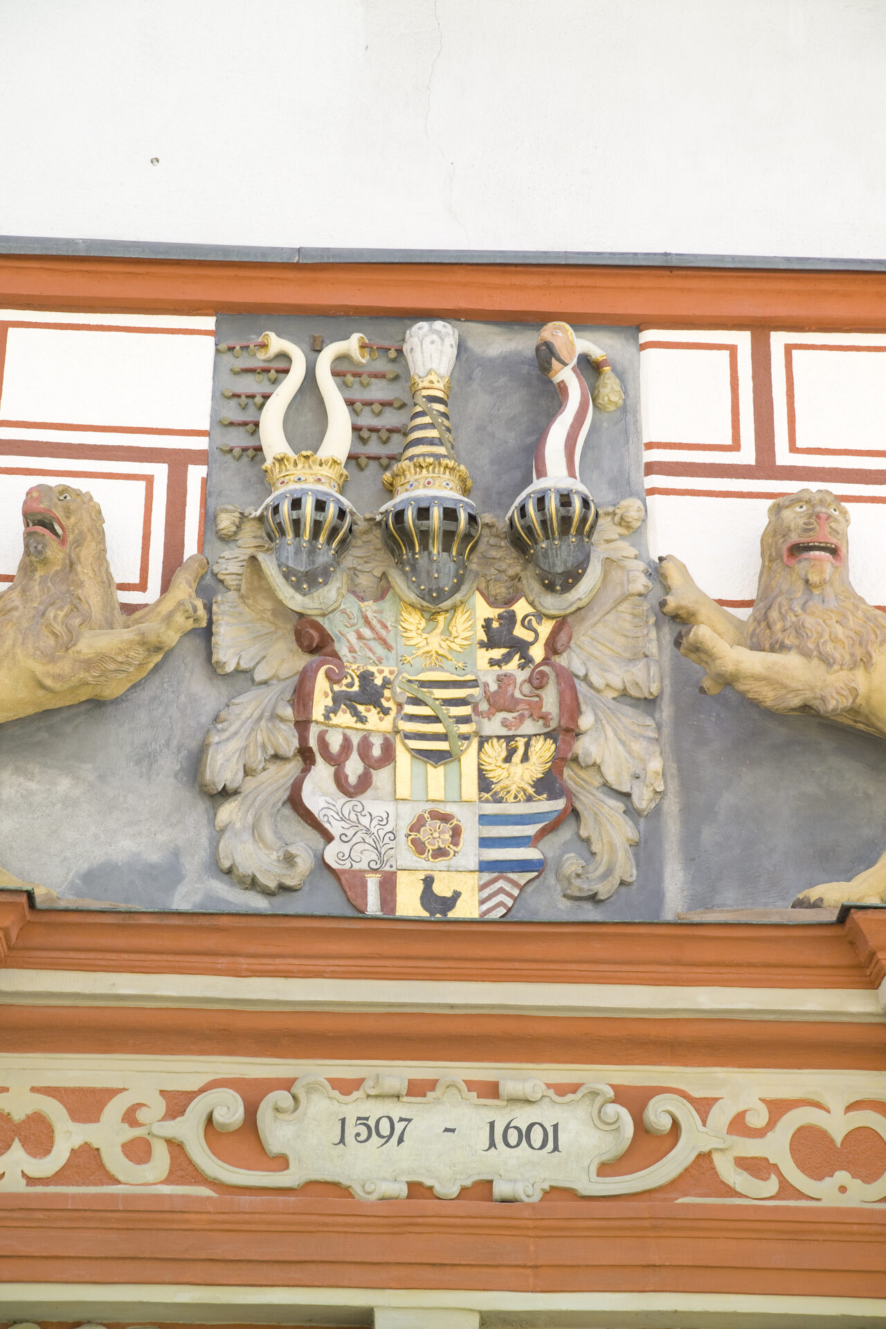 Über dem prächtigen Portal an der Spitalgasse ist das von zwei Löwen gehaltene ältere Wappen Johann Casimirs angebracht. Die farbigen Embleme unter den Fenstern der Erker sind dem seit 1610 erweiterten großen Staatswappen des Herzogs entnommen. Auf den übrigen Feldern sind in Reliefs die Tugenden Justitia, Spes (Gerechtigkeit, Hoffnung) am Erker Spitalgasse und Fides, Caritas (Glaube, Liebe) am Erker Herrngasse mit ihren Symbolen dargestellt. Der spitzbärtige Männerkopf links am ersten Geschoss des letzteren ist wohl als Selbstbildnis des Bildhauers Nikolaus Bergner anzusehen. Das feine Portal an der Herrngasse stammt aus dem Jahr 1750.
