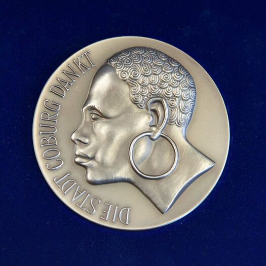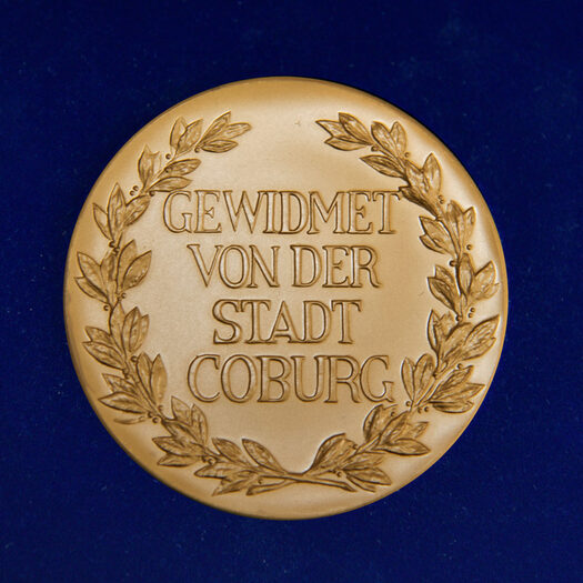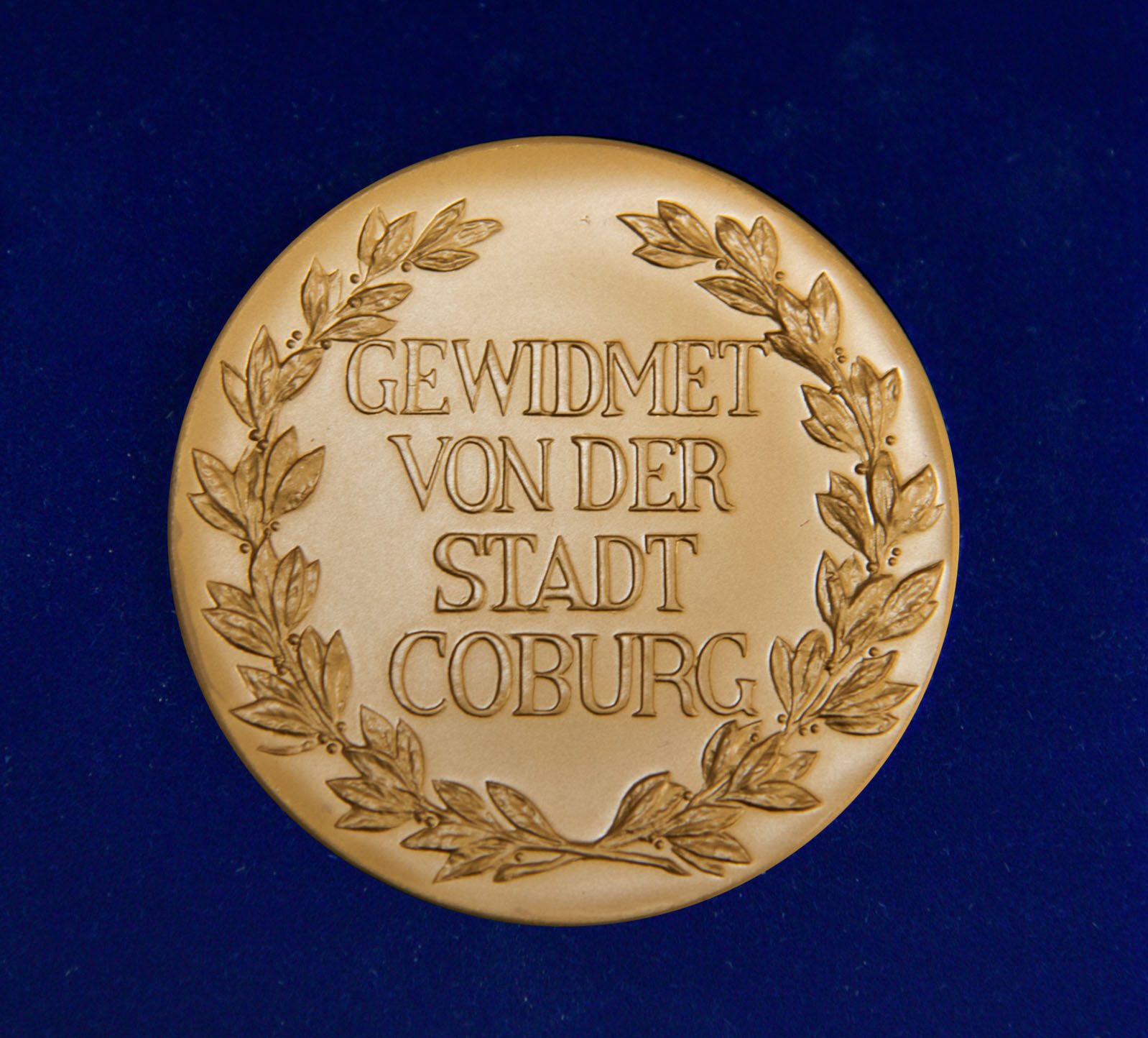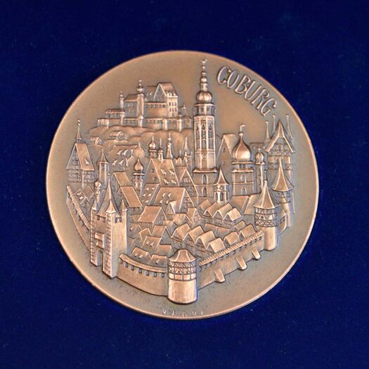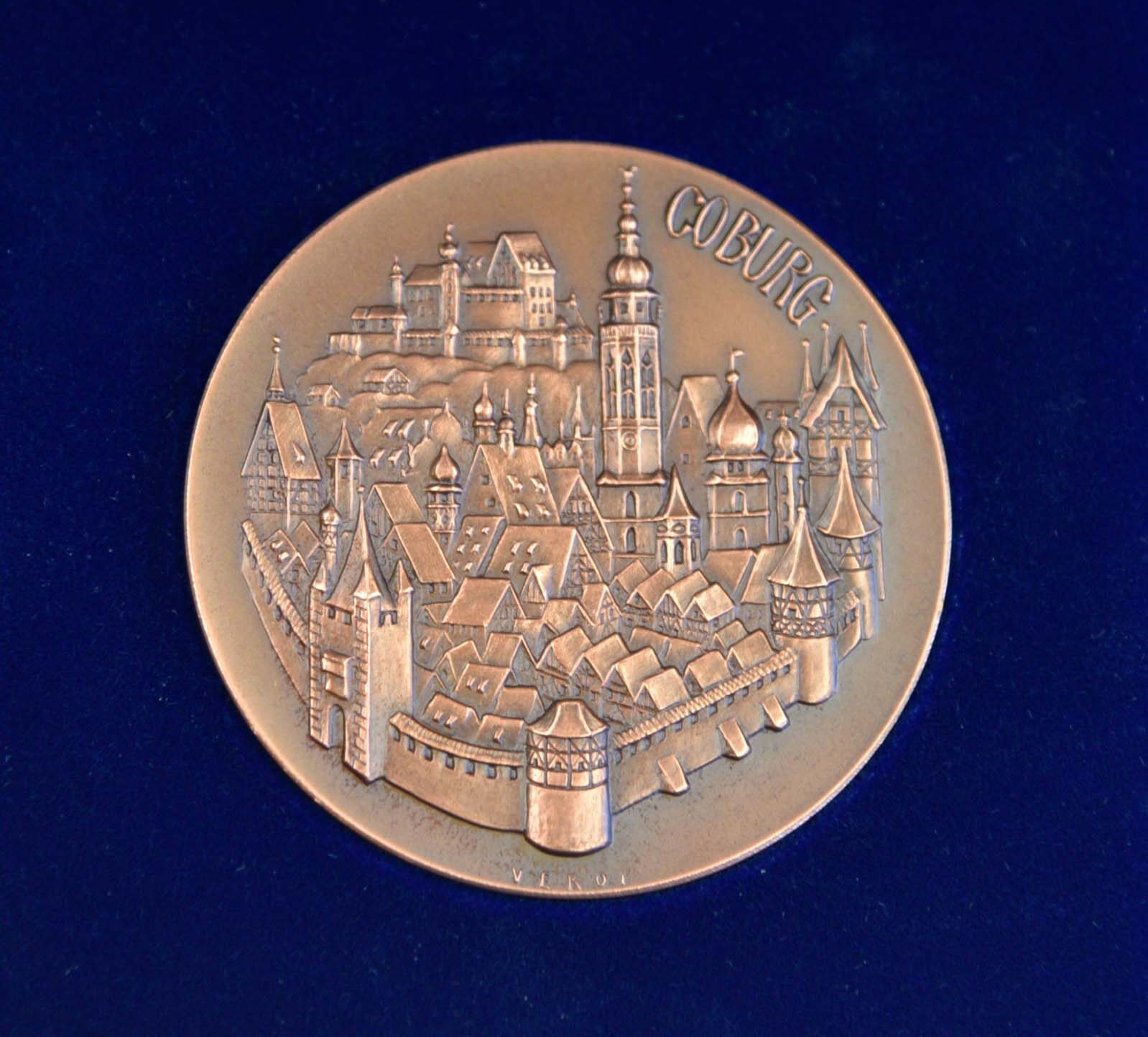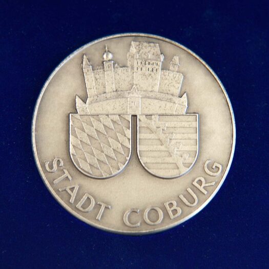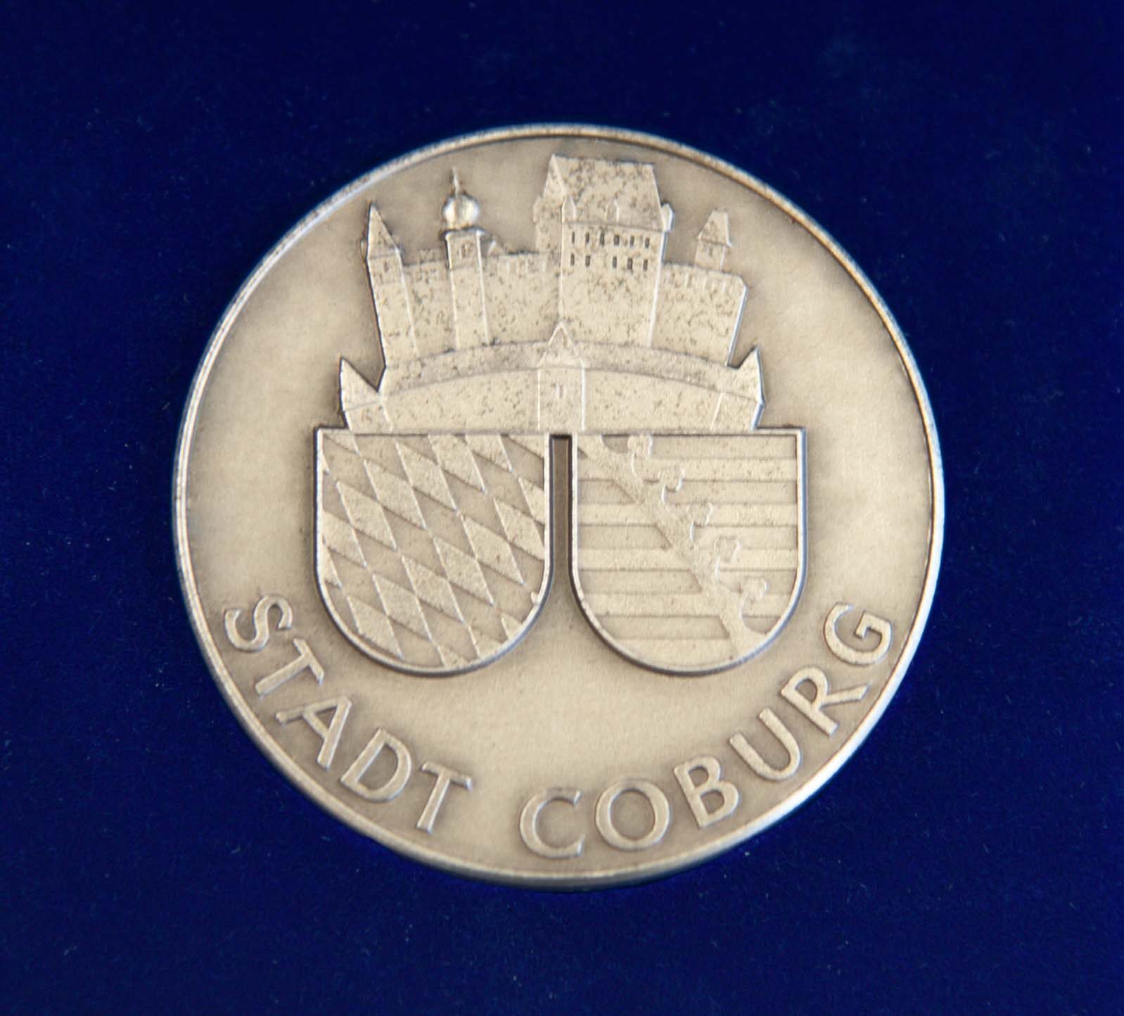 Die Stadtmedaille trägt auf der Vorderseite den „Mohrenkopf“ und die Worte „Die Stadt Coburg dankt“. Auf der Rückseite ist eine Stadtansicht eingeprägt.
