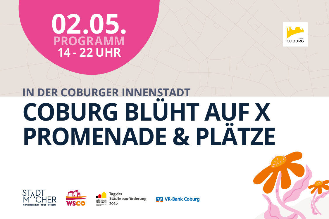 Am Samstag, 2. Mai 2026, verwandelt sich die Coburger Innenstadt von 14 bis 22 Uhr in eine lebendige Erlebnisfläche voller Begegnungen, Aktionen und frühlingshafter Atmosphäre. Unter dem Motto „Coburg blüht auf X Promenade & Plätze“ erwartet Besucherinnen und Besucher ein abwechslungsreiches Programm für die ganze Familie.