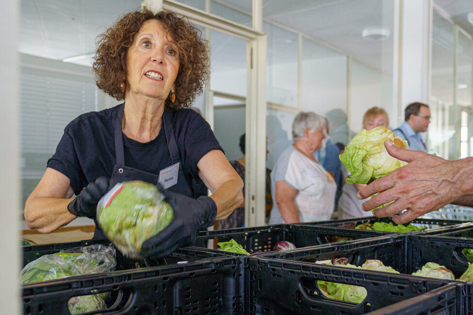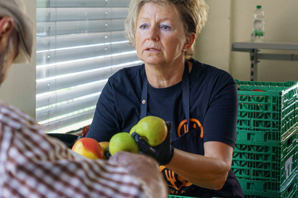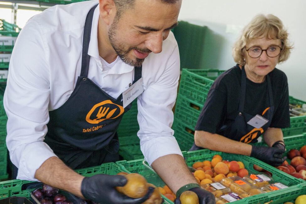 Es ist schon heiß an diesem Mittwochvormittag. Ein großes Zelt spendet Schatten auf dem Parkplatz in der Rodacher Straße. Dort warten Frauen, Männer und Kinder. Im Gebäude dahinter zieht sich Coburgers dritter Bürgermeister Can Aydin gerade zwei Latexhandschuhe über die Hände. Er unterstützt heute das Team der Coburger Tafel beim Ausgeben von Äpfeln, Birnen und Pflaumen. Auch eine große und bauchige grüne Frucht liegt in den Körben. „Das ist eine Papaya“, sagt Brigitte aus dem Team der Tafel, als sie den fragenden Blick des Bürgermeisters sieht. Um 10 Uhr beginnt die Ausgabe.