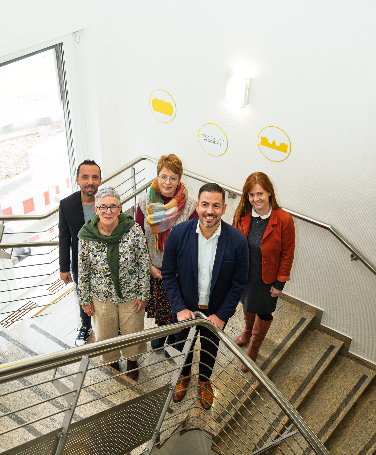 Bei Fragen zur Beantragung oder zur App-Nutzung steht die Stabsstelle Demografie, Bildung & Familie gemeinsam mit den Mitarbeitenden des Bürgerbüros zur Verfügung: v.l.n.r. Bahadir Demirezen (Einwohneramt), Petra Michalowski-Scheidmantel (Einwohneramt), Dana Helbig (Stabsstelle Demografie, Bildung & Familie), 3. Bürgermeister Can Aydin, Bianca Haischberger (Stabsstelle Demografie, Bildung & Familie)