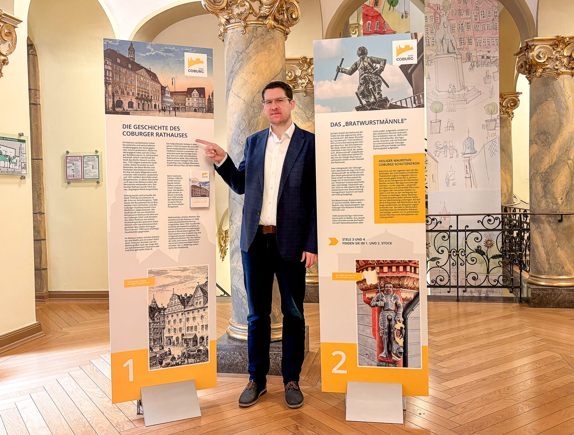 „Seit das Bürgerbüro nicht mehr im Rathaus ist, ist wenig Besucherverkehr in diesem schönen Gebäude“, sagt Hausherr Oberbürgermeister Dominik Sauerteig. „Das finde ich schade, denn das Rathaus gehört ja den Bürgerinnen und Bürgern. Mit den neuen Infotafeln hoffe ich wieder auf mehr Besucher.“