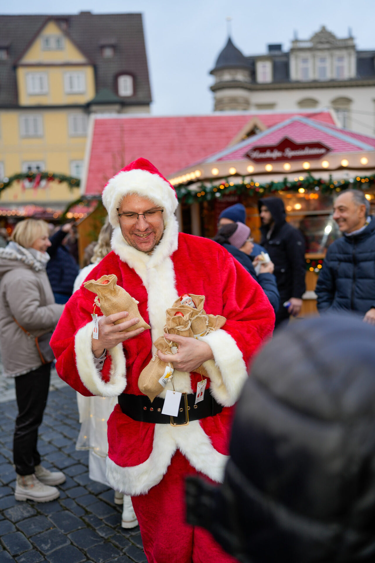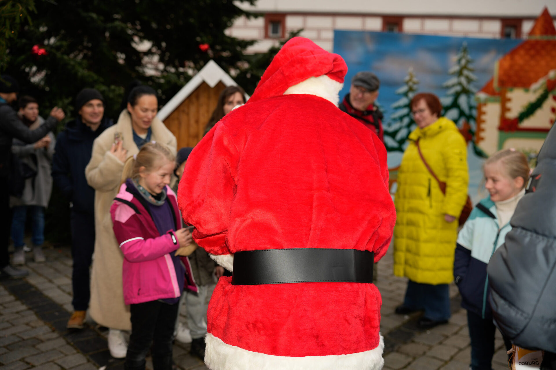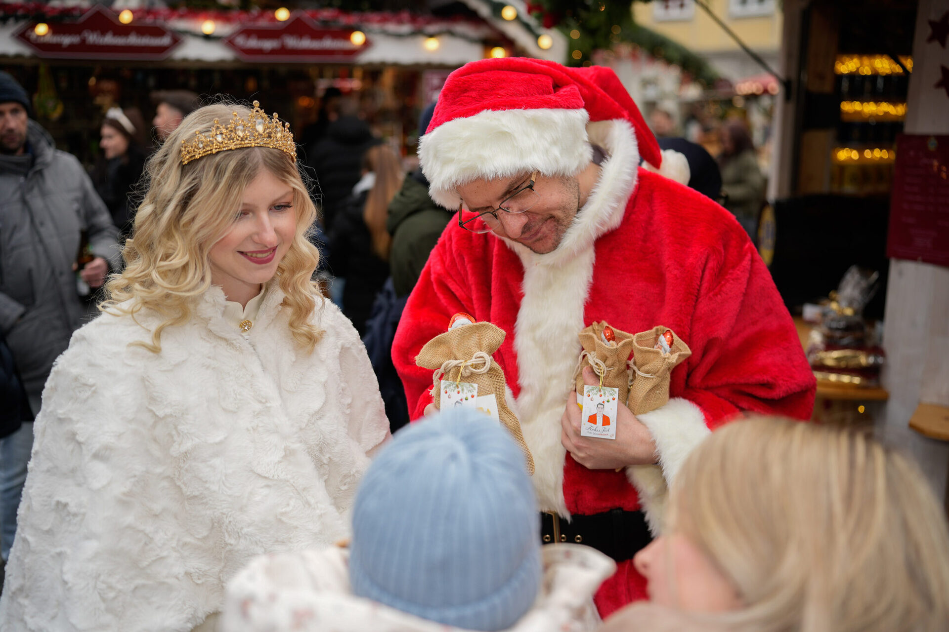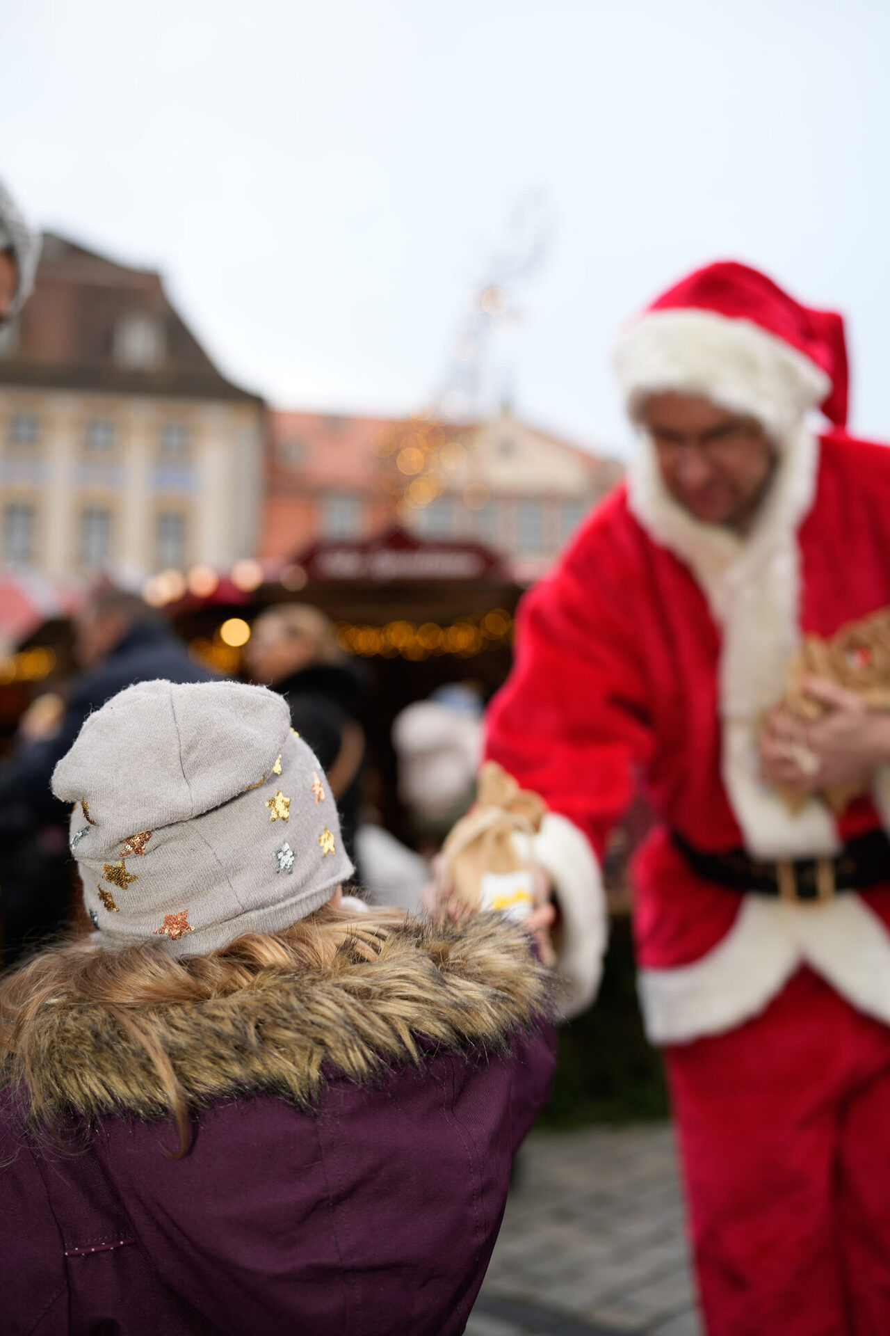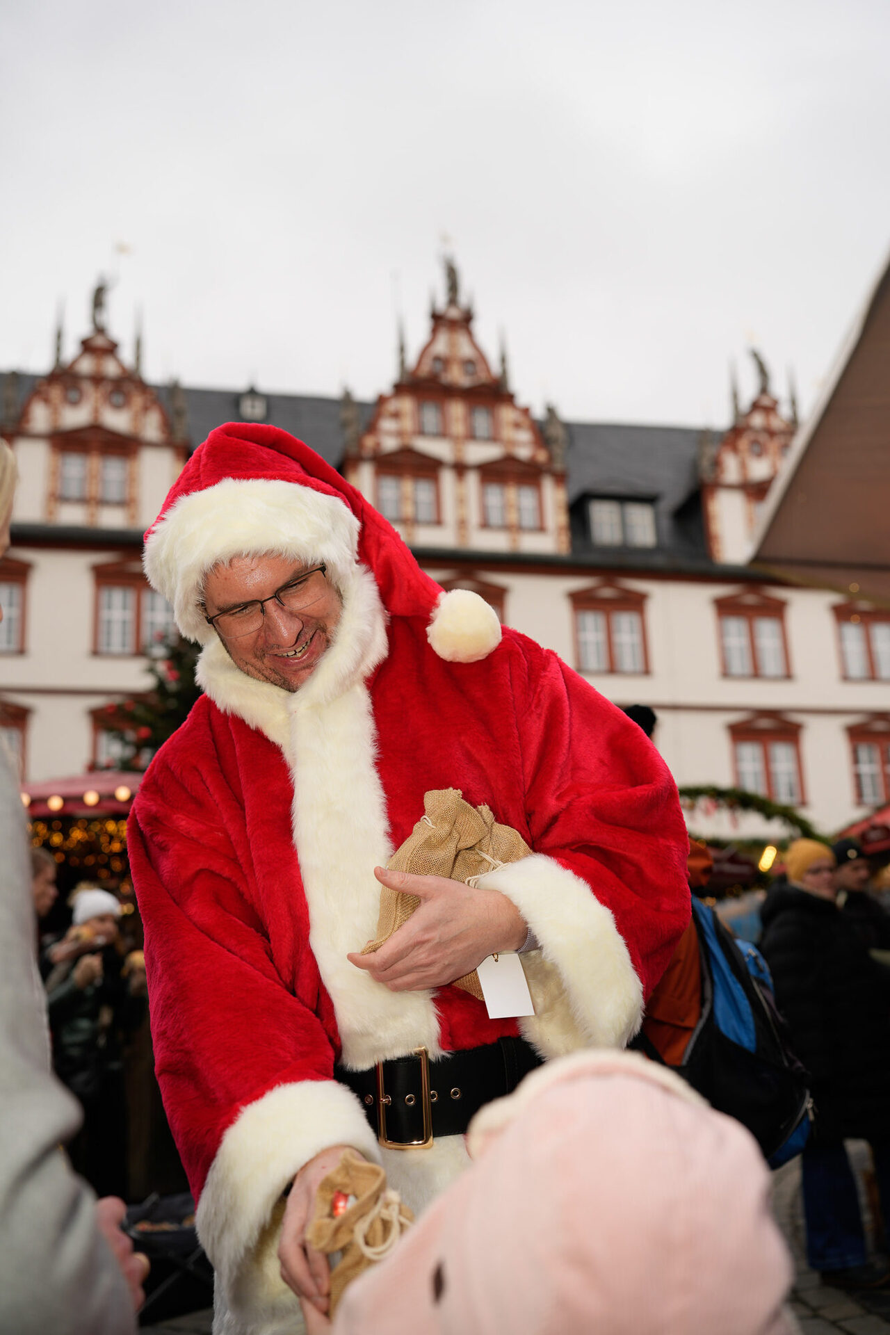 Pünktlich zum 6. Dezember hat der Nikolaus Station auf dem Coburger Weihnachtsmarkt gemacht. Zusammen mit dem Christkind hat er den Kindern eine kleine Freude gemacht.