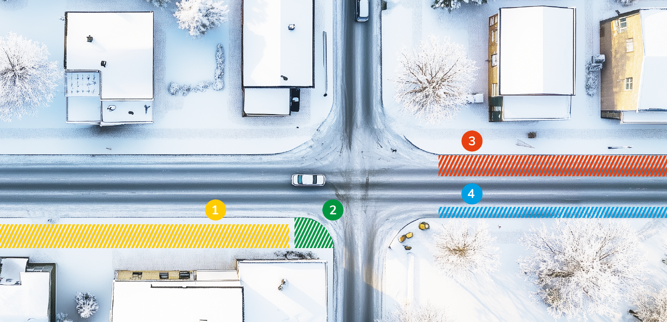 Sie müssen auf Gehwegen entlang des Grundstücks einen Streifen räumen oder streuen, der mindestens einen Meter breit ist (1). Ist der Gehweg schmaler ist er komplett zu räumen. An Kreuzungen ist bis zum Fahrbahnrand zu räumen oder zu streuen (2). Wenn kein Gehweg am Grundstück entlangführt, ist ein Bereich der Straße zu räumen oder zu streuen (4). Den Schnee dürfen Sie dabei nicht auf die Straße schieben (3). Der Winterdienst würde ihn dann nur wieder auf Ihren Gehsteig oder Ihr Grundstück zurückschieben.
