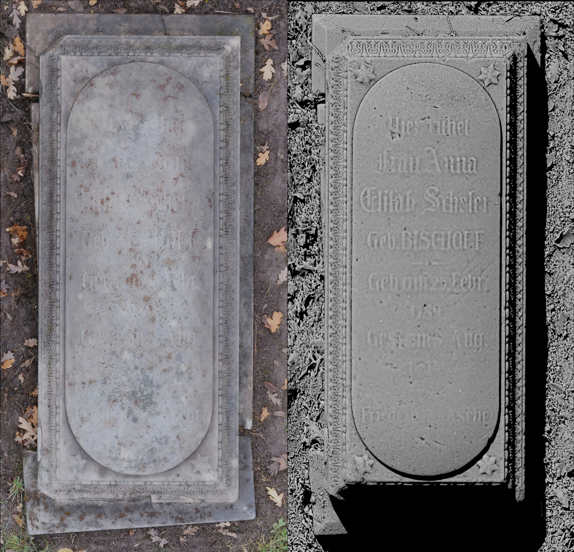 In einem Forschungsprojekt über Jüdische Kleinfriedhöfe in Franken (jf-franken.de) hat er Erfahrungen mit dem Structure-from-Motion-Verfahren gesammelt. Dieses imitiert die Art und Weise wie Menschen ihre räumliche Wahrnehmung erzeugen. Wenn wir uns bewegen, ändern sich die Blickwinkel auf die Objekte vor uns. Die vielen Fotos des aus unterschiedlichen Positionen erlauben Dr. Hegel, mit einer speziellen Software ein dreidimensionales Modell der Steinplatte zu erstellen. So werden auch feinste Strukturen auf der Oberfläche sichtbar. Das gilt auch für die Inschrift. „Wir haben hier das Grab von Anna Elisabeth Scheler. Es ist immer aufregend, wenn ein Stück vergessene Geschichte wieder ans Tageslicht kommt“, beschreibt es Heimatpfleger Hegel. Der Name „Anna Elisabeth Scheler“ und ihr Geburtsdatum, 26. Februar 1789, waren gut lesbar. Ihr Todestag allerdings nicht. Lediglich der Monat „August“ ließ sich ohne Probleme erahnen.