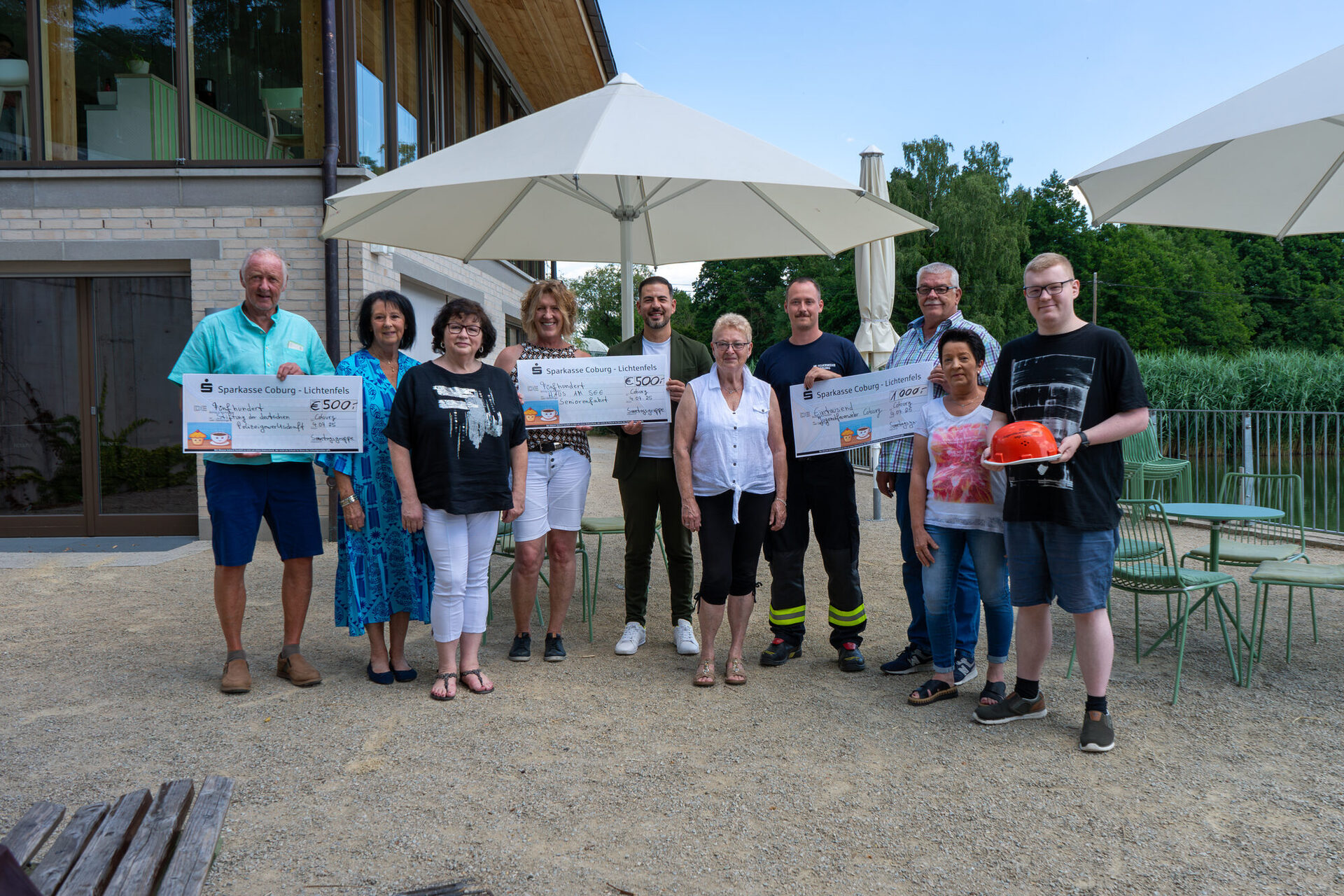 Das Team vom Sonntagscafé hat seine Einnahmen nun für wohltätige Zwecke gespendet. In diesem Jahr wurden insgesamt 2.000 Euro übergeben: 1.000 Euro gingen an die Jugendfeuerwehr Coburg, 500 Euro an die Stiftung der Deutschen Polizeigewerkschaft und weitere 500 Euro zur Unterstützung von Seniorenfahrten an das Haus am See.