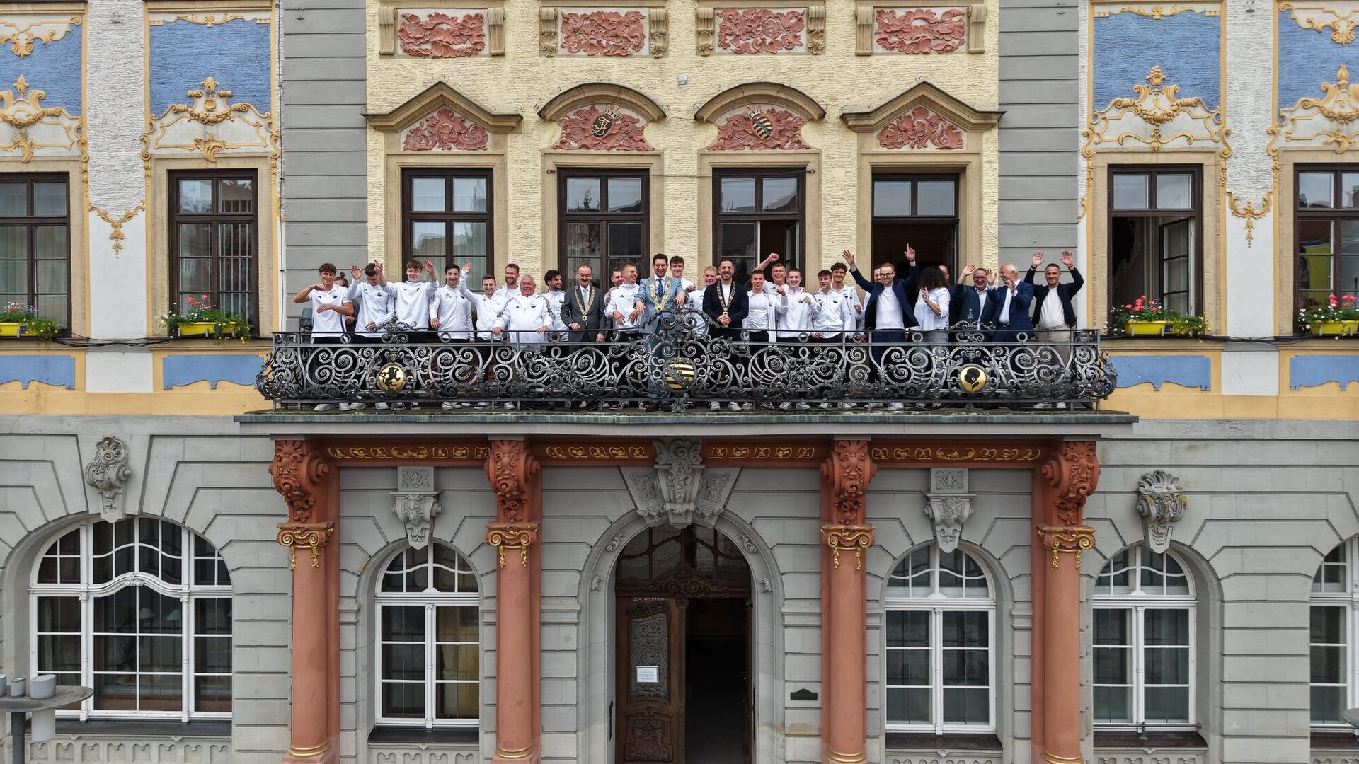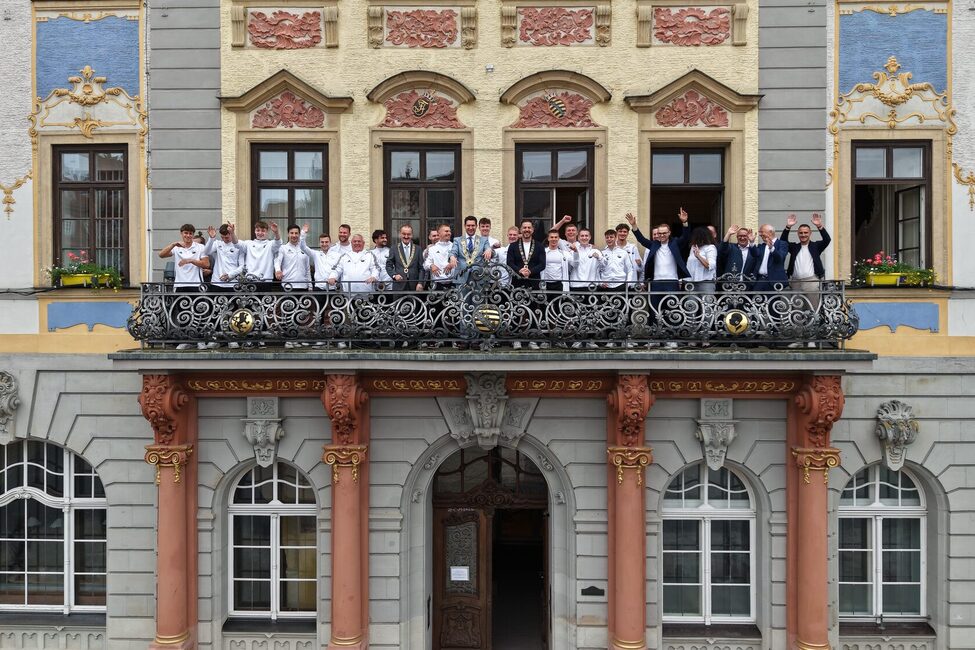 Im Namen der Stadt Coburg gratulierte Oberbürgermeister und Sportreferent Dominik Sauerteig zusammen mit dne Bürgermeisterkollegen Hans-Herbert Hartan und Can Aydin sowie Sportamtsleiter Ronny Göhl der Mannschaft, dem Trainerteam, dem Vorstand sowie den Unterstützer*innen des Vereins zu diesem großartigen Erfolg. Wie es sich für eine richtige Meisterfeier gehört führte der erste Weg auf den Rathausbalkon - begleitet vom Coburger Marsch. Anschließend durften sich alle Beteiligten in das Goldene Buch der Stadt Coburg eintragen.