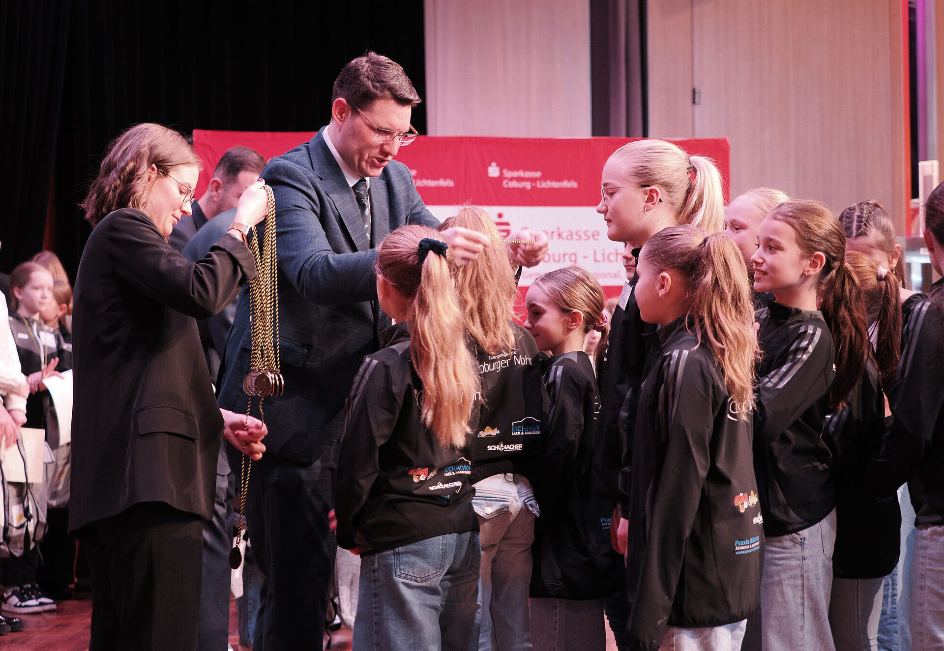 Neben den Ehrungen sorgte ein abwechslungsreiches Programm für Begeisterung: Die Trail-Abteilung des Radsportvereins Lützelbuch beeindruckte mit spektakulären Fahrkünsten, während die Meisterschaftsturner*innen des TV Coburg-Ketschendorf ihr Können am Boden, auf dem Schwebebalken und Trampolin zeigten. Nach dem offiziellen Teil lud ein Buffet sowie eine Fotobox zum Austausch ein. Im Rahmen der Veranstaltung wurde Nora Flehmig vom Sportverband Coburg als Sportlerin des Jahres ausgezeichnet.