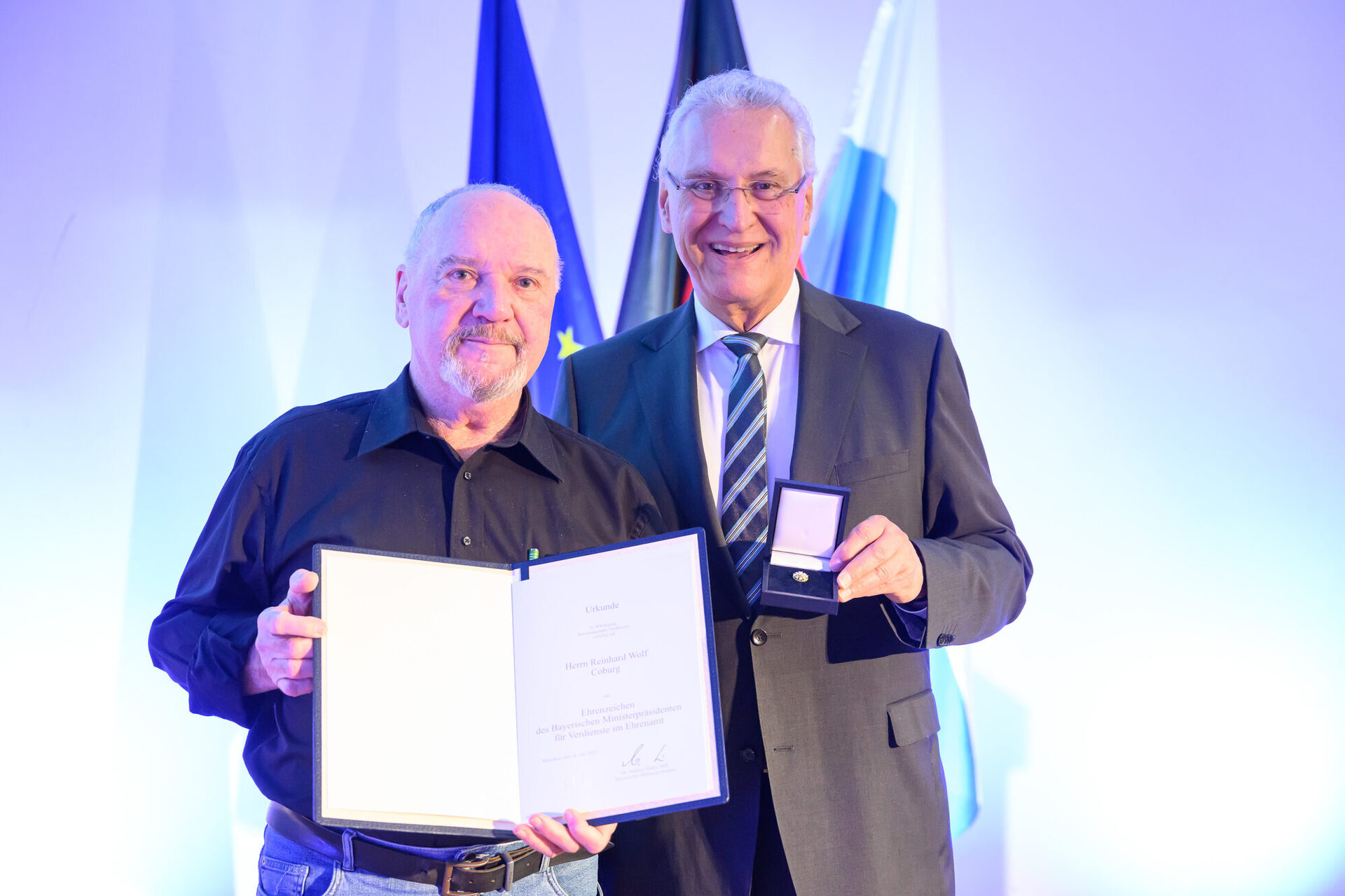 Bayerns Innenminister Joachim Herrmann hat in Nürnberg das Ehrenzeichen des Bayerischen Ministerpräsidenten für Verdienste im Ehrenamt an 60 engagierte Bürger*innen verliehen. Unter den Geehrten waren auch Edda Kroos und Reinhard Wolf aus Coburg, die sich seit vielen Jahren in besonderer Weise für ihre Mitmenschen einsetzen. Innenminister Herrmann würdigte das jahrzehntelange Engagement der Ausgezeichneten.