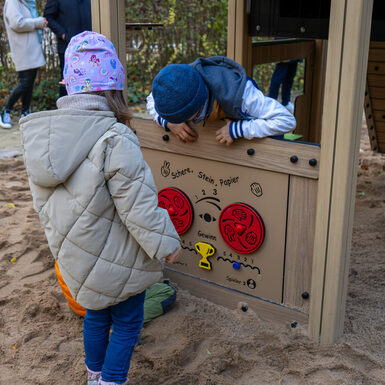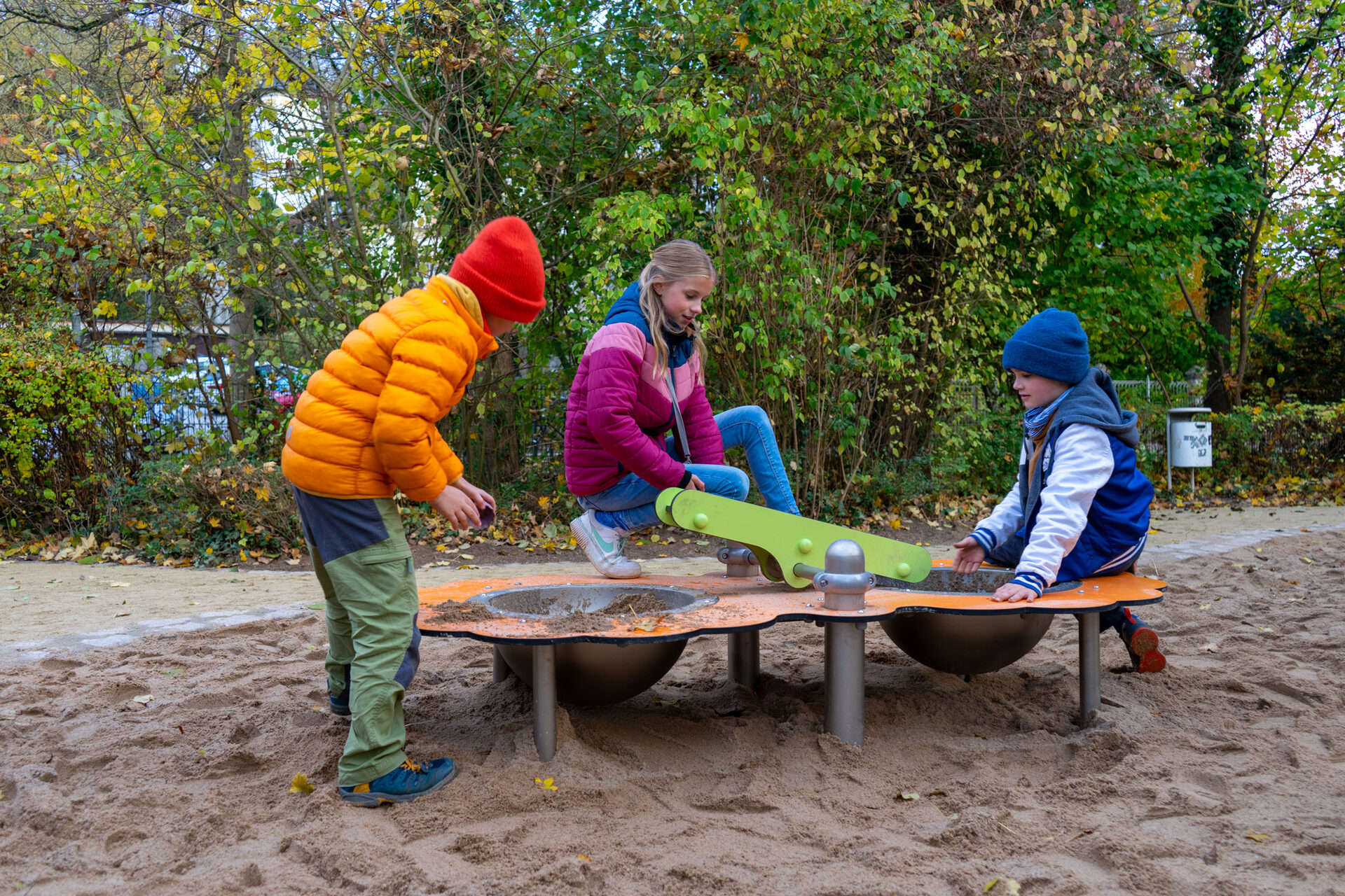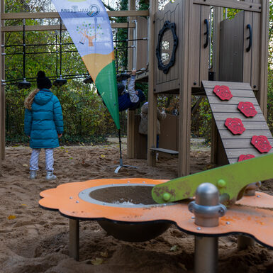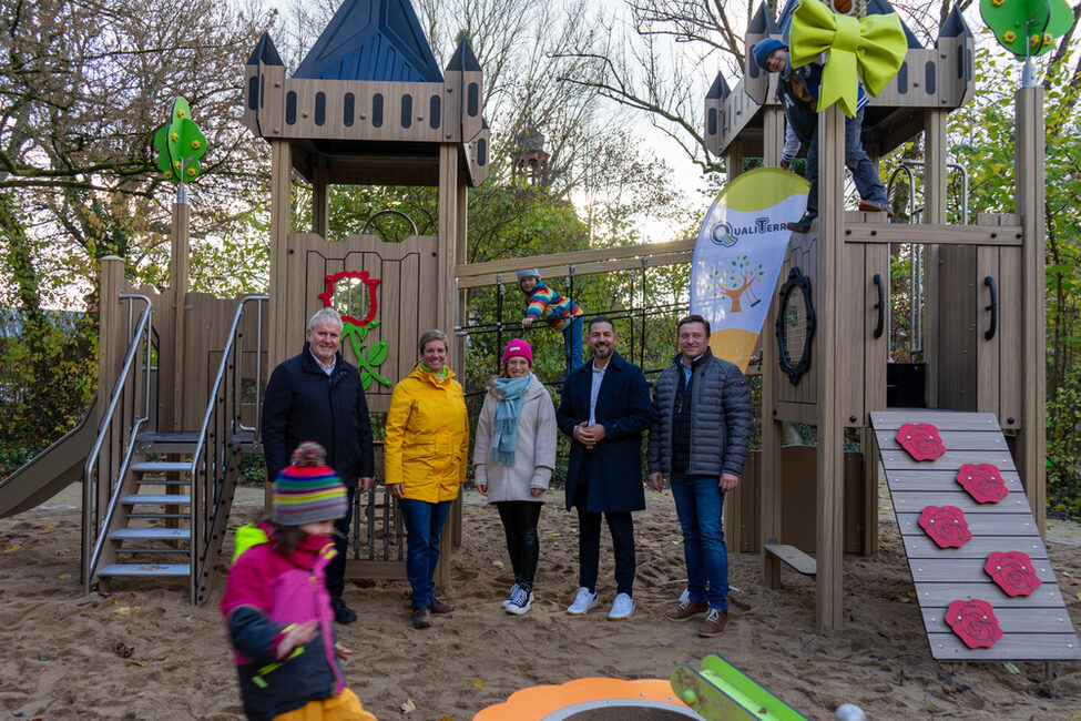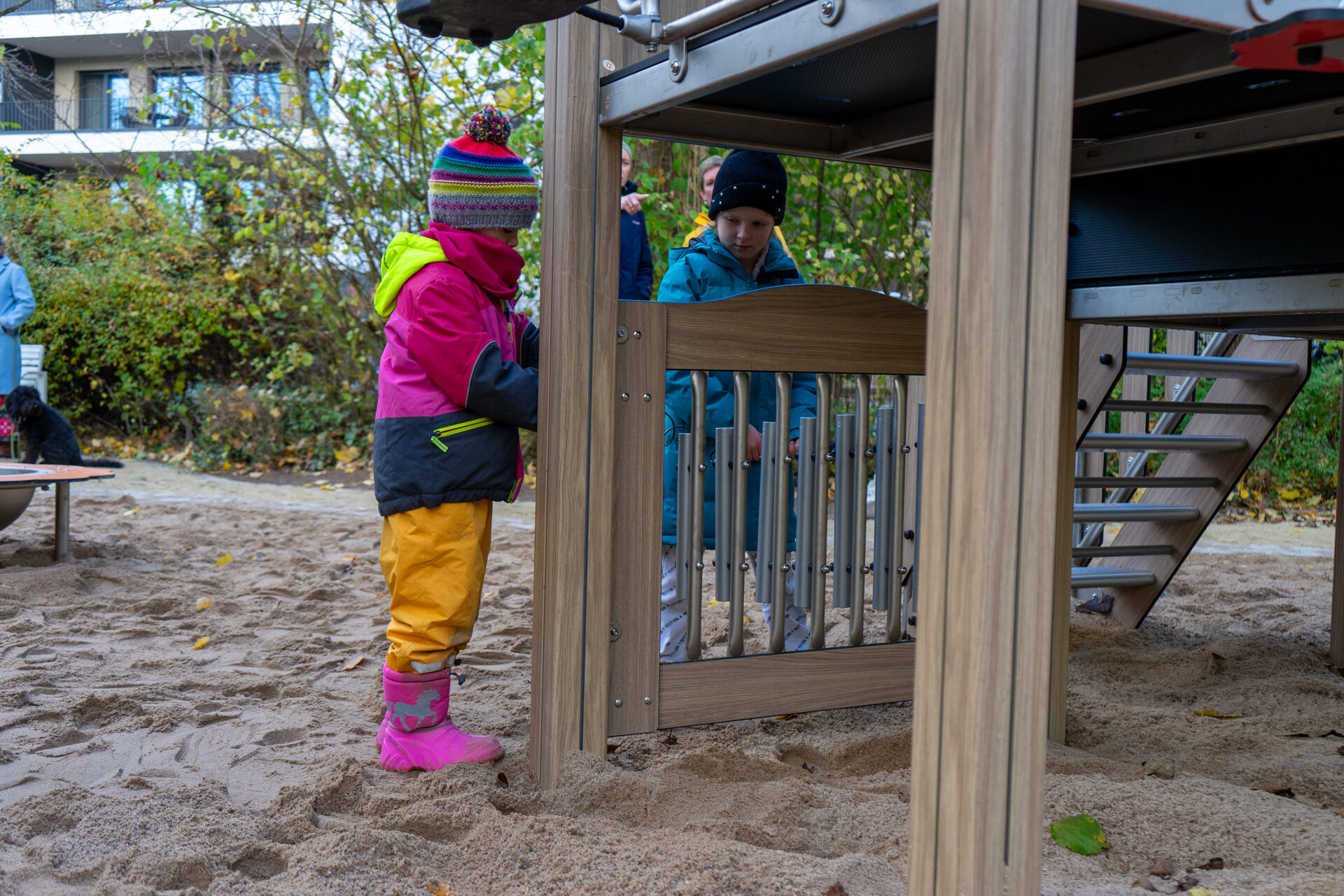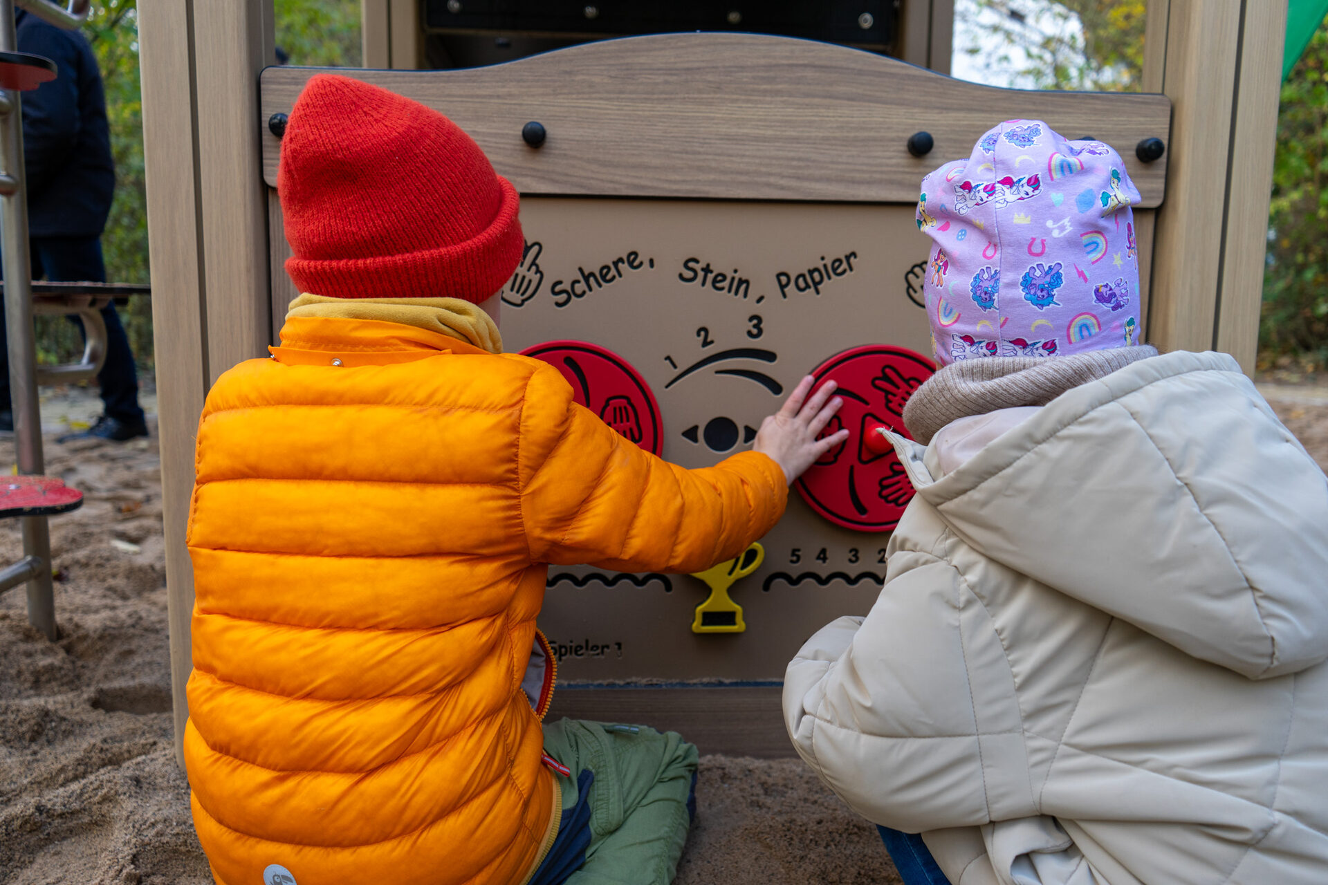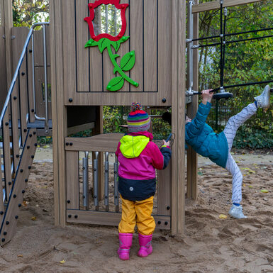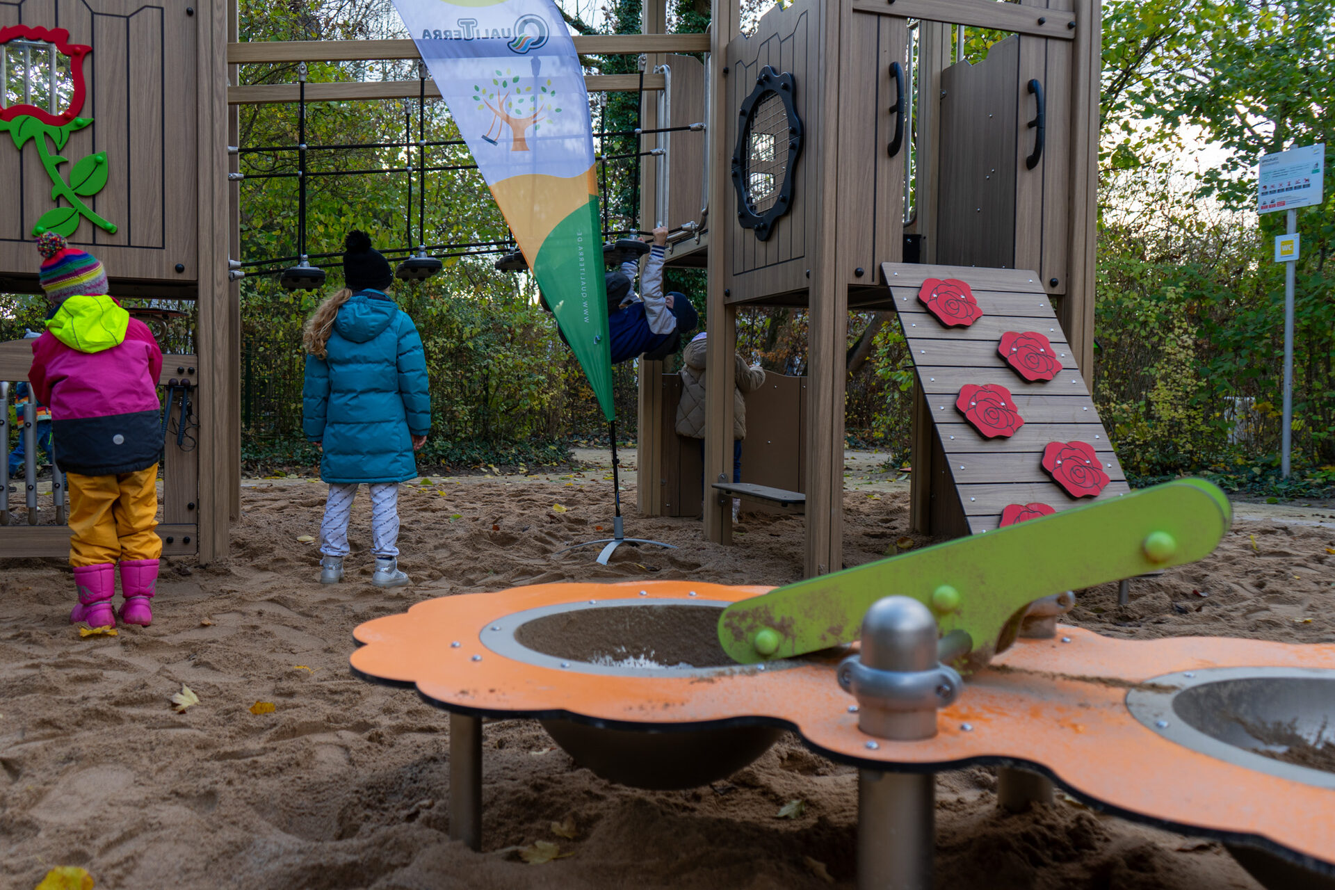 Im Zuge der Umgestaltung des Spielplatzes wurde das alte Spielgerät durch eine große, moderne Spiel- und Kletterkombination ersetzt. Zusätzlich wurde der Fallschutzbereich angepasst und ein neuer Sandspieltisch montiert, um die Spielfläche abwechslungsreich zu gestalten. Die hochwertigen Spielgeräte wurden von der Firma QualiTerra gespendet. Von der Firma kam auch die Idee, die Rosen in der Gestaltung des Spielturms aufzugreifen. Die Vorbereitungsarbeiten zur Platzierung der neuen Geräte übernahm das Grünflächenamt der Stadt, während die Montage von der Firma Renner durchgeführt wurde.