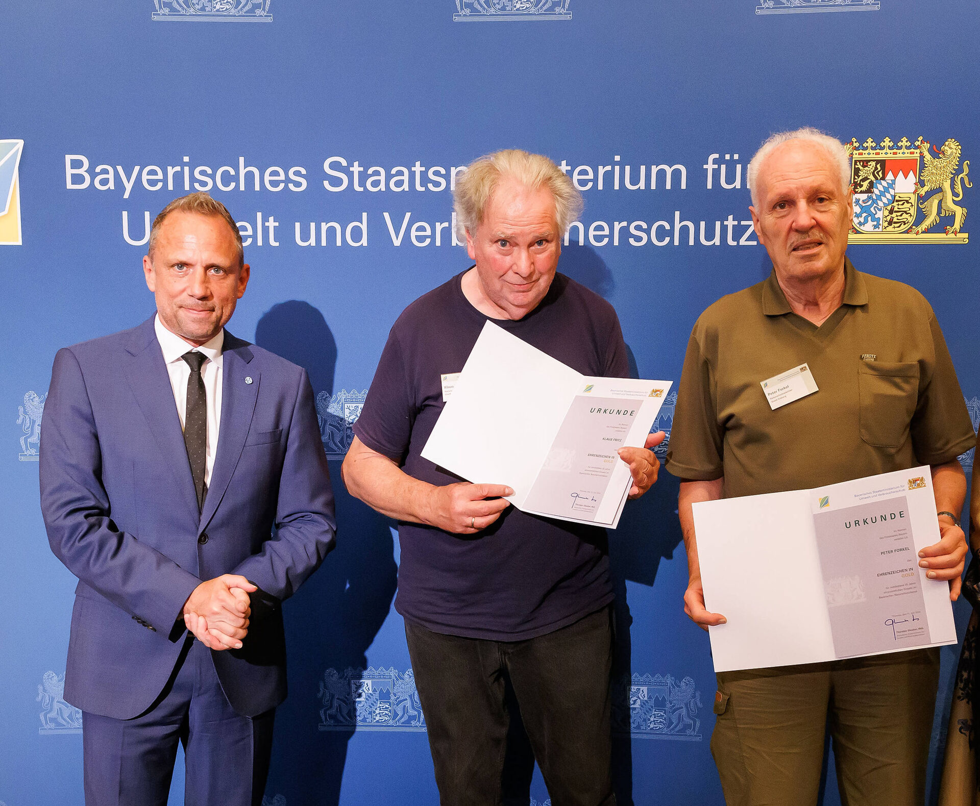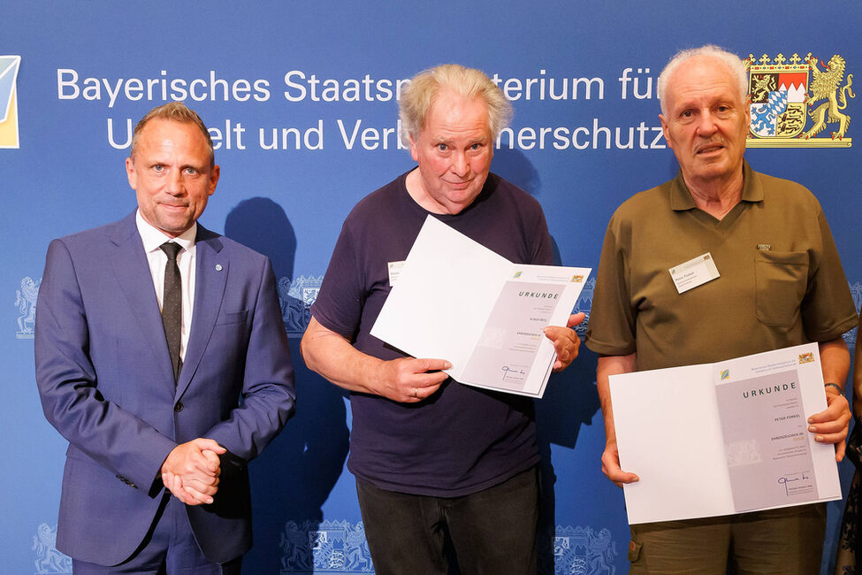 Ihre Beobachtungen fließen in monatliche Berichte ein und liefern der Behörde ein aktuelles Bild über den Zustand der Schutzgebiete. Zu ihren Aufgaben zählt auch die Aufklärung von Bürgerinnen und Bürgern über Naturschutzgesetze und Schutzgebietsverordnungen. Am 11.07.2024 wurden sie in festlichen Rahmen im Schloss Thurnau vom bayerischen Staatsminister für Umwelt und Verbraucherschutz mit dem Ehrenzeichen in Gold ausgezeichnet, um ihre über 25-jährige engagierte Mitarbeit zu würdigen.