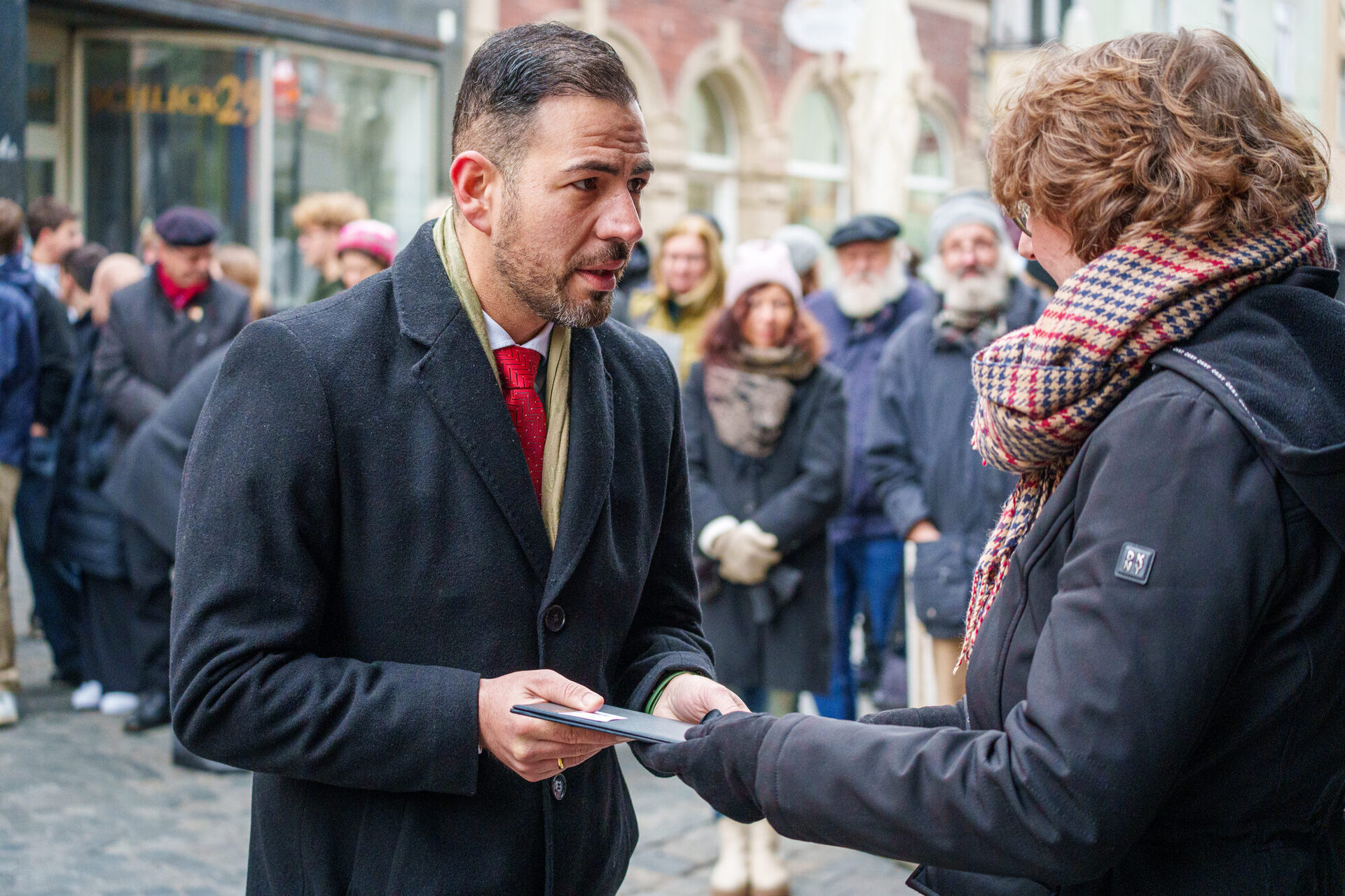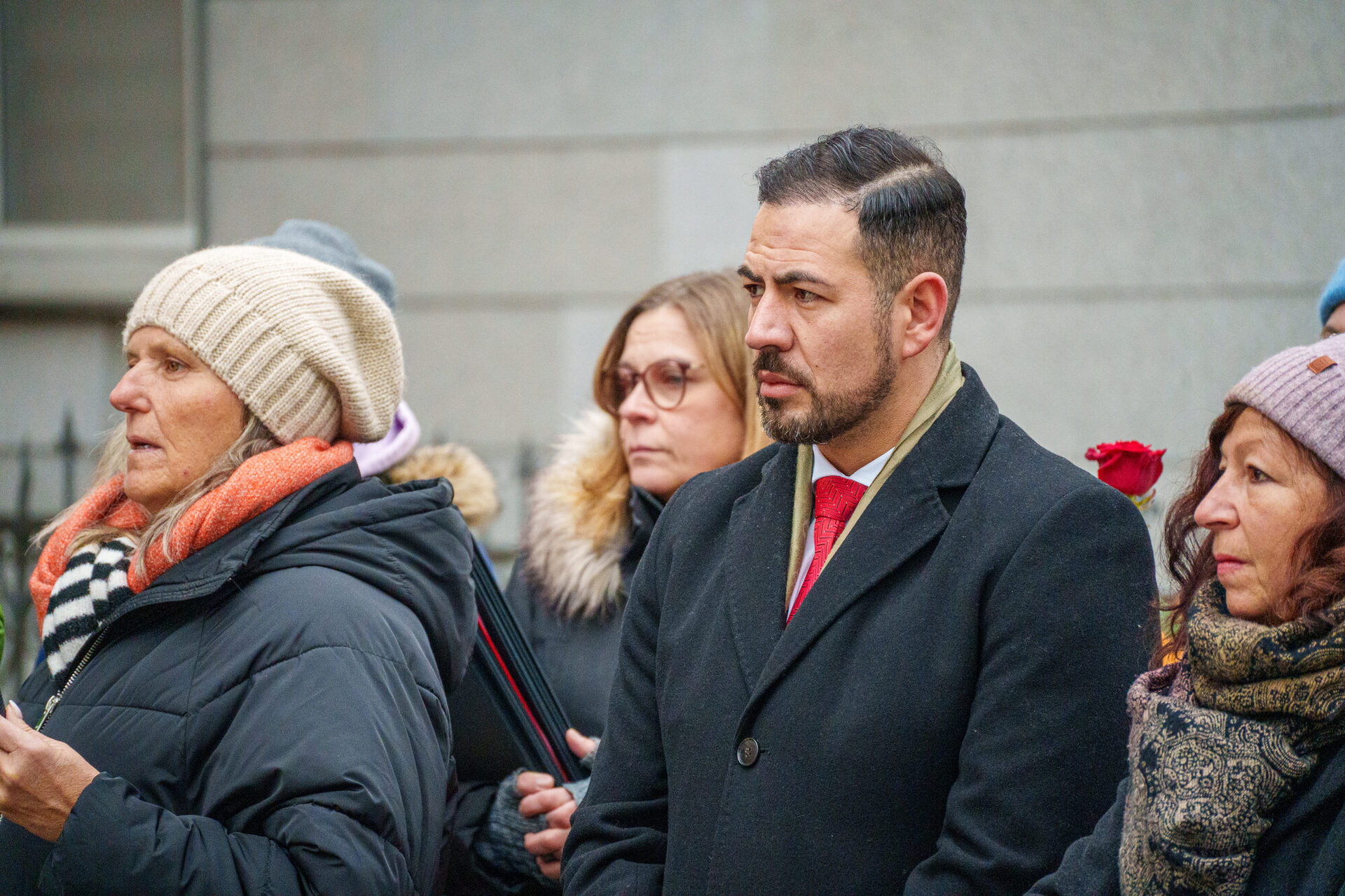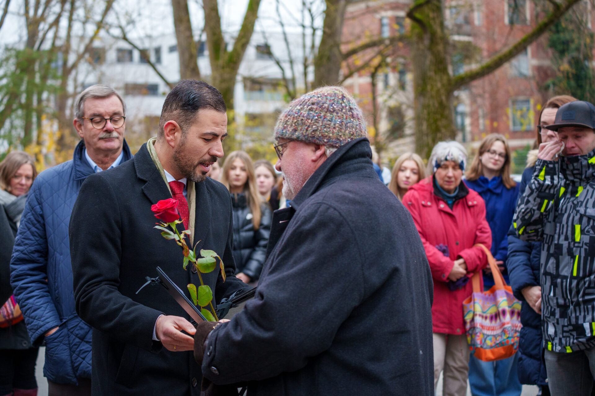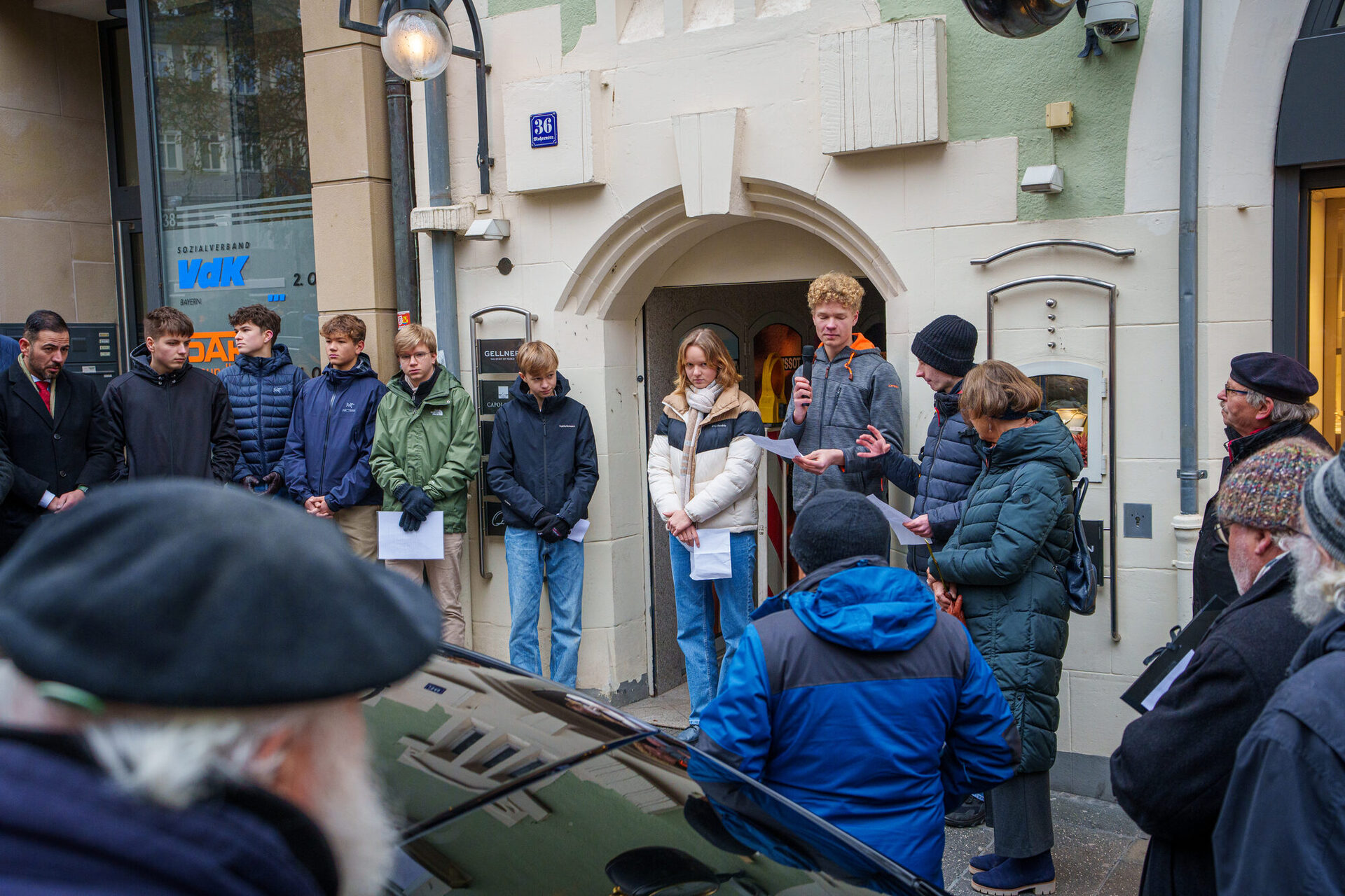 Dem eisigen Novemberwetter zum Trotz hatten sich schon an der ersten Station in der Gartenstraße 3 zahlreiche Menschen versammelt. Sie alle wollten dabei sein, wenn 3. Bürgermeister Can Aydin neue Stolpersteine verlegt. „Es ist die Aufgabe von uns allen, die Erinnerungen wach zu halten“, so der 3. Bürgermeister in seinen Eröffnungsworten. Insgesamt vier Steine erinnern an dieser Adresse an die Familie Ludwig. Schüler*innen der Heiligkreuz-Mittelschule haben die Geschichte der Familie eindringlich nacherzählt.