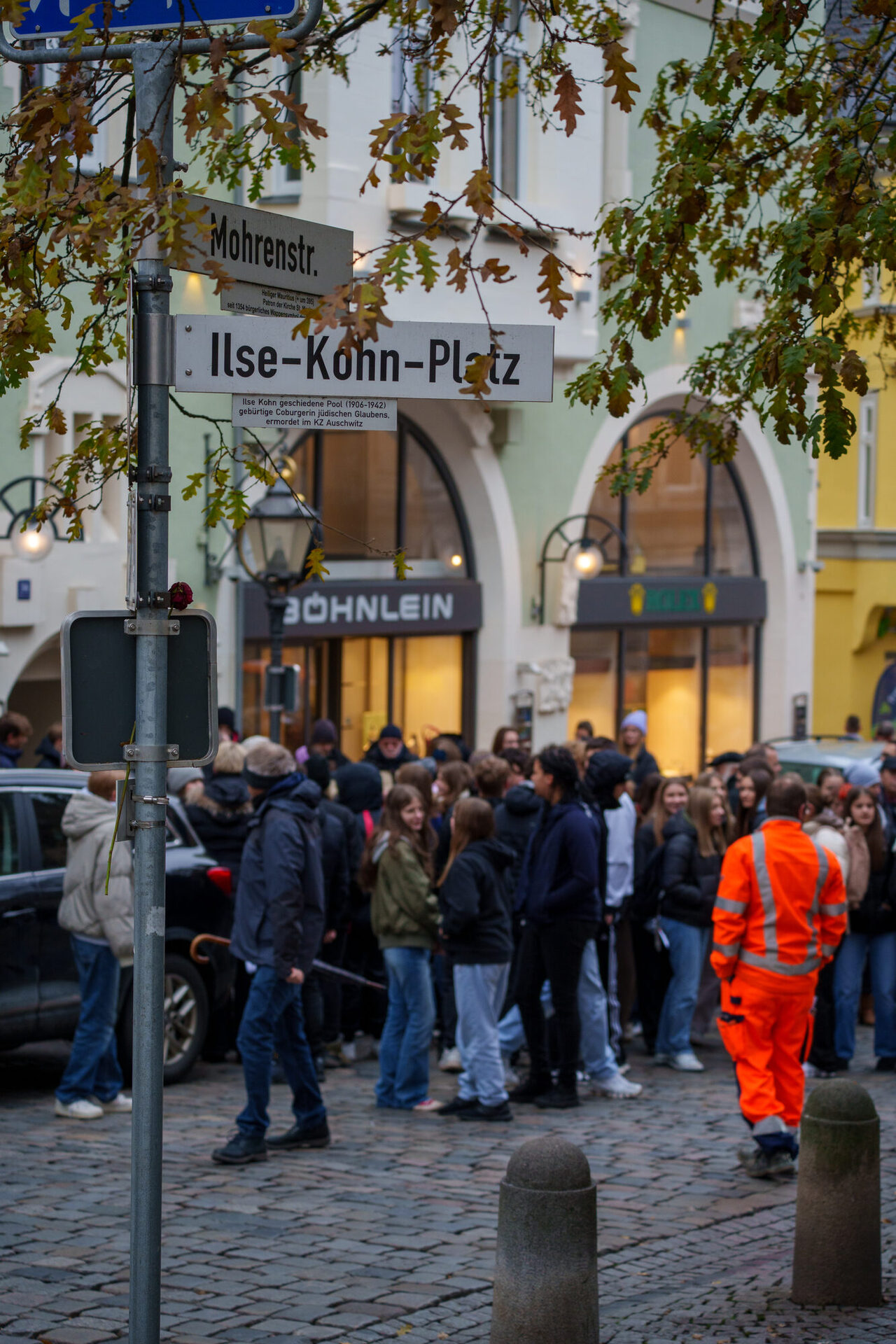 Der Stein von Ilse Kohn wurde gemeinsam mit den Steinen von Siegfried und Hermine Kohn an ihren letzten freiwilligen Wohnort vor dem Haus Mohrenstraße 36 verlegt, direkt am nach ihr benannten Ilse-Kohn-Platz. Dort hatten die Kohns zur NS-Zeit auch ein Tuch- und Modewarengeschäft. Schüler*innen des Casimirianums haben die Geschichte der Kohns recherchiert und bei der Verlegung vorgetragen.