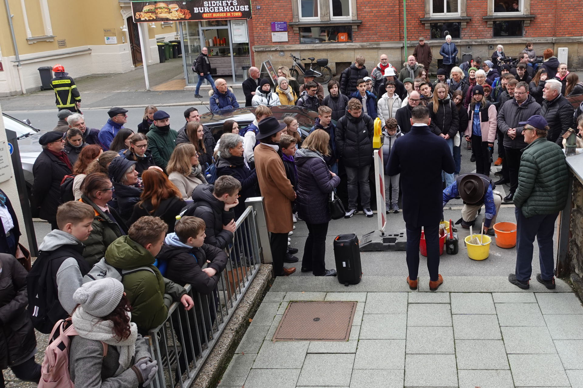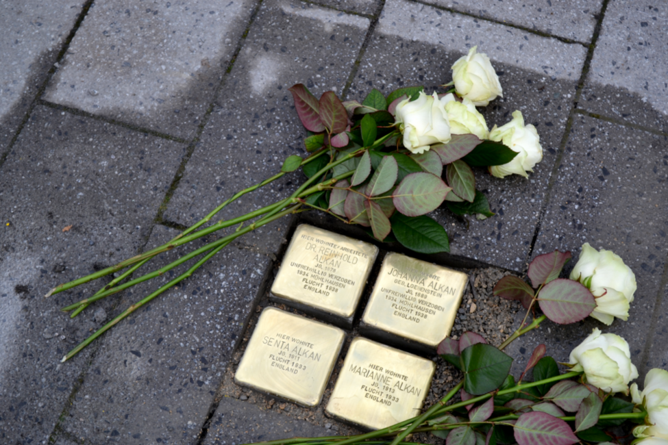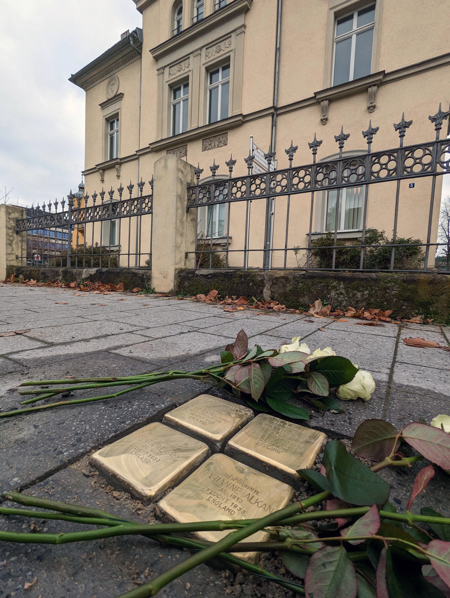 Viele Coburger*innen hatten sich vor der Lossaustraße 5 gegenüber von Bahnhof und ZOB eingefunden, um an das Schicksal der Familie Alkan zu erinnern. Jonathan Isserlins Mutter Senta hatte hier bis 1933 gewohnt. Ihre Eltern wurden im folgenden Jahr zu einem Umzug nach Mühlhausen gezwungen, 1938 flohen sie nach England. Die Rede von Jonathan Isserlin stellen wir Ihnen in den kommenden Tagen in einer Übersetzung hier zur Verfügung. Nachdem Initiator Gunter Demnig die Stolpersteine für Dr. Reinhold Alkan, Johanna Alkan, Senta Alkan und Marianne Alkan verlegt hatte, wurde ein Klavierstück von Chopin abgespielt. Ein Stück, das Reinhold Alkan, der nicht nur Augenarzt, sondern auch Konzertpianist gewesen war, oft gespielt hatte.