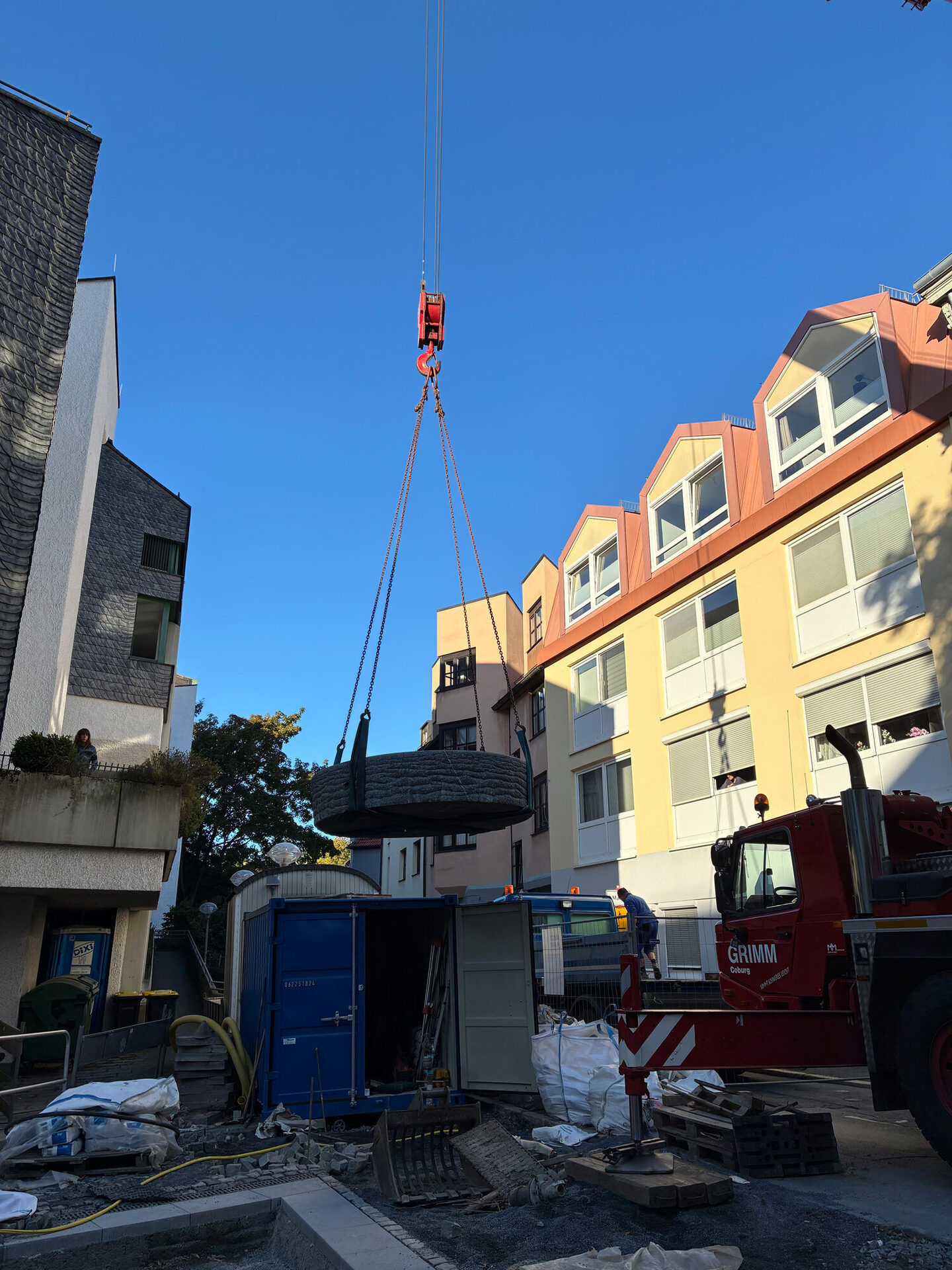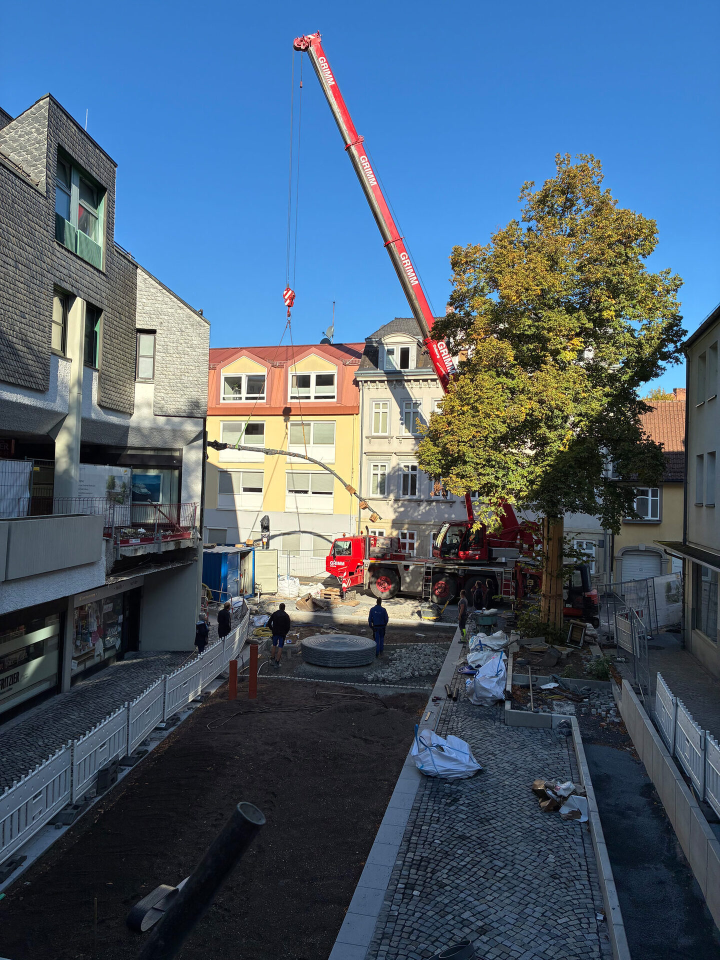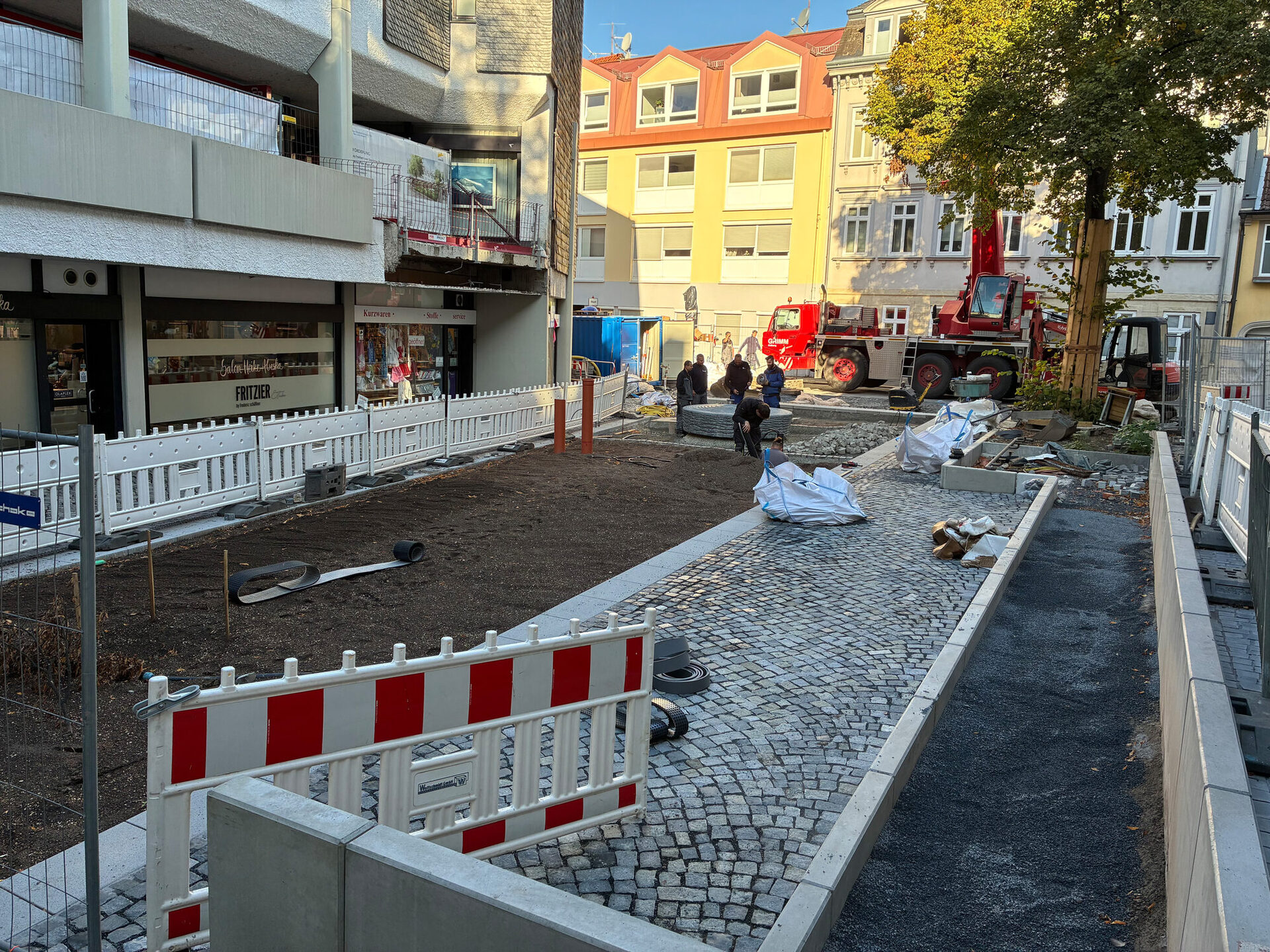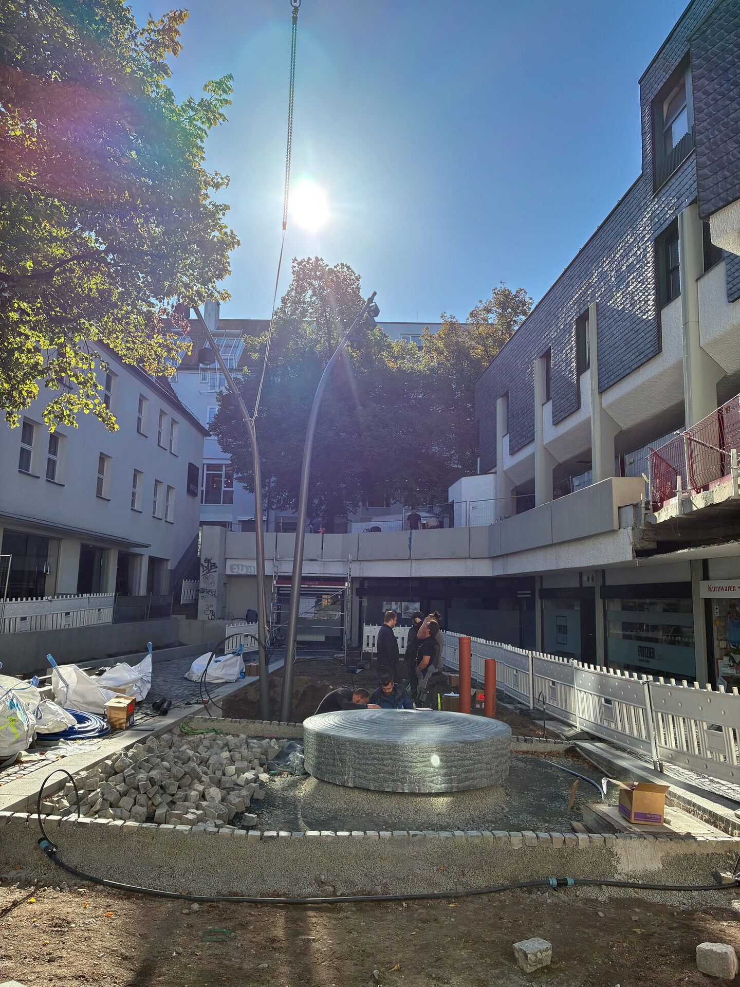 Lampen von den beiden Lichtstelen werden künftig den Platz bei Dunkelheit beleuchten. Bei einem abendlichen Termin werden sie genau auf den Platz ausgerichtet. Auch der Brunnen wurde aufbereitet und ist auf den Platz zurück gekehrt. Er wird von einer neuen Pflasterfläche eingerahmt. Nach dem Abschluss der Restarbeiten können im nächsten Schritt die Stauden gepflanzt werden.