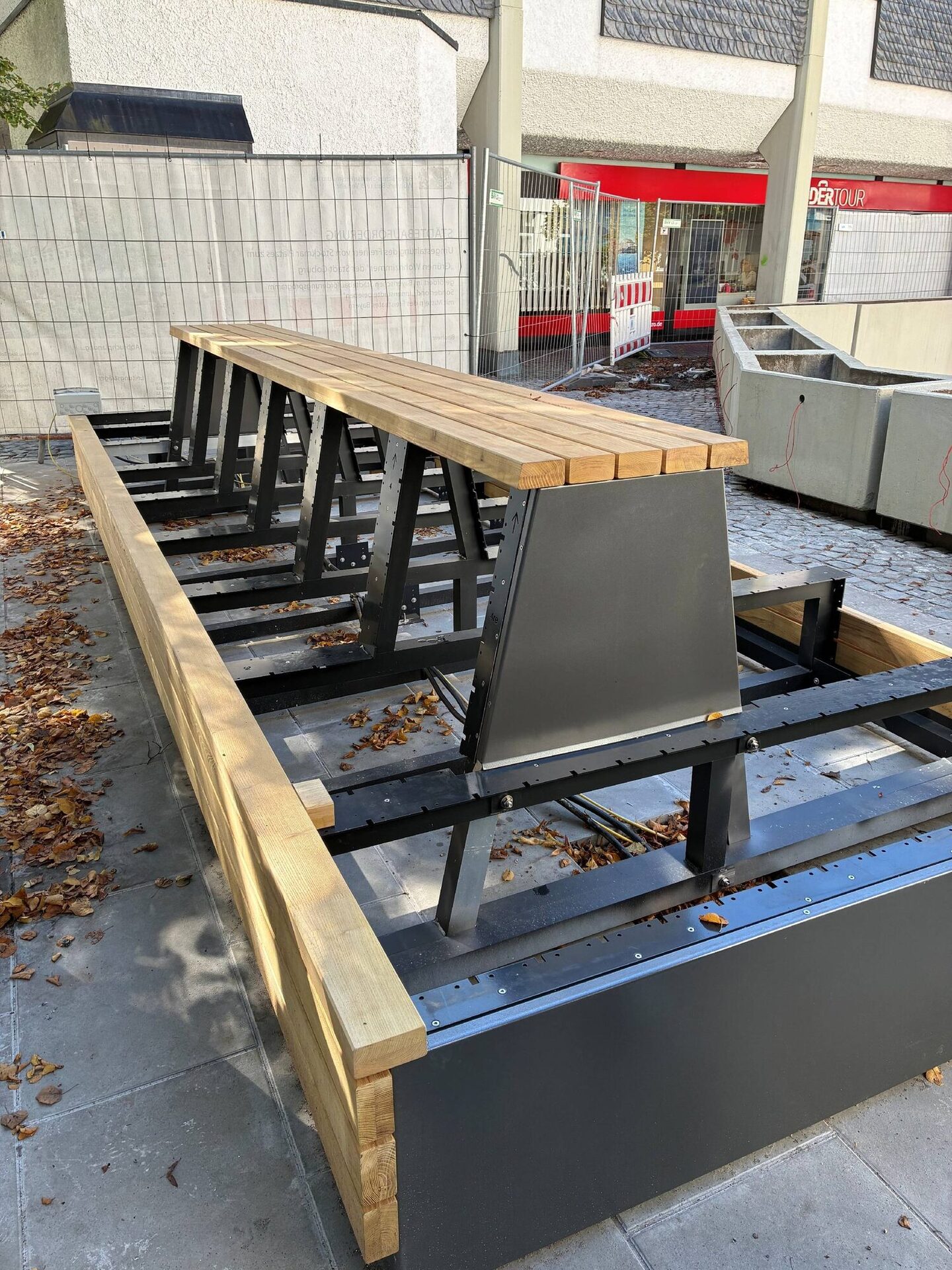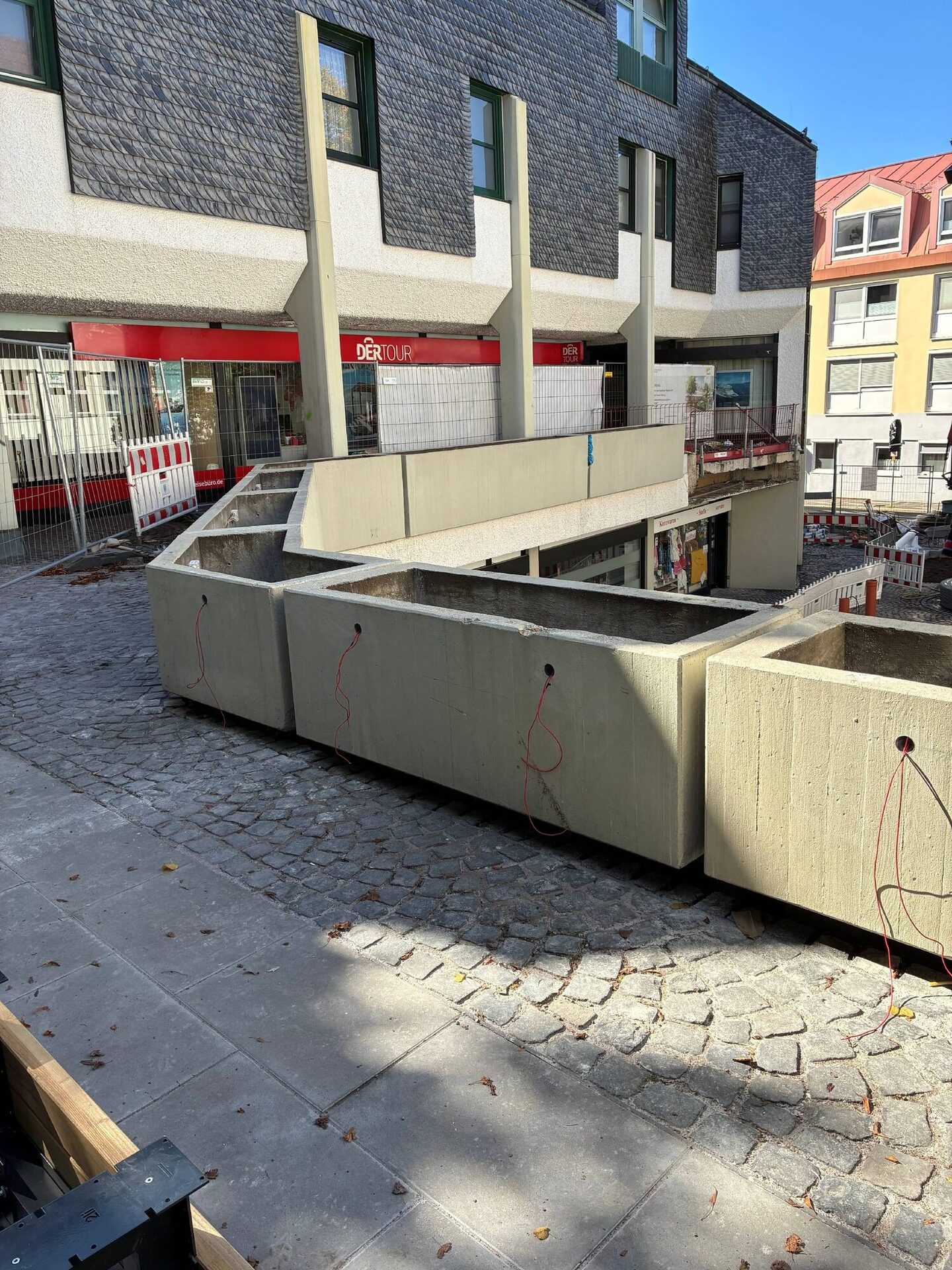 Die Pflanztröge oberhalb des Platzes wurden gereinigt und die ersten Elektroarbeiten für die Beleuchtung sind durchgeführt. Sind die Arbeiten abgeschlossen, werden die Tröge mit entsprechendem Substrat gefüllt und mit Stauden bepflanzt.