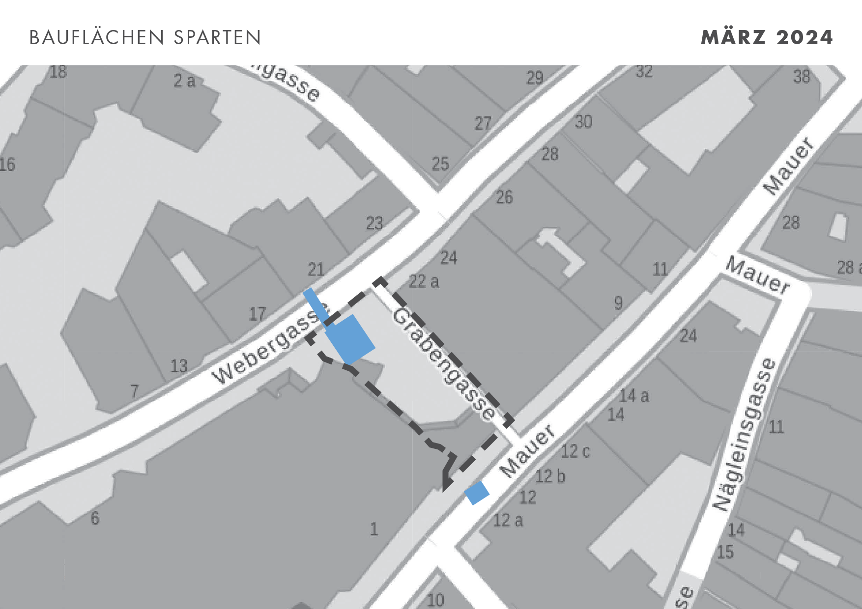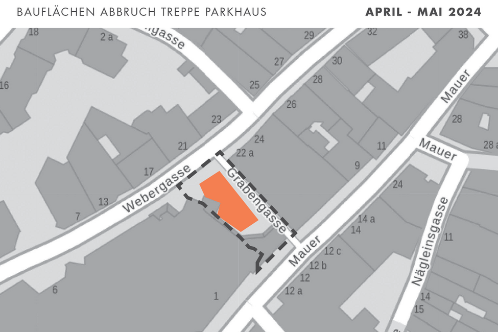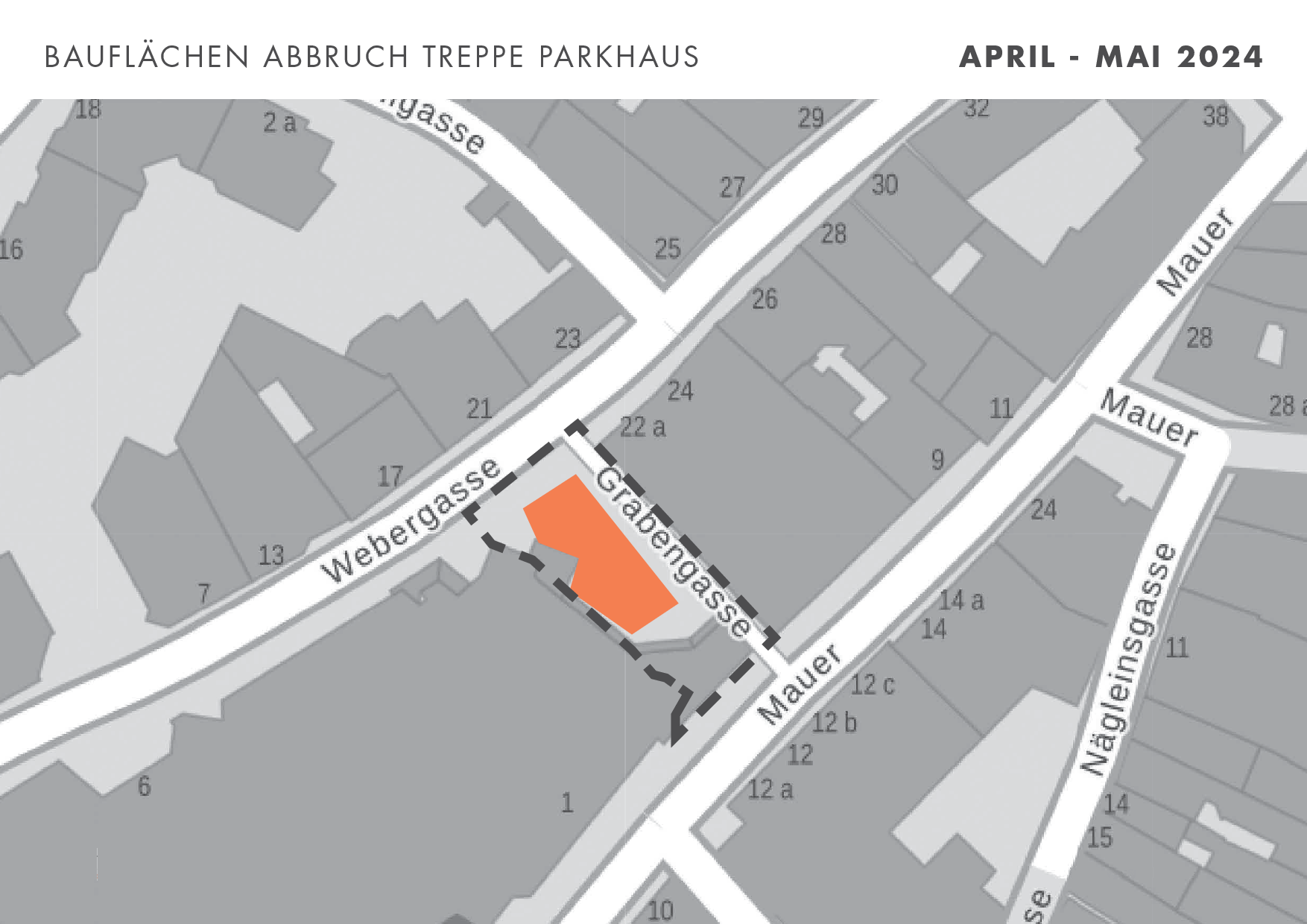 Die bestehende Treppe des angrenzenden Parkhauses, sowie Teile des Balkons, werden im Zuge einer Vorabmaßnahme zurückgebaut. So entsteht eine maximal offene Platzfläche, die Blickbeziehung zum Freiherr von Stockmar Haus an der Webergasse wird freigeräumt und betont.