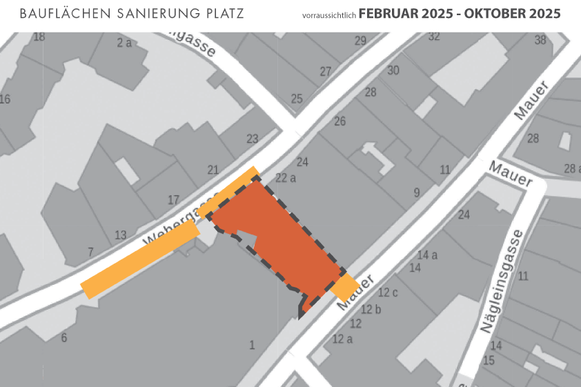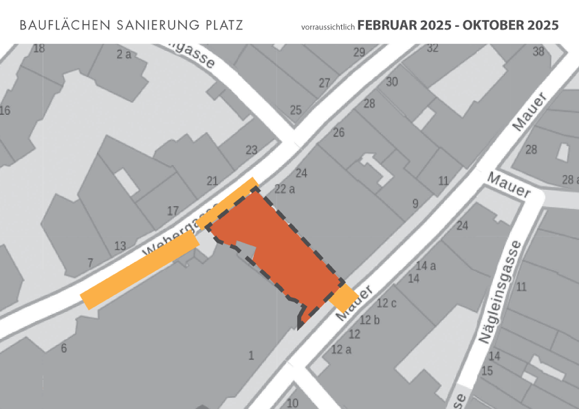 Die Umgestaltung des Freiherr-von-Stockmar-Platzes wird in drei Bauphasen erfolgen. Eine Straßensperrung der Webergasse ist voraussichtlich nur in der ersten Bauphase, im März 2024, für wenige Tage nötig.