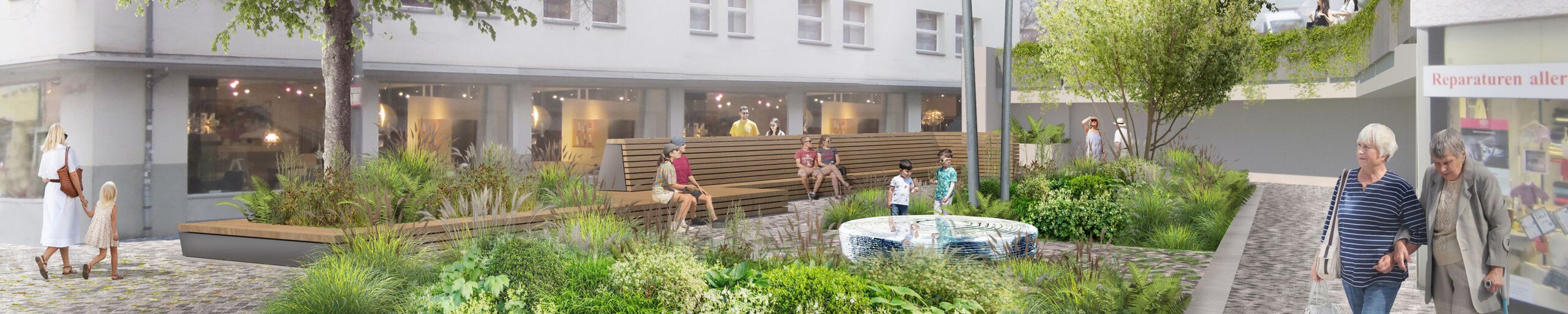 In der Mitte des Platzes wird als grüne Intarsie eine üppige Staudenpflanzung als eleganter Dschungel, sowie ein Solitärbaum vorgesehen. Durch diese Pflanzfläche wird etwa ein Drittel der Platzfläche entsiegelt und begrünt. So entsteht an Hitzetagen durch die Verdunstungskühle ein günstigeres Kleinklima.