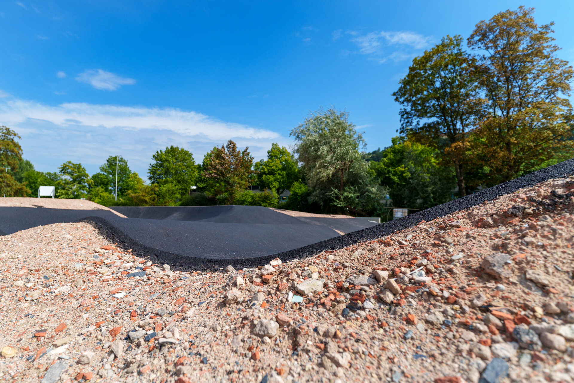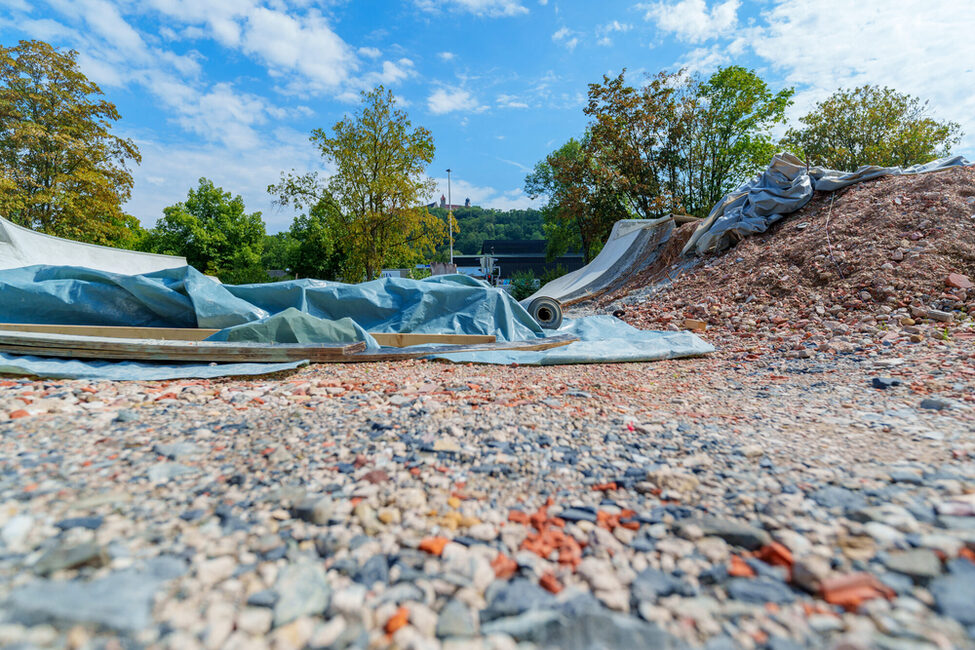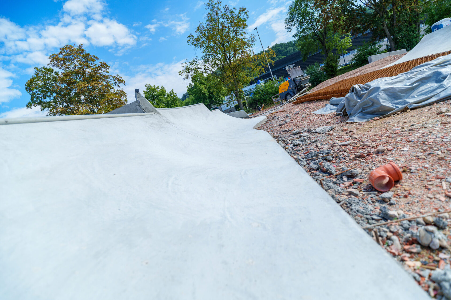 Zwei Spezialfirmen haben den Skatebereich und den Pumptrack fertig geformt. Wenn die Sommerpause Ende August beendet ist, rückt der Landschaftsbau an. Dann wird nicht nur die Erde verschwinden. Diese Firma wird auch das Basketballfeld errichten und den Platz für die Parcourhindernisse vorbereiten.