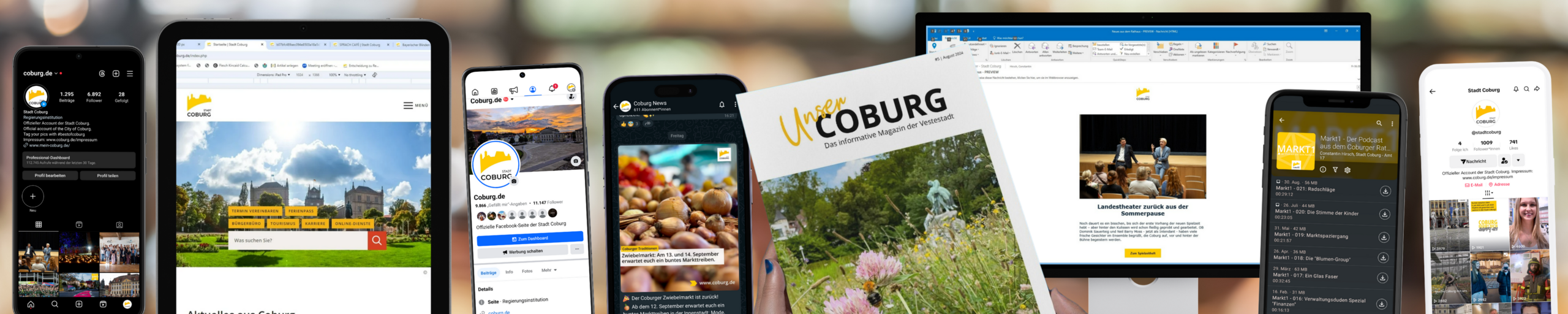„Mein Coburg“ ist auch der Name unseres E-Mail-Newsletter. Damit bekommen Sie mindestens alle 14 Tage, die wichtigsten Nachrichten aus der Stadt direkt auf Ihren Computer oder das Smartphone. In Sozialen Netzwerken (Facebook (Öffnet in einem neuen Tab), Instagram (Öffnet in einem neuen Tab)) finden Sie uns unter coburg.de. Hier versorgen wir Sie nicht nur mit aktuellen Informationen aus der Stadtverwaltung, sondern gewähren auch mal einen Blick hinter die Rathaustüren.