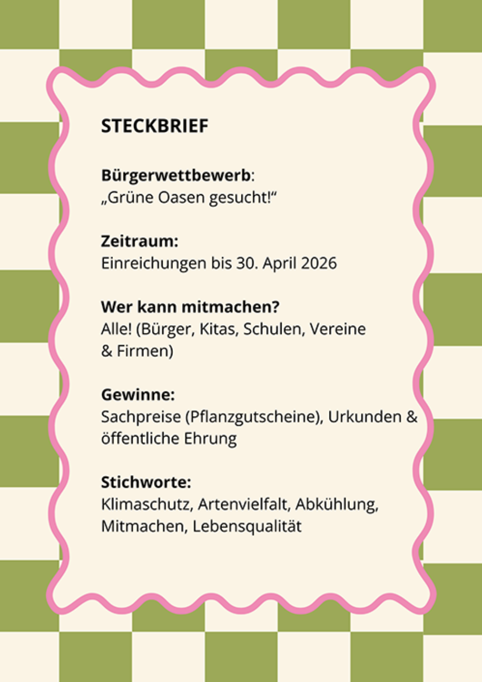 Viele engagierte Bürgerinnen und Bürger gehen bereits mit gutem Beispiel voran. Dieses Engagement verdient Sichtbarkeit! Deshalb sucht die Stadt eure grünen Projekte – um sie auszuzeichnen, sichtbar zu machen und andere zum Mitmachen zu inspirieren.
