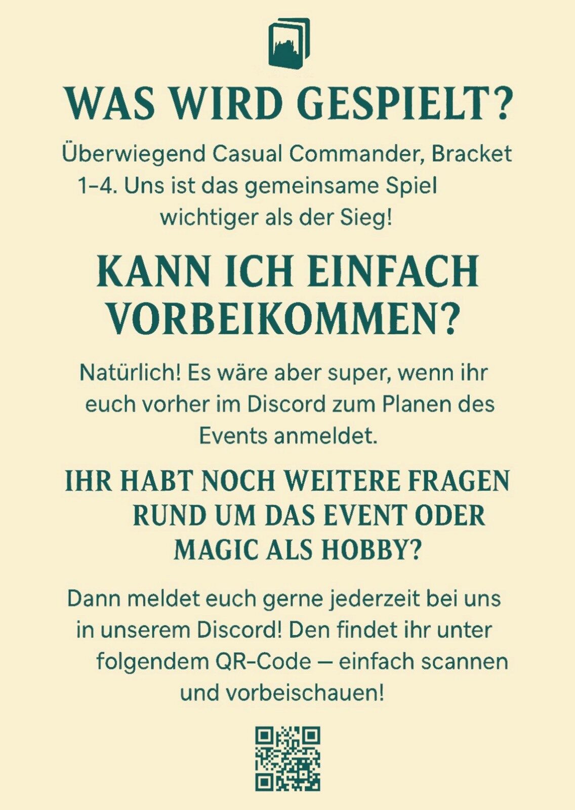- Vorwort: Dieses FAQ soll einen kompakten Überblick über unsere Community, unsere Spielabende und die wichtigsten organisatorischen Rahmenbedingungen geben. Uns ist wichtig, eine offene, freundliche und respektvolle Umgebung für alle Magic: The Gathering‑Begeisterten zu schaffen – unabhängig von Erfahrung, Spielstärke oder vorhandener Ausstattung. Wenn darüber hinaus noch Fragen offenbleiben, sprecht uns jederzeit gerne persönlich an.