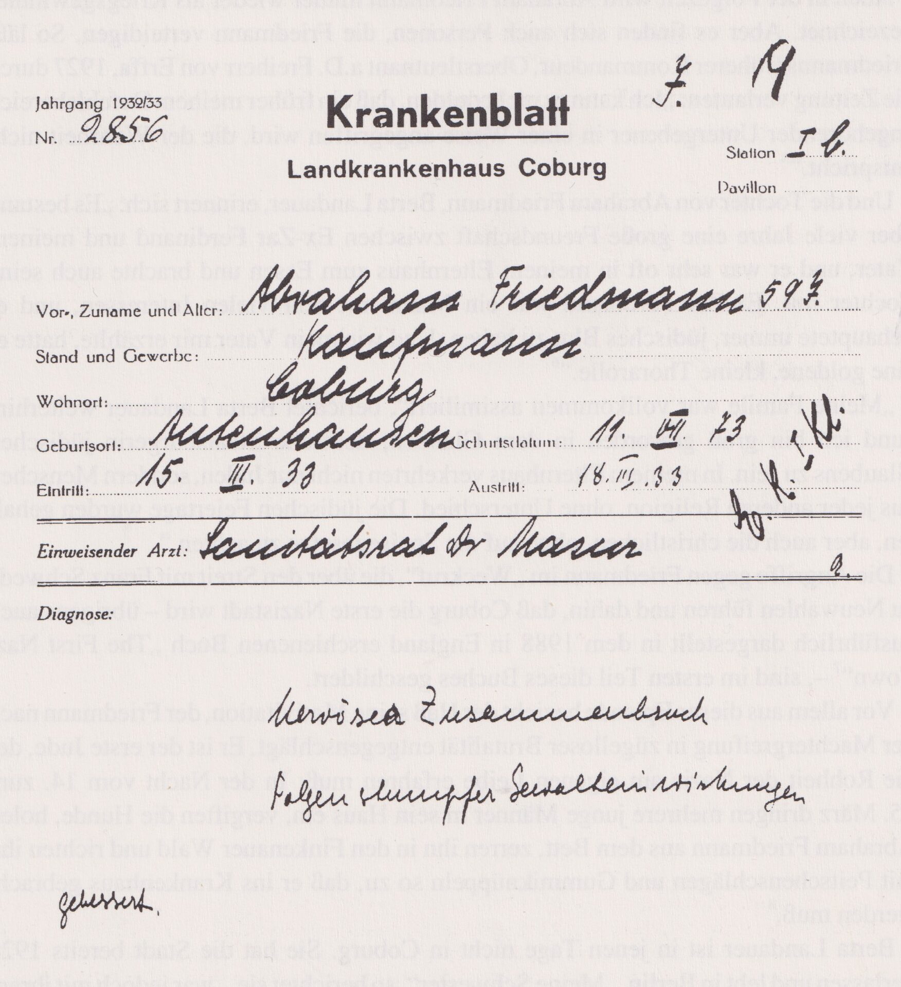 השמועה, לפיה פרידמן מימן מפגינים נגדיים מהאגף השמאלי במשך "היום הגרמני השלישי" בקובורג, אירוע מרכזי שאורגן על ידי כוחות הימין, הפכה אותו לאויב המפלגה הנאצית בשנת 1922. הדבר הוביל לעימות נרחב עם מנהיג המפלגה הנאצית של קובורג, פרנץ שוודה. הסכסוך הסלים בשנת 1929 כאשר, ביוזמתו של פרידמן, שוודה איבד את עבודתו בעירייה. לאחר עליית היטלר לשלטון, המפלגה הנאצית נקמה את נקמתה. במרץ 1933, חברי פלוגות הסער פרצו לביתו של פרידמן, חטפו ותקפו אותו. זמן קצר לאחר מכן, הוא נמלט מקובורג. חברת גרוסמן גם פיטרה אותו מתפקידו, והותירה אותו ללא מקור הכנסה. הוא לא היה מסוגל לשלם את המשכנתא על ביתו והווילה נמכרה במכירה פומבית בשנת 1935. תהליך זה, המכונה "אריאניזציה", גרם גם לכל היהודים האחרים לאבד את רכושם ב1941 אם לא נאלצו למכור אותו כבר לפני כן. אברהם פרידמן נפטר בפריז בשנת 1938.