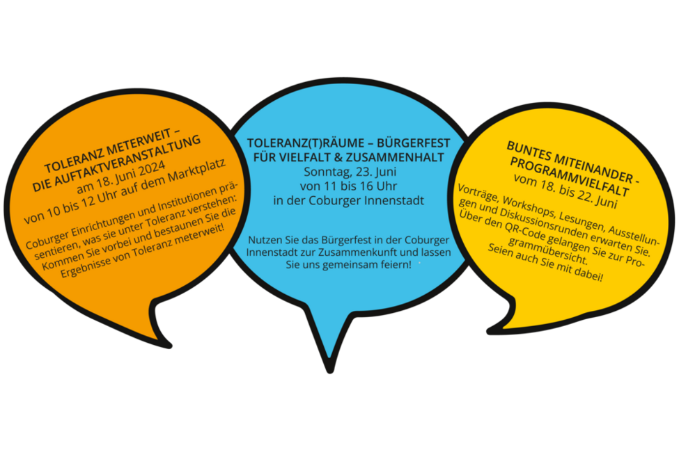 Die Veranstaltungsreihe lädt alle Bürgerinnen und Bürger ein, Toleranz aktiv zu (er)leben. In einer Zeit, in der gesellschaftliche Spannungen zunehmen, schafft die Veranstaltungsreihe Räume, in der Vielfalt gefeiert und Perspektiven erweitert werden. Sie erwartet ein abwechslungsreiches Programm, das neben einer Auftaktveranstaltung und einem abschließenden Bürgerfest auf dem Coburger Marktplatz auch Ausstellungen, Diskussionsrunden, Workshops, kulturelle Angebote und interaktive Formate umfasst.