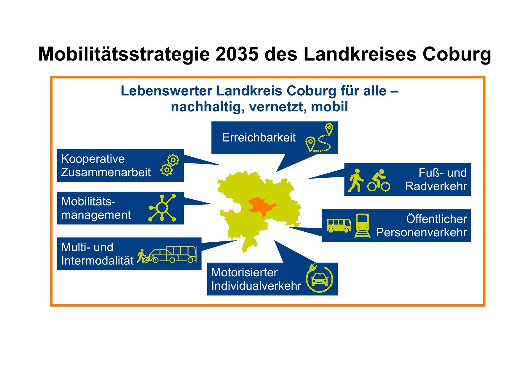Die Mobilitätsstrategie für den Landkreis Coburg setzt sich aus einem Oberziel („Lebenswerter Landkreis Coburg für alle - nachhaltig, vernetzt, mobil"), sieben Handlungsfeldern und neun Leitsätzen zusammen: