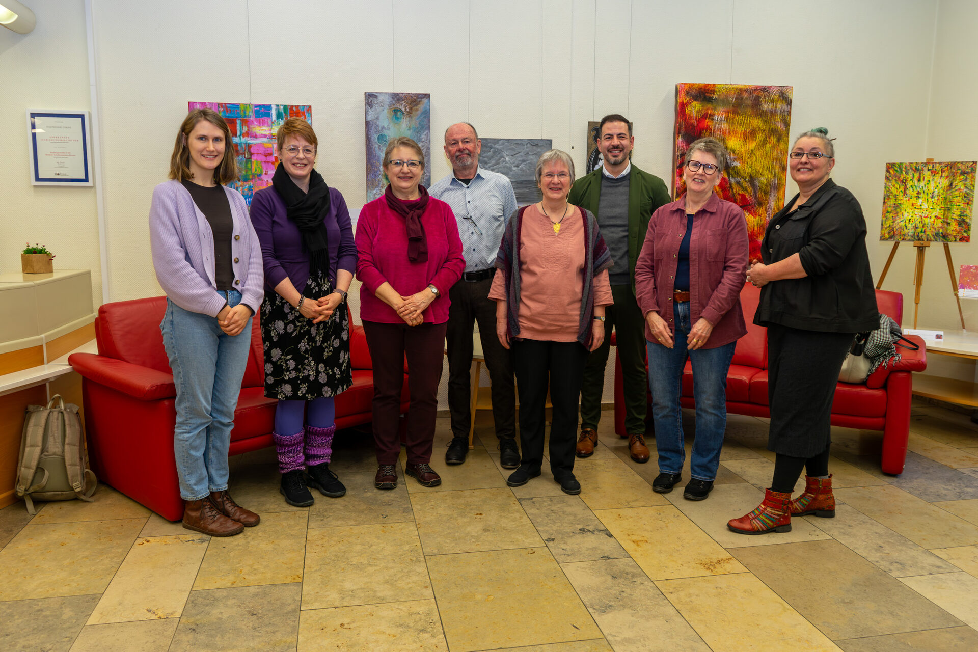 Bis zum 11. April können die Besucher*innen der Stadtbücherei selbst diese Kreativität erleben. Wirklich alles ist dabei: Leinwände in den unterschiedlichsten Formaten, bearbeitet mit Öl, Acryl und Aquarell, in Rakel-Technik, Abklebe-Technik und Spritz-Technik. Zwischen farbenfrohen Exponaten beeidrucken Schwarz-Weiß-Kreationen und filigrane Zeichnungen. Manche nutzen als Werkzeug den Föhn, andere arbeiten mit dem Gartenschlauch. Kunst, so sind sich alle Anwesenden einig, mache nicht nur den Kopf frei, sondern verbinde die unterschiedlichsten Menschen. Die Stadtverwaltung "malt" aber nicht nur. Karin Engelhardt bereichert die Ausstellung als Kunsthandwerkerin mit unterschiedlichsten Lederarbeiten.