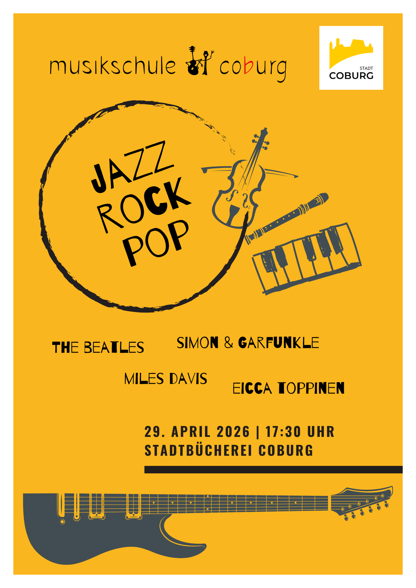 29.04.2026Jazz - Rock - PopKonzert der Musikschule Coburg e.V., um 17:30 Uhr - Eintritt frei! Jazz - Rock - Pop: Konzert der Musikschule Coburg e.V.Platzreservierung unter stadtbuechereicoburg@de oder 09561/89-1421