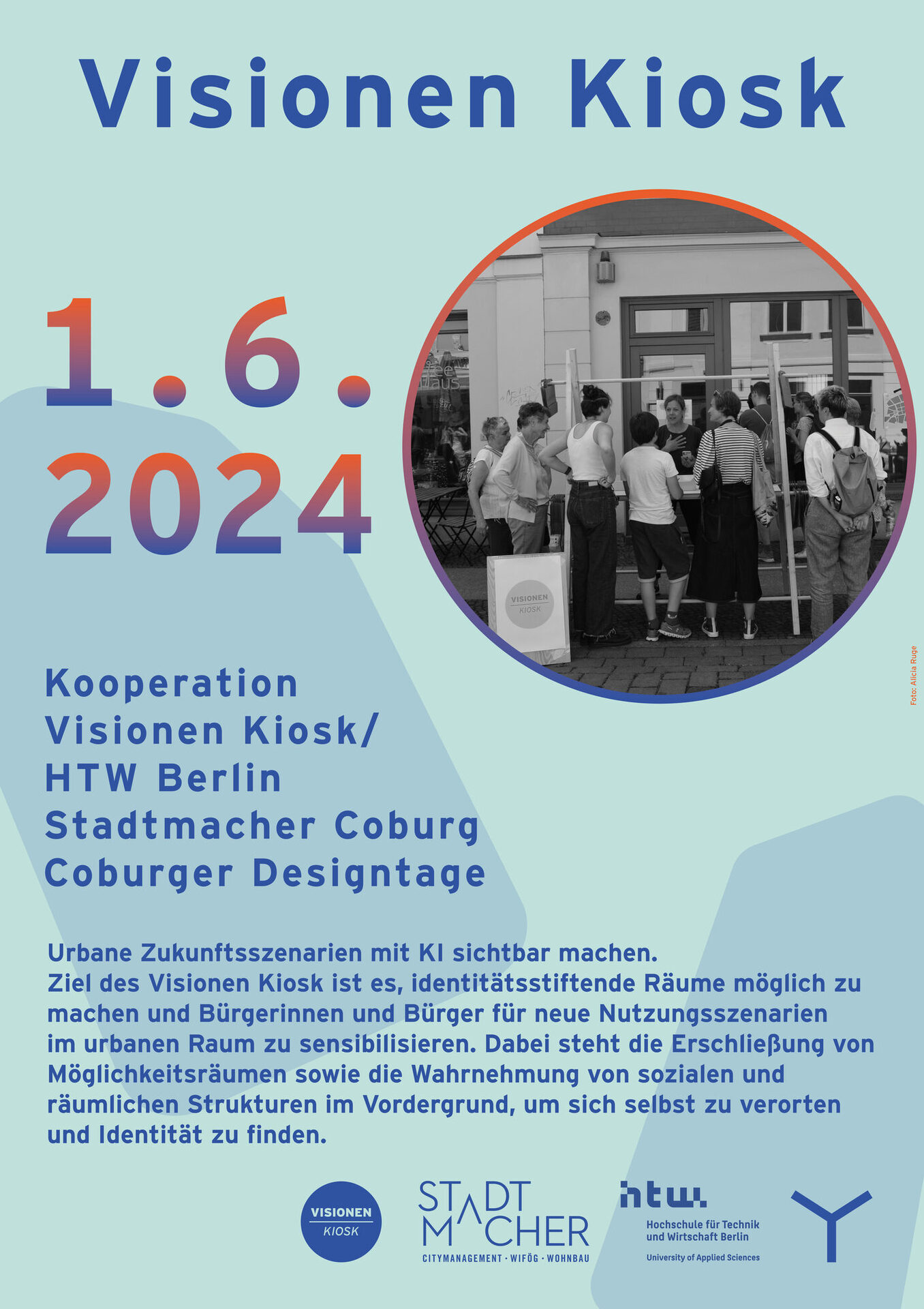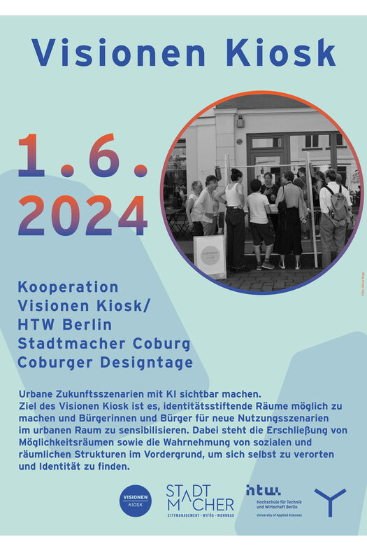 Der Visionen Kiosk wird getreu des Mottos der 36. Coburger Designtage realisiert: in Co-Creation! Durch die Kooperation der Stadtmacher und der Masterabsolventin Nathalie Sterzenbach, aus dem Bereich Systemdesign der HTW Berlin, entsteht mit dem Visionen Kiosk ein Ort für Dialog und Resonanz. Für ihre Abschlussarbeit hat die Masterstudentin das KI-basierte Konzept entwickelt und in Potsdam durchgeführt. Eine Neuauflage wird es jetzt in Coburg geben.