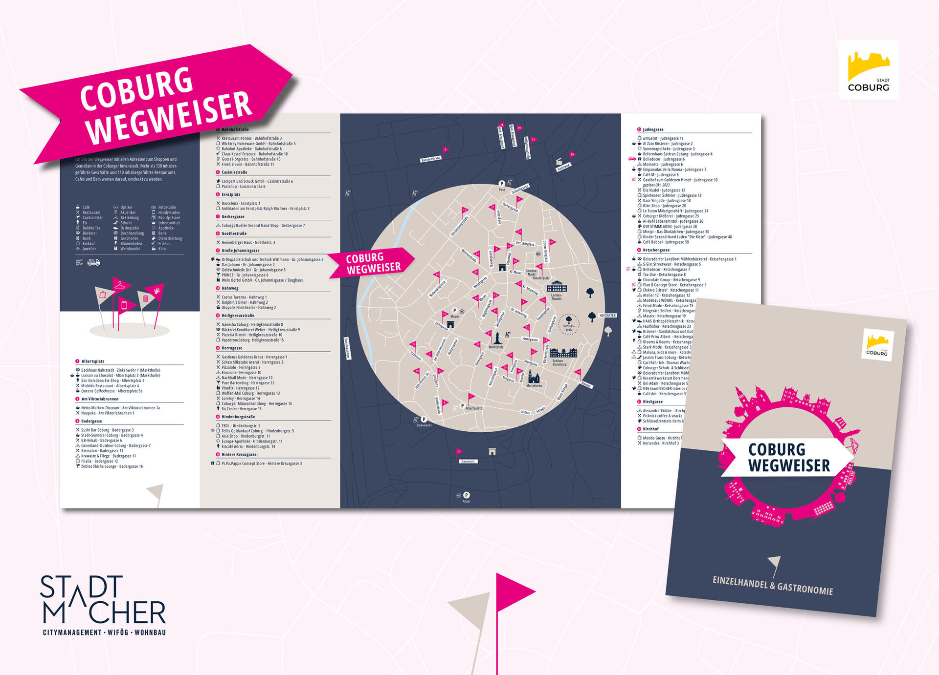 Im Zuge der derzeit laufenden Imagekampagne für die Coburger Innenstadtakteure mit dem Titel „GESICHTER DEINER INNENSTADT!“ haben die Stadtmacher innerhalb der Reihe des COBURG WEGWEISERS nun einen weiteren Guide aufgelegt und zwar mit allen Adressen zum Shoppen und Genießen mit dem Titel COBURG WEGWEISER – Einzelhandel & Gastronomie.