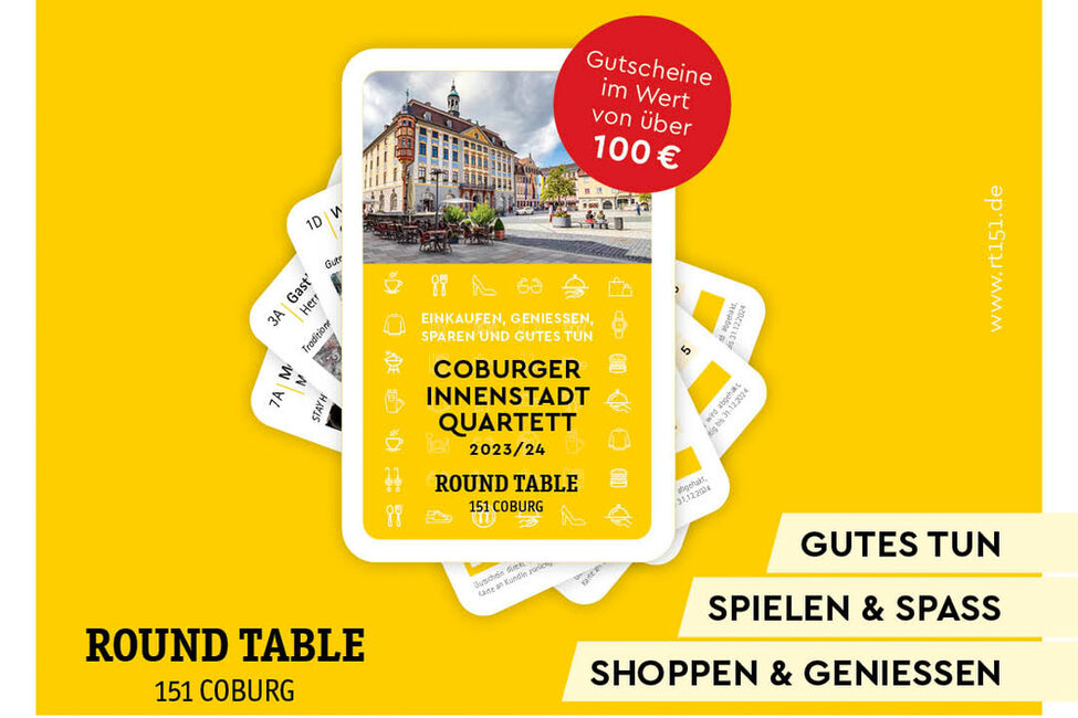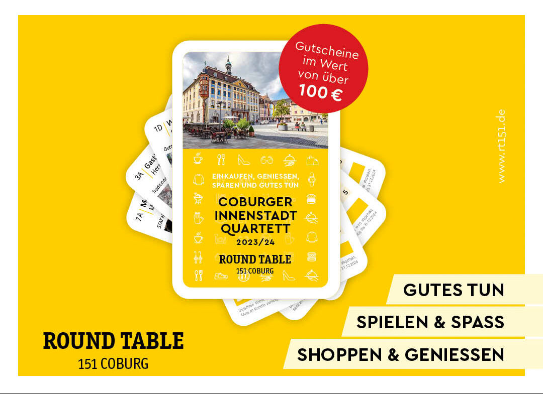 Mit dem Kauf eines Quartetts etwas Gutes tut? Round Table 151 Coburg arbeitet ehrenamtlich und Dank der freundlichen Unterstützung von uns, den Stadtmachern Coburg und Zentrum Coburg e.V. konnten die Produktionskosten im Vorfeld vollständig gedeckt werden, so dass der gesamte Erlös des Quartetts gespendet werden kann!