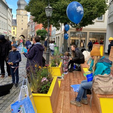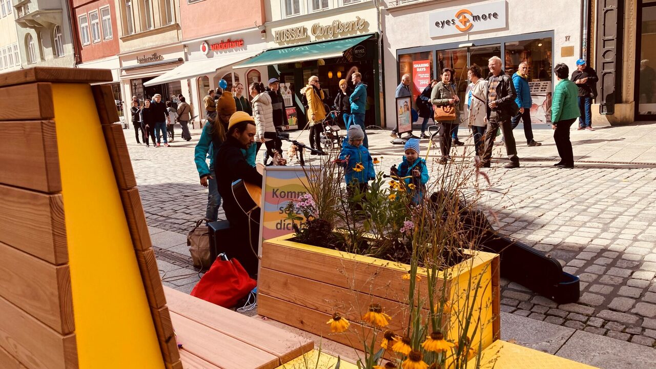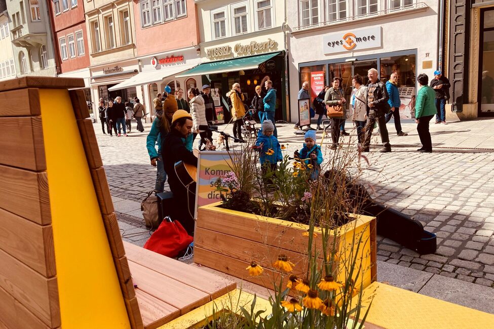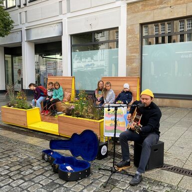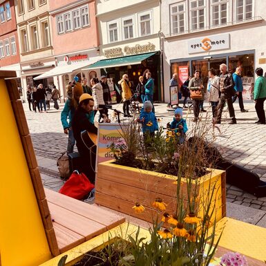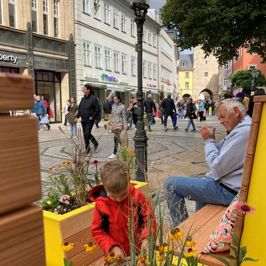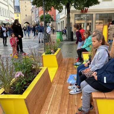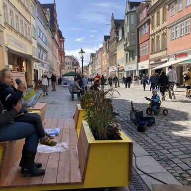 Bereits im Lockdown 2021, als es nur noch To-Go Angebote gab und Abstandhalten das Gebot der Stunde war, hat die Projektgruppe Stadtmacher mit Sitzinseln aus Palletten den Nerv der Zeit getroffen: diese luden in der Innenstadt zum Verweilen ein und wurden sehr gut angenommen. Sie waren aber nicht für die Dauer konzipiert. Kleinere Sitzgruppen aus Holz folgten als Ersatz und wandern nun weiter in die Ketschengasse und Herrngasse. Schnell war klar, dass der Bedarf an modernem Mobiliar da ist, welches in der Innenstadt an unterschiedlichen Orten flexibel zum Einsatz kommen kann. Die beiden neuen Sitzmodule „Draufgesetzt“ und „Ausgeparkt“ sollen den öffentlichen Raum lebenswerter, bunter, grüner und vielseitiger gestalten. Sie sind Ruhezonen und Treffpunkte zugleich. Für die Anschaffung wurden erfolgreich Fördermittel aus dem Sonderfonds „Innenstädte beleben“ im Bayerischen Städtebauförderungsprogramm eingeworben, mit der Stadtverwaltung mögliche Standorte diskutiert, potentielle Anbieter:innen recherchiert und schließlich das Stadtmobiliar ausgeschrieben und gekauft. Der Coburger Stadtrat hat in seiner Sitzung am 15.11.2021 einstimmig die nötigen Eigenmittel für diese Anschaffungen bereitgestellt.