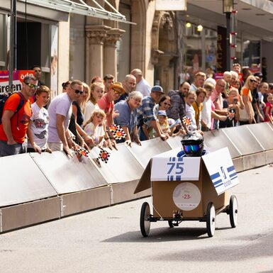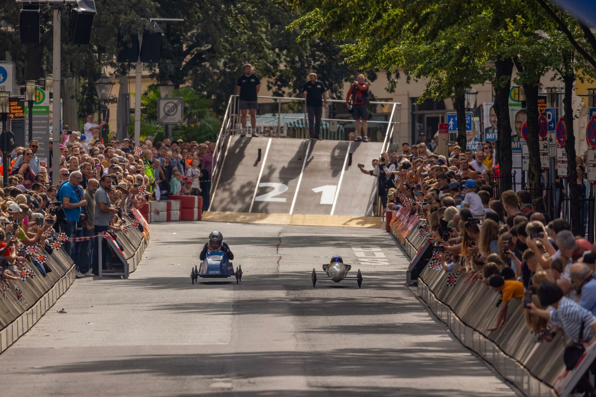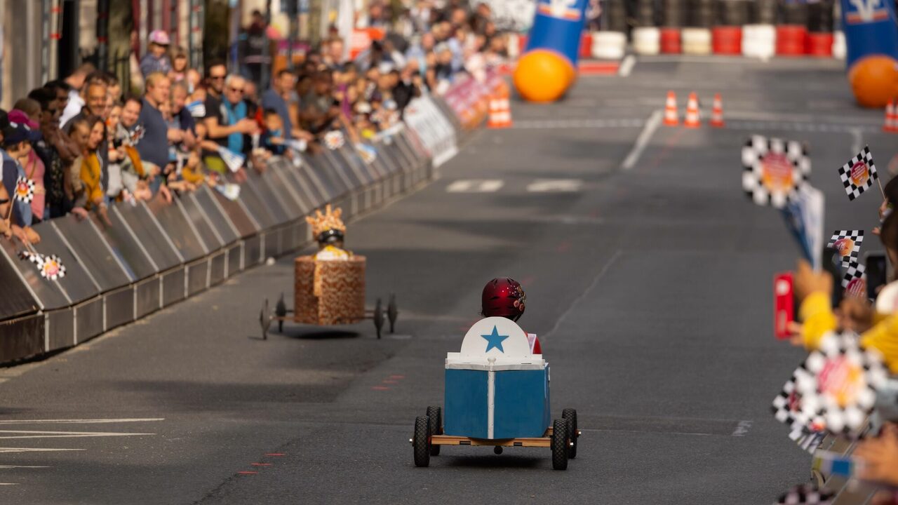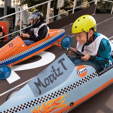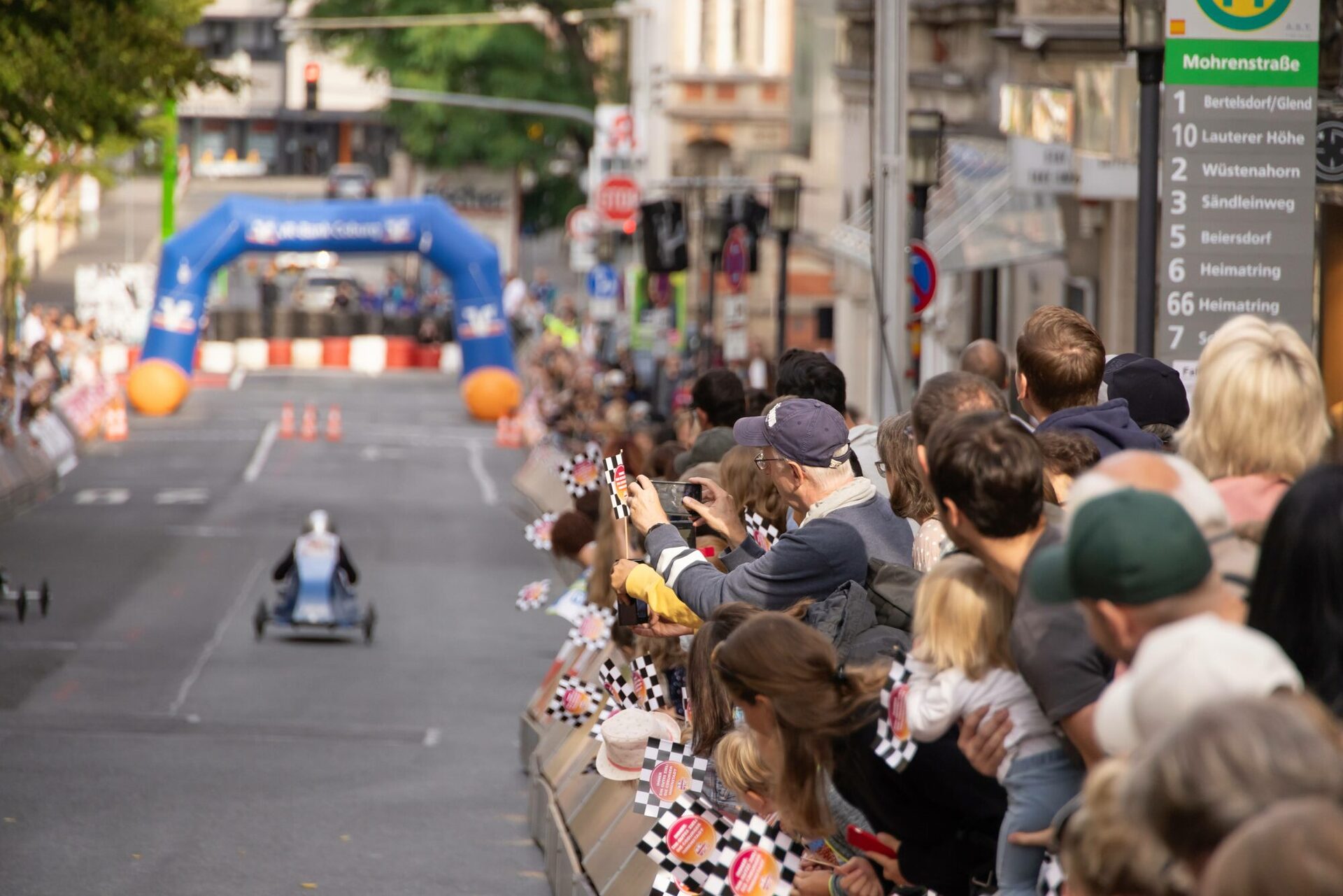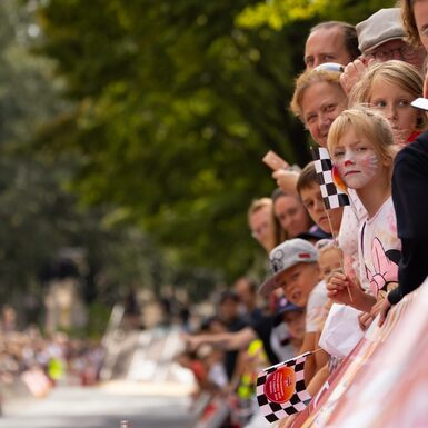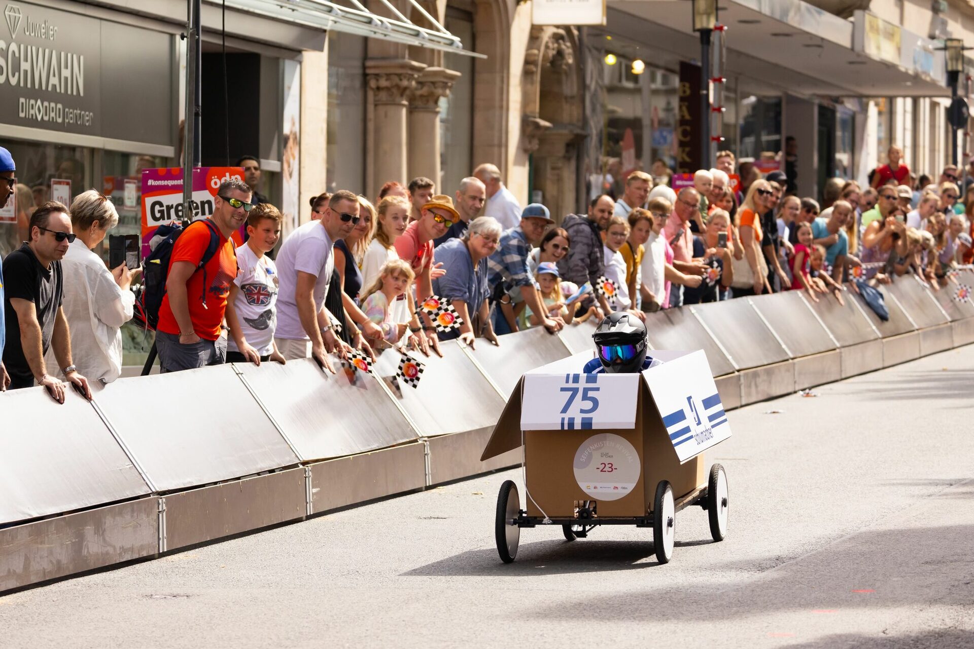 Als die ersten Kisten von der Rampe rollen, kocht die Stimmung unter den Zuschauern. Hinter den Banden haben sich hunderte Menschen versammelt, um die selbstgebauten Kisten und ihre mutigen Fahrerinnen und Fahrer zu bejubeln.