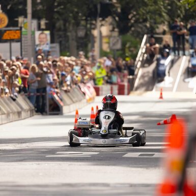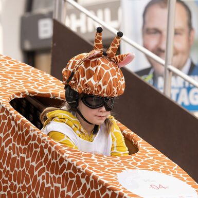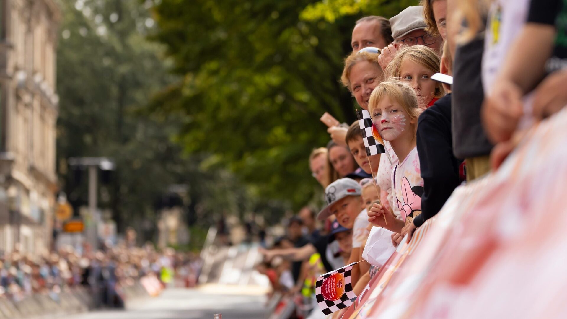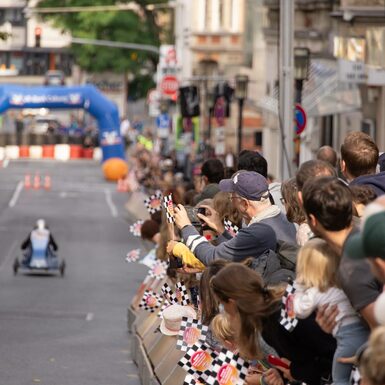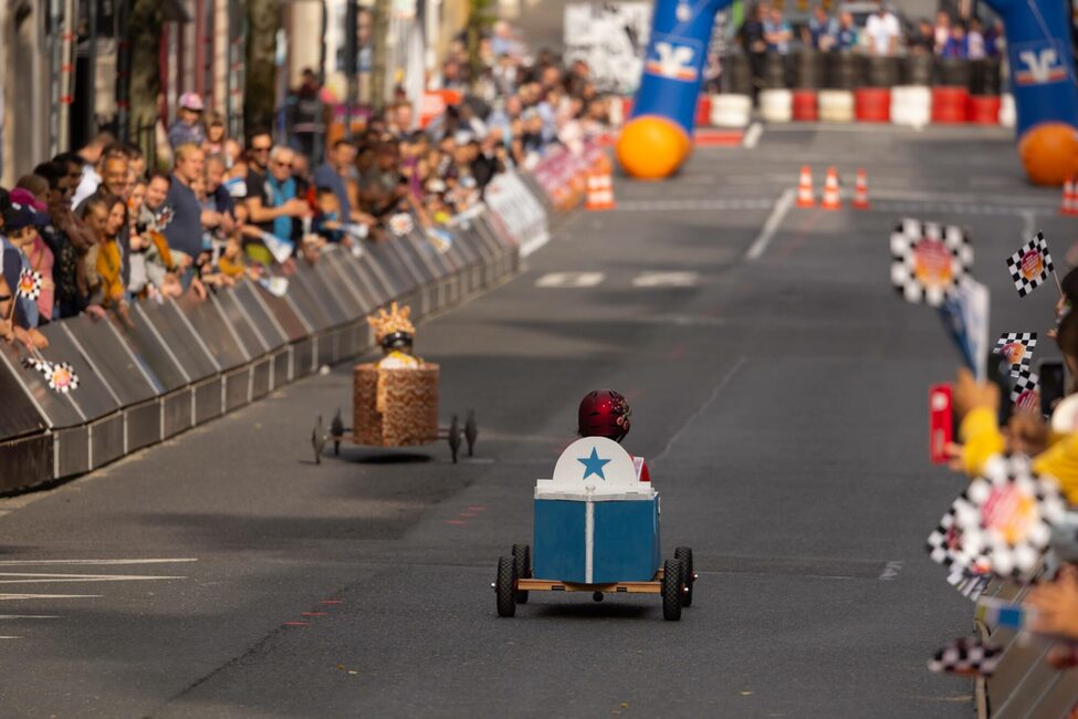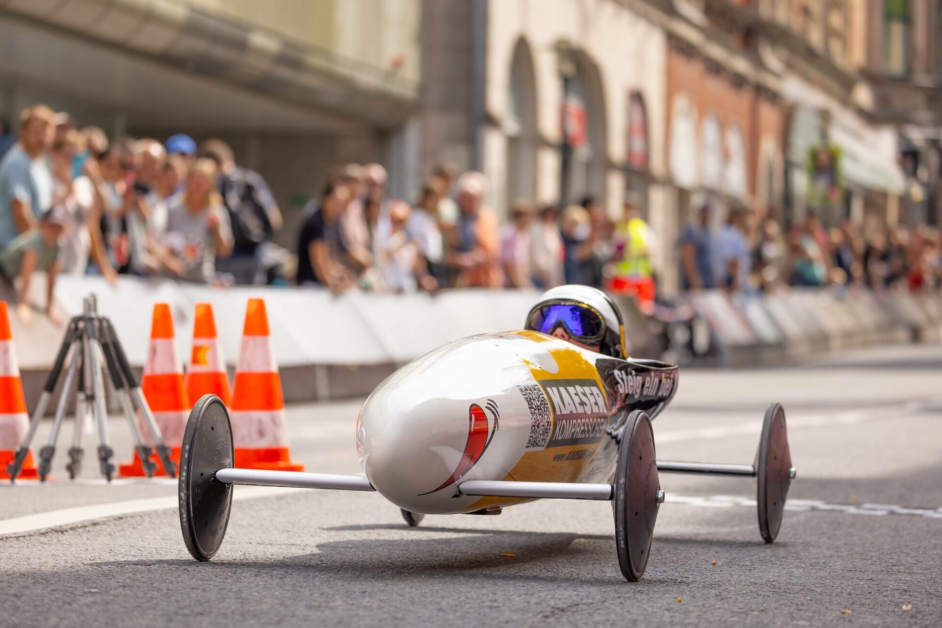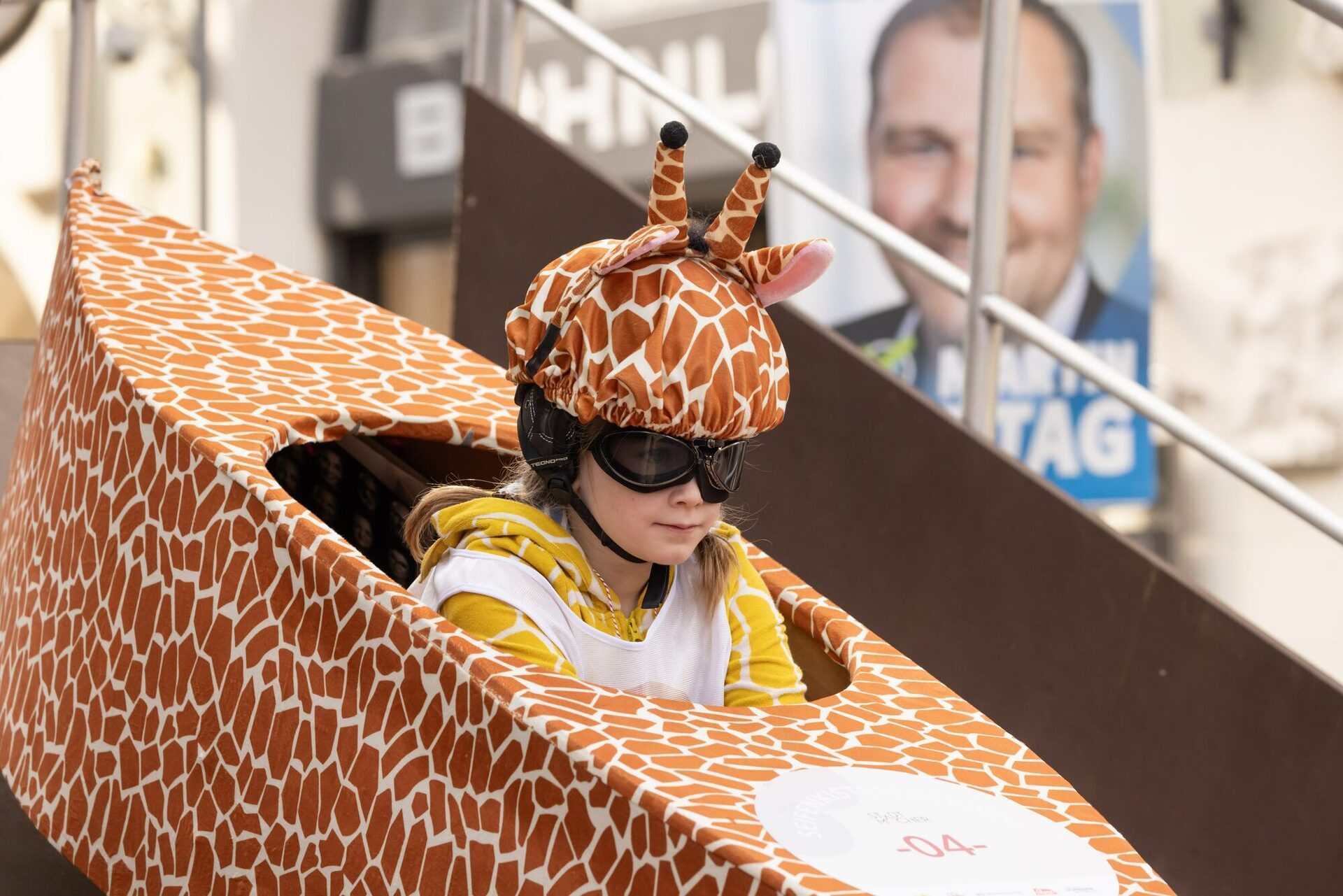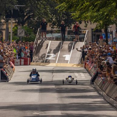 Als die ersten Kisten von der Rampe rollen, kocht die Stimmung unter den Zuschauern. Hinter den Banden haben sich hunderte Menschen versammelt, um die selbstgebauten Kisten und ihre mutigen Fahrerinnen und Fahrer zu bejubeln.