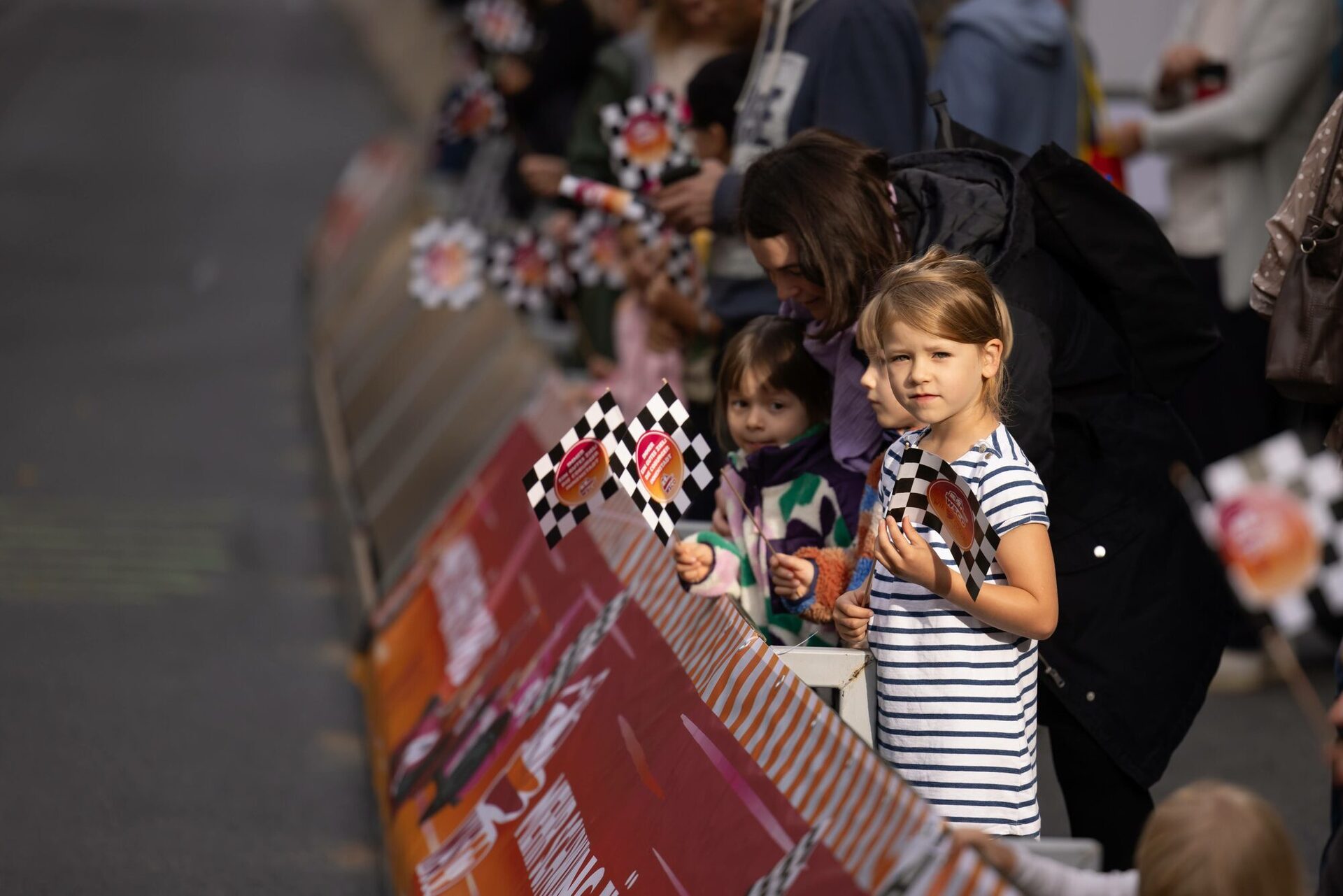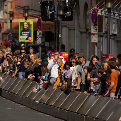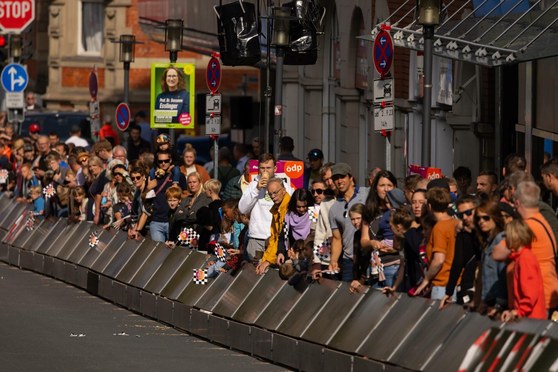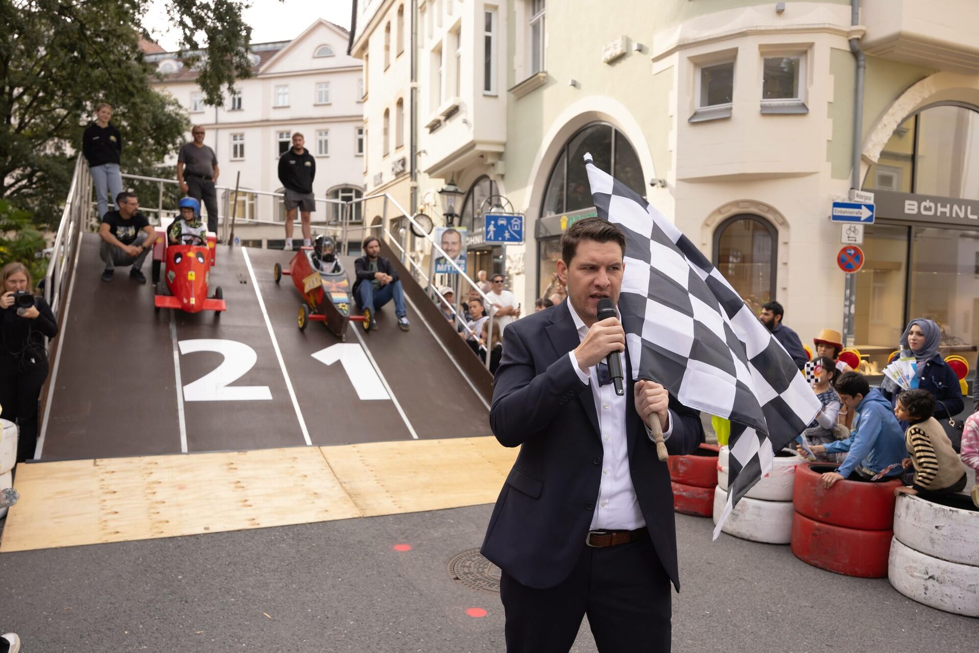 Oberbürgermeister Dominik Sauerteig freut sich, dass er endlich die Rennflagge schwenken darf und gibt mit etwas Verspätung die Rennstrecke offiziell frei.